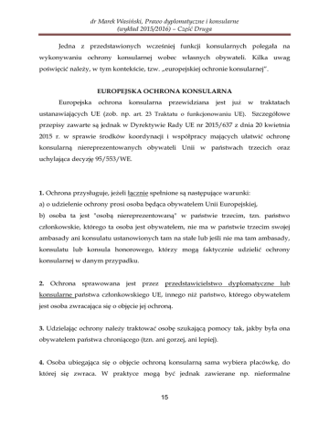 dr Marek Wasiński, Prawo dyplomatyczne i konsularne (wykład 2015/2016) – Część Druga Jedna z przedstawionych wcześniej funkcji konsularnych polegała na wykonywaniu ochrony konsularnej wobec własnych obywateli. Kilka uwag poświęcić należy, w tym kontekście, tzw. „europejskiej ochronie konsularnej”. EUROPEJSKA OCHRONA KONSULARNA Europejska ochrona konsularna przewidziana jest już w traktatach ustanawiających UE (zob. np. art. 23 Traktatu o funkcjonowaniu UE). Szczegółowe przepisy zawarte są jednak w Dyrektywie Rady UE nr 2015/637 z dnia 20 kwietnia 2015 r. w sprawie środków koordynacji i współpracy mających ułatwić ochronę konsularną niereprezentowanych obywateli Unii w państwach trzecich oraz uchylająca decyzję 95/553/WE. 1. Ochrona przysługuje, jeżeli łącznie spełnione są następujące warunki: a) o udzielenie ochrony prosi osoba będąca obywatelem Unii Europejskiej, b) osoba ta jest "osobą niereprezentowaną" w państwie trzecim, tzn. państwo członkowskie, którego ta osoba jest obywatelem, nie ma w państwie trzecim swojej ambasady ani konsulatu ustanowionych tam na stałe lub jeśli nie ma tam ambasady, konsulatu lub konsula honorowego, którzy mogą faktycznie udzielić ochrony konsularnej w danym przypadku. 2. Ochrona sprawowana jest przez przedstawicielstwo dyplomatyczne lub konsularne państwa członkowskiego UE, innego niż państwo, którego obywatelem jest osoba zwracająca się o objęcie jej ochroną. 3. Udzielając ochrony należy traktować osobę szukającą pomocy tak, jakby była ona obywatelem państwa chroniącego (tzn. ani gorzej, ani lepiej). 4. Osoba ubiegająca się o objęcie ochroną konsularną sama wybiera placówkę, do której się zwraca. W praktyce mogą być jednak zawierane np. nieformalne 15 dr Marek Wasiński, Prawo dyplomatyczne i konsularne (wykład 2015/2016) – Część Druga porozumienia określające właściwość personalną placówek państw unijnych w państwie trzecim. 5. Ochrona konsularna może obejmować, między innymi, pomoc w następujących sytuacjach: a) aresztowanie lub zatrzymanie; b) padnięcie ofiarą przestępstwa; c) poważny wypadek lub ciężka choroba; d) śmierć; e) udzielenie pomocy i repatriacja w sytuacji nadzwyczajnej; f) potrzeba wydania tymczasowych dokumentów podróży. 6. Państwo przyjmujące, które nie jest członkiem UE (np. Indonezja) może jednak nie wyrazić zgody na wykonywanie na jego terytorium, w ramach europejskiej ochrony konsularnej, niektórych czynności konsularnych w stosunku do osoby, która nie jest obywatelem państwa wykonującego opiekę. Wynika to np. z: Art. 8 Konwencji wiedeńskiej o stosunkach konsularnych „Po odpowiedniej notyfikacji państwu przyjmującemu i w braku jego sprzeciwu urząd konsularny państwa wysyłającego może wykonywać w państwie przyjmującym funkcje konsularne na rzecz państwa trzeciego.” Ma to istotne znaczenie m. in. dla wykonywania uprawnień konsularnych, wynikających z: Art. 36 ust. 1 (b-c) Konwencji wiedeńskiej o stosunkach konsularnych (prawo do kontaktu urzędnika konsularnego z osobą pozbawioną wolności) „(b) jeżeli zainteresowana osoba o to prosi, właściwe władze państwa przyjmującego powinny niezwłocznie zawiadomić urząd konsularny Państwa wysyłającego o tym, że w jego okręgu konsularnym obywatel tego państwa został tymczasowo aresztowany, uwięziony lub pozbawiony wolności w jakikolwiek inny sposób. Każda wiadomość, skierowania do urzędu 16 dr Marek Wasiński, Prawo dyplomatyczne i konsularne (wykład 2015/2016) – Część Druga konsularnego przez osobę przebywającą w areszcie tymczasowym, więzieniu lub pozbawioną wolności w jakikolwiek inny sposób, powinna być również niezwłocznie przekazana przez wspomniane władze. Powinny one też niezwłocznie poinformować zainteresowaną osobę o jej prawach wynikających z niniejszego punktu; (c) urzędnicy konsularni mają prawo odwiedzania obywatela państwa wysyłającego, który jest tymczasowo aresztowany, uwięziony lub pozbawiony wolności w jakikolwiek inny sposób, rozmawiania i korespondowania z nim oraz zapewnienia mu zastępstwa prawnego. Mają oni również prawo odwiedzania każdego obywatela państwa wysyłającego, który w wykonaniu wyroku w ich okręgu bądź przebywa w więzieniu, bądź jest pozbawiony wolności w jakikolwiek inny sposób. Urzędnicy konsularni powinni jednak powstrzymać się od działania na rzecz obywatela przebywającego w areszcie tymczasowym lub w więzieniu bądź pozbawionego wolności w jakikolwiek inny sposób, jeżeli zainteresowana osoba wyraźnie się temu sprzeciwi.”. OCHRONA KONSULARNA A OPIEKA DYPLOMATYCZNA Należy podkreślić, że bezpośredniego związku z działalnością stałych misji dyplomatycznych i konsularnych nie ma (wbrew nazwie) instytucja tzw. „opieki dyplomatycznej” (diplomatic protection) w stosunku do własnych obywateli. Opieki dyplomatycznej nie należy zwłaszcza utożsamiać z przedstawioną uprzednio ochroną konsularną (consular assistance). Wyjaśnić trzeba na wstępie, że każde państwo jest zobowiązane do traktowania cudzoziemców znajdujących się pod jego jurysdykcją w sposób, który jest zgodny: a) ze zobowiązaniami tego państwa wynikającymi z umów międzynarodowych, których jest stroną (np. dotyczących ochrony praw mniejszości narodowych, praw człowieka itp.); b) z mającym charakter zwyczajowy tzw. minimalnym standardem traktowania cudzoziemców. O naruszeniu owego minimalnego standardu traktowania cudzoziemców można mówić współcześnie zwłaszcza w przypadku pogwałcenia podstawowych praw człowieka, tzn. np.: - w razie nieusprawiedliwionej odmowy dostępu do sądu; 17 dr Marek Wasiński, Prawo dyplomatyczne i konsularne (wykład 2015/2016) – Część Druga - w razie nieusprawiedliwionej opieszałości w ukaraniu sprawcy przestępstwa, którego ofiarą był cudzoziemiec, - w razie bezpodstawnego zatrzyma