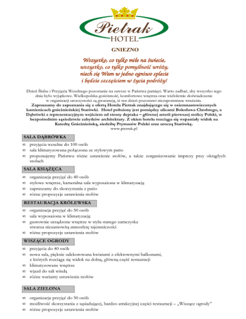 GNIEZNO Wszystko, co tylko miłe na świecie, wszystko, co tylko pomyś pomyślność lność wróŜ wróŜy, niech się się Wam w jedno ogniwo splecie i bę będzie szczęś szczęściem ęściem w Ŝycia podróŜ podróŜy! Dzień Ślubu i Przyjęcia Weselnego pozostanie na zawsze w Państwa pamięci. Warto zadbać, aby wszystko tego dnia było wyjątkowe. Wielkopolska gościnność, komfortowe wnętrza oraz wieloletnie doświadczenie w organizacji uroczystości są gwarancją, iŜ ten dzień pozostawi niezapomniane wraŜenia. Zapraszamy do zapoznania się z ofertą Hotelu Pietrak znajdującego się w osiemnastowiecznych kamienicach gnieźnieńskiej Starówki. Hotel połoŜony jest pomiędzy ulicami Bolesława Chrobrego, a Dąbrówki z reprezentacyjnym wejściem od strony deptaka – głównej arterii pierwszej stolicy Polski, w bezpośrednim sąsiedztwie zabytków architektury. Z okien hotelu rozciąga się wspaniały widok na Katedrę Gnieźnieńską, siedzibę Prymasów Polski oraz uroczą Starówkę. www.pietrak.pl SALA DĄBRÓWKA • • • przyjęcia weselne do 100 osób sala klimatyzowana połączona ze stylowym patio proponujemy Państwu róŜne ustawienie stołów, a takŜe zorganizowanie imprezy przy okrągłych stołach SALA KSIĄśĘCA : • organizacja przyjęć do 40 osób • stylowe wnętrze, kameralna sala wyposaŜona w klimatyzację • zapraszamy do skorzystania z patio • róŜne propozycje ustawienia stołów RESTAURACJA KRÓLEWSKA • • • • organizacja przyjęć do 50 osób sala wyposaŜona w klimatyzację gustownie urządzone wnętrze w stylu starego zamczyska stwarza niesamowitą atmosferę tajemniczości róŜne propozycje ustawienia stołów WISZĄCE OGRODY • • • • • przyjęcia do 40 osób nowa sala, pięknie udekorowana kwiatami z efektownymi balkonami, z których rozciąga się widok na dolną, główną część restauracji klimatyzowane wnętrze wjazd do sali windą róŜne warianty ustawienia stołów SALA ZIELONA • • • organizacja przyjęć do 50 osób moŜliwość skorzystania z sąsiadującej, bardzo atrakcyjnej części restauracji – „Wiszące ogrody” róŜne propozycje ustawienia stołów HOTEL • • 120 miejsc noclegowych w prezencie dla Pary Młodej stylowy apartament z odrębną częścią gościnną oraz specjalnie przygotowaną na tę okazję częścią sypialną • oferujemy Państwu pokoje jednoosobowe, dwuosobowe, pokoje typu studio, apartamenty, moŜliwość przygotowania dostawek • promocyjne ceny noclegu dla gości weselnych • dodatkową atrakcją dla gości jest basen, sauna i jacuzzi • zapewniamy całodobowy parking strzeŜony DEKORACJE I WYSTRÓJ SALI – GRATIS: • • • indywidualnie przygotowywana elegancka karta menu dla gości weselnych kompozycje kwiatowe dekoracja sali oraz nakrycie stołu w tonacji podkreślającej charakter przyjęcia weselnego PROJEKT PRZYJĘCIA WESELNEGO: • • • • uroczyste wejście Pary Młodej przy akompaniamencie "Marszu weselnego" Mendelssohna staropolskie powitanie chlebem i solą przez rodziców lub obsługę składanie Ŝyczeń nowoŜeńcom wzniesienie toastu szampanem na cześć Młodej Pary, wybuch balonu w momencie stłuczenia kieliszków • zaproszenie gości do stołu, uroczyste poprowadzenie nowoŜeńców do stołu prezydialnego • serwowanie obiadu • pierwszy taniec w okręgu stworzonym przez gości weselnych • deser, bufet zimnych zakąsek • oczepiny połączone z podziękowaniami dla rodziców • uroczysty wjazd - przy zgaszonym świetle - tortu weselnego udekorowanego rozjaśniającymi mrok fontannami sztucznych ogni; dzielenie wspólnie zaczynają Państwo Młodzi • śniadanie na gorąco Alkohole i napoje oferujemy Państwu w specjalnie na tę okazję obniŜonej cenie: Wódka Bols, Sobieski: po preferencyjnych cenach oraz wiele innych... Wina: szeroka oferta win francuskich, włoskich, hiszpańskich, a takŜe wina m.in. portugalskie, niemieckie, kalifornijskie, izraelskie, argentyńskie. DODATKOWE ATRAKCJE: • urozmaicone scenariusze wieczorów tematycznych: biesiada rycerska, chłopskie jadło, wieczór hiszpański, meksykański, country, karaoke itp. • przejazdy zabytkowymi samochodami • pokazy sztucznych ogni • pokazy kulinarne szefa kuchni, pokaz barmański Proponujemy równieŜ: • wyselekcjonowaną oprawę muzyczną (wiele zespołów muzycznych lub DJ) • organizację transportu dla gości weselnych • utrwalenie przebiegu ceremonii ślubnej oraz przyjęcia weselnego (filmowanie, fotografowanie) • sprawdzone salony ekskluzywnej mody ślubnej oraz makijaŜu i fryzur • wynajem limuzyn Z wielką radością podejmiemy się organizacji tak waŜnej uroczystości wsłuchując się uwaŜnie we wszystkie uwagi i sugestie. Dla kaŜdego z Państwa postaramy się stworzyć ofertę dostosowaną do Ŝyczeń, potrzeb i budŜetu. Serdecznie zapraszamy gwarantując profesjonalną obsługę oraz smaczną kuchnię. W razie jakichkolwiek pytań lub sugestii z Państwa strony kierownicy gastronomii słuŜą swoją wiedzą oraz profesjonalizmem: Kierownik gastronomii w Gnieźnie, nr tel. 061 426 14 97, wew. 175
