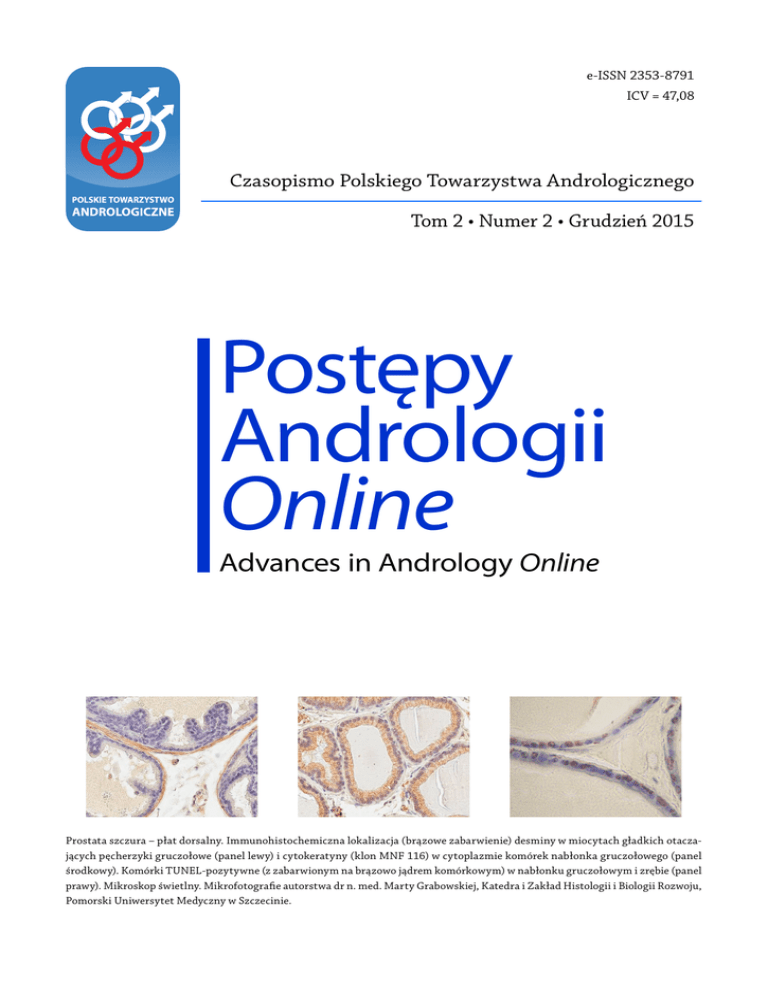 e-ISSN 2353-8791 ICV = 47,08 Czasopismo Polskiego Towarzystwa Andrologicznego Tom 2 • Numer 2 • Grudzień 2015 Postępy Andrologii Online Advances in Andrology Online Prostata szczura – płat dorsalny. Immunohistochemiczna lokalizacja (brązowe zabarwienie) desminy w miocytach gładkich otaczających pęcherzyki gruczołowe (panel lewy) i cytokeratyny (klon MNF 116) w cytoplazmie komórek nabłonka gruczołowego (panel środkowy). Komórki TUNEL-pozytywne (z zabarwionym na brązowo jądrem komórkowym) w nabłonku gruczołowym i zrębie (panel prawy). Mikroskop świetlny. Mikrofotografie autorstwa dr n. med. Marty Grabowskiej, Katedra i Zakład Histologii i Biologii Rozwoju, Pomorski Uniwersytet Medyczny w Szczecinie. POSTĘPY ANDROLOGII ONLINE, 2015, 2 2 Czasopismo Polskiego Towarzystwa Andrologicznego e-ISSN 2353-8791 ICV = 47,08 Czasopismo Polskiego Towarzystwa Andrologicznego Tom 2 • Numer 2 • Grudzień 2015 Postępy Andrologii Online Postępy Andrologii Online Advances in Andrology Online Advances in Andrology Online http://www.postepyandrologii.pl Prostata szczura – płat dorsalny. Immunohistochemiczna lokalizacja (brązowe zabarwienie) desminy w miocytach gładkich otaczających pęcherzyki gruczołowe (panel lewy) i cytokeratyny (klon MNF 116) w cytoplazmie komórek nabłonka gruczołowego (panel środkowy). Komórki TUNEL-pozytywne (z zabarwionym na brązowo jądrem komórkowym) w nabłonku gruczołowym i zrębie (panel prawy). Mikroskop świetlny. Mikrofotografie autorstwa dr n. med. Marty Grabowskiej, Katedra i Zakład Histologii i Biologii Rozwoju, Pomorski Uniwersytet Medyczny w Szczecinie. KOMITET REDAKCYJNY Redaktor naczelny: dr hab. n. med., prof. nadzw. PUM Małgorzata Piasecka, Szczecin Zastępca redaktora naczelnego: prof. dr hab. n. med. Jolanta Słowikowska-Hilczer, Łódź Redaktor pomocniczy: dr n. med. Kamil Gill, Szczecin Sekretarz redakcji: dr n. med. Agnieszka Kolasa-Wołosiuk, Szczecin Skarbnik redakcji: dr n. med. Renata Walczak-Jędrzejowska, Łódź Członkowie komitetu redakcyjnego: dr n. med. Szymon Bakalczuk, Lublin dr n. med. Leszek Bergier, Kraków prof. dr hab. n. biol. Barbara Bilińska, Kraków prof. dr hab. n. med. Barbara Darewicz, Białystok Prof., MD, PhD Aleksander Giwercman, Malmö, Sweden PhD Yvonne Lundberg Giwercman, Malmö, Sweden Prof., PhD (UPE/NMMU) and PhD (US) Gerhard Van der Horst, Republika Południowej Afryki (Bellville, Republic of South Africa) prof. dr hab. n. med. Grzegorz Jakiel, Warszawa prof. dr hab. n. med. Piotr Jędrzejczak, Poznań dr hab. n. med., prof. UMK Roman Kotzbach, Bydgoszcz prof. dr hab. n. med. Krzysztof Kula, Łódź lek. med. Robert Kulik, Warszawa prof. dr hab. n. med. Maria Laszczyńska, Szczecin dr hab. n. med. Grzegorz Ludwikowski, Bydgoszcz prof. dr hab. n. med. Marek Mędraś, Wrocław MD, PhD, DMSc Ewa Rajpert-De Meyts, Kopenhaga, Dania (Copenhagen, Denmark) dr n. med. Aleksandra Robacha, Łódź dr n. med. Maria Szarras-Czapnik, Warszawa Adres redakcji: Katedra i Zakład Histologii i Biologii Rozwoju Wydział Nauk o Zdrowiu Pomorski Uniwersytet Medyczny w Szczecinie 71-210 Szczecin ul. Żołnierska 48 tel. 91 48 00 917, 91 48 00 908 e-mail: [email protected] Projekt graficzny: Agnieszka Hilczer Waldemar Jachimczak Małgorzata Piasecka Jolanta Słowikowska-Hilczer Korekta języka polskiego: Wojciech Markowski Korekta języka angielskiego: Małgorzata Piasecka Jolanta Słowikowska-Hilczer Zuzanna Słowikowska Skład i łamanie: Waldemar Jachimczak POSTĘPY ANDROLOGII ONLINE, 2015, 2 2 Czasopismo Polskiego Towarzystwa Andrologicznego e-ISSN 2353-8791 ICV = 47,08 Czasopismo Polskiego Towarzystwa Andrologicznego Tom 2 • Numer 2 • Grudzień 2015 Postępy Andrologii Online Postępy Andrologii Online Advances in Andrology Online Advances in Andrology Online http://www.postepyandrologii.pl Prostata szczura – płat dorsalny. Immunohistochemiczna lokalizacja (brązowe zabarwienie) desminy w miocytach gładkich otaczających pęcherzyki gruczołowe (panel lewy) i cytokeratyny (klon MNF 116) w cytoplazmie komórek nabłonka gruczołowego (panel środkowy). Komórki TUNEL-pozytywne (z zabarwionym na brązowo jądrem komórkowym) w nabłonku gruczołowym i zrębie (panel prawy). Mikroskop świetlny. Mikrofotografie autorstwa dr n. med. Marty Grabowskiej, Katedra i Zakład Histologii i Biologii Rozwoju, Pomorski Uniwersytet Medyczny w Szczecinie. SPIS TREŚCI Tom 2 Numer 2 Strony 1–66 Grudzień 2015 O czasopiśmie 4 Artykuły poglądowe Krzysztof Kula, Renata Walczak-Jędrzejowska, Piotr Kula, Katarzyna Marchlewska, Elżbieta Oszukowska, Jolanta Słowikowska-Hilczer Postępy badań nad hipogonadyzmem u starszych mężczyzn Research progress on hypogonadism in older men Tomasz Purwin, Jolanta Słowikowska-Hilczer Zespół Klinefeltera – aktualne zalecenia odnośnie postępowania medycznego Klinefelter syndrome – current recommendations regarding medical procedures 5 12 Rekomendacje medyczne – Jolanta Słowikowska-Hilczer 25 G.R. Dohle (Przewodniczący), S. Arver, C. Bettocchi, T.H. Jones, S. Kliesch, M. Punab Rekomendacje dotyczące diagnostyki i leczenia męskiego hipogonadyzmu Tłumaczenie i przygotowanie wersji polskiej: Łukasz Wojnar, Elżbieta Oszukowska, Jolanta Słowikowska-Hilczer 26 Sprawozdanie i streszczenia wykładów z Konferencji Polskiego Towarzystwa Andrologicznego – 17. Dzień Andrologiczny 46 Instrukcje dla autorów 62 Recenzenci prac opublikowanych w 2015 r. 65 3 POSTĘPY ANDROLOGII ONLINE, 2015, 2 2 Czasopismo Polskiego Towarzystwa Andrologicznego Postępy Andrologii Online Advances in Andrology Online http://www.postepyandrologii.pl e-ISSN 2353-8791 Czasopismo jest indeksowane w Index Copernicus The journal is indexed in Index Copernicus ICV (Index Copernicus Value) 2014: 47.08 Wersja elektroniczna czasopisma jest wersją pierwotną. Informacje zawarte w czasopiśmie są udostępniane na zasadzie Open Access – dostęp do informacji naukowej jest bezpłatny i nieogra