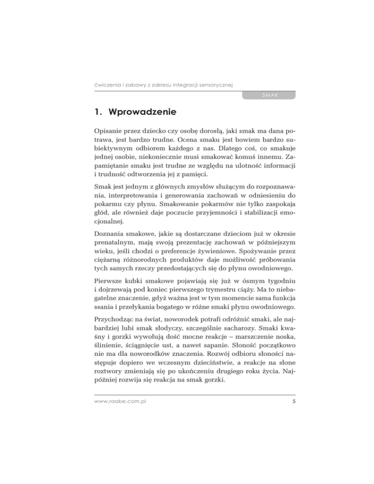 wiczenia i zabawy z zakresu integracji sensorycznej SMAK 1. Wprowadzenie Opisanie przez dziecko czy osobę dorosłą, jaki smak ma dana potrawa, jest bardzo trudne. Ocena smaku jest bowiem bardzo subiektywnym odbiorem każdego z nas. Dlatego coś, co smakuje jednej osobie, niekoniecznie musi smakować komuś innemu. Zapamiętanie smaku jest trudne ze względu na ulotność informacji i trudność odtworzenia jej z pamięci. Smak jest jednym z głównych zmysłów służącym do rozpoznawania, interpretowania i generowania zachowań w odniesieniu do pokarmu czy płynu. Smakowanie pokarmów nie tylko zaspokaja głód, ale również daje poczucie przyjemności i stabilizacji emocjonalnej. Doznania smakowe, jakie są dostarczane dzieciom już w okresie prenatalnym, mają swoją prezentację zachowań w późniejszym wieku, jeśli chodzi o preferencje żywieniowe. Spożywanie przez ciężarną różnorodnych produktów daje możliwość próbowania tych samych rzeczy przedostających się do płynu owodniowego. Pierwsze kubki smakowe pojawiają się już w ósmym tygodniu i dojrzewają pod koniec pierwszego trymestru ciąży. Ma to niebagatelne znaczenie, gdyż ważna jest w tym momencie sama funkcja ssania i przełykania bogatego w różne smaki płynu owodniowego. Przychodząc na świat, noworodek potrafi odróżnić smaki, ale najbardziej lubi smak słodyczy, szczególnie sacharozy. Smaki kwaśny i gorzki wywołują dość mocne reakcje – marszczenie noska, ślinienie, ściągnięcie ust, a nawet sapanie. Słoność początkowo nie ma dla noworodków znaczenia. Rozwój odbioru słoności następuje dopiero we wczesnym dzieciństwie, a reakcje na słone roztwory zmieniają się po ukończeniu drugiego roku życia. Najpóźniej rozwija się reakcja na smak gorzki. www.raabe.com.pl 5 wiczenia i zabawy z zakresu integracji sensorycznej SMAK 1.1. Jak dzia a nasz zmys smaku? Smak tak jak węch jest jednym ze zmysłów chemicznych, który wykrywa w naszym otoczeniu cząstki chemiczne i przekształca te informacje na impulsy elektryczne. Zmysł ten jest niezwykle prosty; identyfikuje tylko cztery smaki (niektórzy uważają, że pięć): • słodki, • słony, • kwaśny, • gorzki, • umami (naukowcy uważają, że jest to smak wrażliwy na aminokwas glutaminę). Pokarm dostający się do jamy ustnej pobudza komórki smakowe znajdujące się na szczycie każdego kubka smakowego. Kubki smakowe umieszczone są głównie na języku, podniebieniu i ściankach bocznych jamy ustnej. Każdy człowiek ma ok. 4500 kubków smakowych, z których każdy posiada ok. 40 komórek recepturowych. To w nich dochodzi do przetwarzania sygnału na impulsy elektryczne, które przesyłane są do rdzenia przedłużonego. Bodźce smakowe kontrolowane przez pień mózgu pomagają wywołać odruchy bezwarunkowe potrzebne do prawidłowego spożywania pokarmów: wydzielania śliny, przełykania i ruchów języka. Informacje smakowe biegną do coraz wyższych części pnia: mostu i wzgórza, skąd przekazywane są do struktur limbicznych, które kontrolują naszą motywację do jedzenia i picia. Dopiero tutaj są świadomie odbierane i zinterpretowane – zarówno struktura, jak i konsystencja oraz natężenie smaku. Pełne rozpoznanie pokarmu następuje jednak po połączeniu doznań smakowych i węchowych. 1.2. Smak s odyczy Upodobanie do słodyczy jest zrozumiałe z fizjologicznego punktu widzenia. Słodycze smakują nam, gdyż wprawiają nas w dobre 6 www.raabe.com.pl wiczenia i zabawy z zakresu integracji sensorycznej SMAK samopoczucie i wywołują pozytywne doznania. Są olbrzymim zastrzykiem energii i nie musimy długo czekać, aby pojawiło się przyjemne uczucie spowodowane jedzeniem słodyczy. Wydzielane podczas jedzenia słodyczy endorfiny wprawiają nas w błogostan i odcinają dopływ bolesnych bodźców do mózgu. Podanie dziecku smoczka umoczonego w słodyczy działa uspokajająco – dziecko przestaje płakać, rytm serca staje się coraz wolniejszy, słabną nieskoordynowane ruchy. Noworodek poznaje smak słodyczy, ssąc mleko matki. Jest ono słodsze od krowiego i zapewnia noworodkowi wszystkie potrzebne składniki odżywcze, witaminy, minerały, ale również enzymy, czynniki odpornościowe, hormony, czynniki wzrostu i inne, które nie zostały jeszcze do końca poznane. Sam akt karmienia to nie tylko zaspokojenie głodu dziecka, ale nawiązywanie bardzo intymnych relacji emocjonalnych i źródło stymulacji czuciowej. Ssanie wpływa kojąco i zmniejsza wrażliwość na ból. Wielu badaczy uważa, że mleko matki korzystnie wpływa na rozwój mózgu dziecka i zwiększa iloraz inteligencji. W związku z tym dzieci dłużej karmione piersią osiągają lepsze wyniki w szkole. Zawarta w mleku matki tauryna zmniejsza również pobudliwość nerwową i zapobiega drgawkom, które towarzyszą noworodkom w momencie wystąpienia wysokiej gorączki. Poznając smak słodyczy, zostaliśmy jednak wciągnięci w swego rodzaju pułapkę. Oprócz pozytywnych skutków spożywania słodyczy są również negatywne – uzależnienie. Niektórzy mają skłonność do objadania się słodyczami, np. w chwilach stresu. Jest to o tyle zgubne, iż prowadzi do niekontrolowanego wzrostu ciężaru ciała. Dzieci spożywające w nadmiarze słodycze mają nierzadko problemy natury emocjonalnej, zaburzenia smaku, choroby układu pokarmowego. www.raabe.com.pl 7 wiczenia i zabawy z zakresu integracji sensorycznej SMAK 2. Objawy dysfunkcji, zaburzenia towarzysz!ce Smak to papierek lakmusowy otaczającego nas środowiska. Początkowo dzieci badają wszystkie rzeczy za pomocą ust, dostarczając sobie również wrażeń smakowych. Ssanie piąstki dziecka to nic innego jak smakowane własnej skóry i dawanie poczucia bezpieczeństwa emocjonalnego. Jednak utrzymujące się zbyt długo zachowania smakowania wszystkiego, co znajduje się w zasięgu wzroku dziecka, mogą świadczyć o dysfunkcji tego zmysłu. 2.1. Nadwra"liwo#$ Objawy nadw