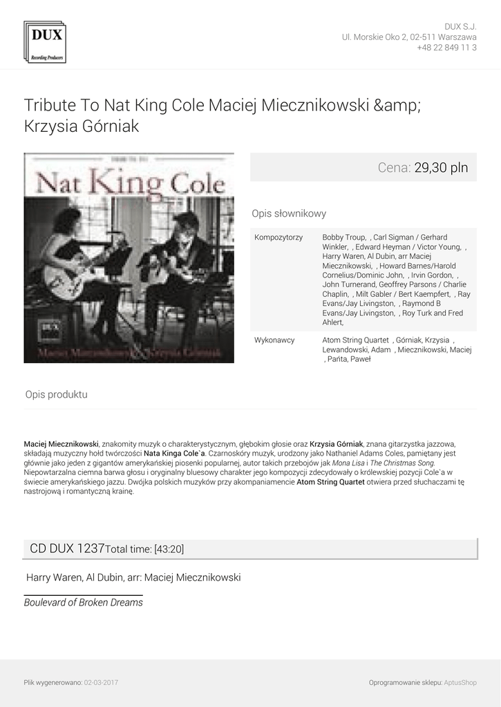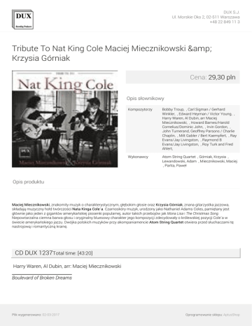 DUX S.J. Ul. Morskie Oko 2, 02-511 Warszawa +48 22 849 11 3 Tribute To Nat King Cole Maciej Miecznikowski & Krzysia Górniak Cena: 29,30 pln Opis słownikowy Kompozytorzy Bobby Troup, ∎, Carl Sigman / Gerhard Winkler, ∎, Edward Heyman / Victor Young, ∎, Harry Waren, Al Dubin, arr Maciej Miecznikowski, ∎, Howard Barnes/Harold Cornelius/Dominic John, ∎, Irvin Gordon, ∎, John Turnerand, Geoffrey Parsons / Charlie Chaplin, ∎, Milt Gabler / Bert Kaempfert, ∎, Ray Evans/Jay Livingston, ∎, Raymond B Evans/Jay Livingston, ∎, Roy Turk and Fred Ahlert, ∎ Wykonawcy Atom String Quartet ∎, Górniak, Krzysia ∎, Lewandowski, Adam ∎, Miecznikowski, Maciej ∎, Pańta, Paweł ∎ Opis produktu Maciej Miecznikowski, znakomity muzyk o charakterystycznym, głębokim głosie oraz Krzysia Górniak, znana gitarzystka jazzowa, składają muzyczny hołd twórczości Nata Kinga Cole`a. Czarnoskóry muzyk, urodzony jako Nathaniel Adams Coles, pamiętany jest głównie jako jeden z gigantów amerykańskiej piosenki popularnej, autor takich przebojów jak Mona Lisa i The Christmas Song. Niepowtarzalna ciemna barwa głosu i oryginalny bluesowy charakter jego kompozycji zdecydowały o królewskiej pozycji Cole`a w świecie amerykańskiego jazzu. Dwójka polskich muzyków przy akompaniamencie Atom String Quartet otwiera przed słuchaczami tę nastrojową i romantyczną krainę. CD DUX 1237Total time: [43:20] Harry Waren, Al Dubin, arr: Maciej Miecznikowski Boulevard of Broken Dreams Plik wygenerowano: 02-03-2017 Oprogramowanie sklepu: AptusShop DUX S.J. Ul. Morskie Oko 2, 02-511 Warszawa +48 22 849 11 3 1. Boulevard of Broken Dreams [5:07] Carl Sigman / Gerhard Winkler Answer me 2. Answer me [4:35] Milt Gabler / Bert Kaempfert L.O.V.E. 3. L.O.V.E. [2:33] Howard Barnes/Harold Cornelius/Dominic John A Blossom Fell 4. A Blossom Fell [4:21] Ray Evans/Jay Livingston Mona Lisa 5. Mona Lisa [3:22] Raymond B Evans/Jay Livingston Never Let Me Go 6. Never Let Me Go [4:27] Plik wygenerowano: 02-03-2017 Oprogramowanie sklepu: AptusShop DUX S.J. Ul. Morskie Oko 2, 02-511 Warszawa +48 22 849 11 3 Irvin Gordon Unforgettable 7. Unforgettable [3:28] Bobby Troup Route 66 8. Route 66 [3:32] John Turnerand, Geoffrey Parsons / Charlie Chaplin Smile 9. Smile [3:53] Roy Turk and Fred Ahlert Walking My Baby 10. Walking My Baby [3:15] Edward Heyman / Victor Young When I Fall In Love 11. When I Fall In Love [4:44] Wykonawcy: Atom String Quartet Plik wygenerowano: 02-03-2017 Oprogramowanie sklepu: AptusShop DUX S.J. Ul. Morskie Oko 2, 02-511 Warszawa +48 22 849 11 3 Adam Lewandowski /drums/ Krzysia Górniak /guitar/ Maciej Miecznikowski /vocal, guitar/ Paweł Pańta /double bass/ Plik wygenerowano: 02-03-2017 Powered by TCPDF (www.tcpdf.org) Oprogramowanie sklepu: AptusShop