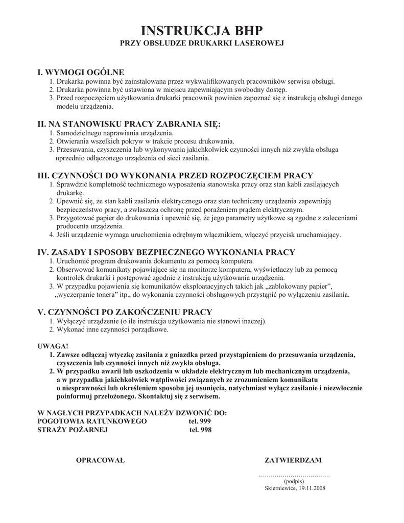 INSTRUKCJA BHP PRZY OBSŁUDZE DRUKARKI LASEROWEJ I. WYMOGI OGÓLNE 1. Drukarka powinna być zainstalowana przez wykwalifikowanych pracowników serwisu obsługi. 2. Drukarka powinna być ustawiona w miejscu zapewniającym swobodny dostęp. 3. Przed rozpoczęciem użytkowania drukarki pracownik powinien zapoznać się z instrukcją obsługi danego modelu urządzenia. II. NA STANOWISKU PRACY ZABRANIA SIĘ: 1. Samodzielnego naprawiania urządzenia. 2. Otwierania wszelkich pokryw w trakcie procesu drukowania. 3. Przesuwania, czyszczenia lub wykonywania jakichkolwiek czynności innych niż zwykła obsługa uprzednio odłączonego urządzenia od sieci zasilania. III. CZYNNOŚCI DO WYKONANIA PRZED ROZPOCZĘCIEM PRACY 1. Sprawdzić kompletność technicznego wyposażenia stanowiska pracy oraz stan kabli zasilających drukarkę. 2. Upewnić się, że stan kabli zasilania elektrycznego oraz stan techniczny urządzenia zapewniają bezpieczeństwo pracy, a zwłaszcza ochronę przed porażeniem prądem elektrycznym. 3. Przygotować papier do drukowania i upewnić się, że jego parametry użytkowe są zgodne z zaleceniami producenta urządzenia. 4. Jeśli urządzenie wymaga uruchomienia odrębnym włącznikiem, włączyć przycisk uruchamiający. IV. ZASADY I SPOSOBY BEZPIECZNEGO WYKONANIA PRACY 1. Uruchomić program drukowania dokumentu za pomocą komputera. 2. Obserwować komunikaty pojawiające się na monitorze komputera, wyświetlaczy lub za pomocą kontrolek drukarki i postępować zgodnie z instrukcją użytkowania urządzenia. 3. W przypadku pojawienia się komunikatów eksploatacyjnych takich jak „zablokowany papier”, „wyczerpanie tonera” itp., do wykonania czynności obsługowych przystąpić po wyłączeniu zasilania. V. CZYNNOŚCI PO ZAKOŃCZENIU PRACY 1. Wyłączyć urządzenie (o ile instrukcja użytkowania nie stanowi inaczej). 2. Wykonać inne czynności porządkowe. UWAGA! 1. Zawsze odłączaj wtyczkę zasilania z gniazdka przed przystąpieniem do przesuwania urządzenia, czyszczenia lub czynności innych niż zwykła obsługa. 2. W przypadku awarii lub uszkodzenia w układzie elektrycznym lub mechanicznym urządzenia, a w przypadku jakichkolwiek wątpliwości związanych ze zrozumieniem komunikatu o niesprawności lub określeniem sposobu jej usunięcia, natychmiast wyłącz zasilanie i niezwłocznie poinformuj przełożonego. Skontaktuj się z serwisem. W NAGŁYCH PRZYPADKACH NALEŻY DZWONIĆ DO: POGOTOWIA RATUNKOWEGO tel. 999 STRAŻY POŻARNEJ tel. 998 OPRACOWAŁ ZATWIERDZAM ……………………………… (podpis) Skierniewice, 19.11.2008