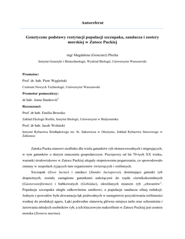 Autoreferat Genetyczne podstawy restytucji populacji szczupaka, sandacza i zostery morskiej w Zatoce Puckiej mgr Magdalena (Gonciarz) Płecha Instytut Genetyki i Biotechnologii, Wydział Biologii, Uniwersytet Warszawski Promotor: Prof. dr. hab. Piotr Węgleński Centrum Nowych Technologii, Uniwersytet Warszawski Promotor pomocniczy: dr hab. Anna StankoviㆠRecenzenci: Prof. dr hab. Emilia Brzosko Zakład Ekologii Roślin, Instytut Biologii, Uniwersytet w Białymstoku Prof. dr hab. Jacek Wolnicki Instytut Rybactwa Śródlądowego im. St. Sakowicza w Olsztynie, Zakład Rybactwa Stawowego w Żabiencu Zatoka Pucka stanowi siedlisko dla wielu gatunków ryb słonawowodnych i migrujących, w tym gatunków o dużym znaczeniu gospodarczym. Począwszy od lat 70-tych XX wieku, warunki środowiskowe w Zatoce Puckiej ulegały stopniowemu pogarszaniu, co spowodowało zmiany w zespołach żyjących tam organizmów zwierzęcych i roślinnych. Szczupak (Esox lucius) i sandacz (Sander lucioperca), dominujące gatunki ryb drapieżnych, zostały zastąpione gatunkami należącymi do rzędu ciernikokształtnych (Gasterosteiformes) i babkowatych (Gobiidae), określanych mianem ryb „chwastów”. Populacja szczupaka uległa całkowitemu zanikowi, a populacja sandacza silnej redukcji. Jednym z powodów była dewastacja łąk podwodnych w następstwie pozyskiwania roślinności wodnej do produkcji agaru. Łąki podwodne stanowią główne miejsca tarła oraz schronienia i żerowania młodych osobników ryb, a ich kluczowym makrofitem w Zatoce Puckiej jest zostera morska (Zostera marina). Pogarszający się stan ekosystemu Zatoki Puckiej spowodował zaniepokojenie lokalnych środowisk ekologów i rybaków, a także władz samorządowych. W 2010 roku podjęto decyzję o rozpoczęciu programu kompleksowej restytucji ekosystemu Zatoki Puckiej „Restytucja kluczowych elementów ekosystemu Zatoki Puckiej wewnętrznej - ZOSTERA”. W projekcie tym przewidziano odbudowę populacji szczupaka oraz sandacza, a w celu zwiększenia szansy odtworzenia populacji tych cennych gatunków, również restytucję populacji zostery morskiej. Podstawowym warunkiem powodzenia tego rodzaju projektów jest wykonanie analiz genetycznych, których wyniki pozwoliłyby na ustalenie poziomu zmienności genetycznej odnawianych populacji oraz identyfikację naturalnych populacji ryb, które stanowić mogłyby źródło osobników do stad tarłowych. Niniejsza praca jest odpowiedzią na oczekiwania samorządów miejscowości położonych nad Zatoką Pucką i środowisk rybackich tego rejonu, istotnie zainteresowanych restytucją populacji ważnych gospodarczo ryb i przywrócenia równowagi ekosystemu Zatoki. W ramach pracy, korzystając z materiałów archiwalnych (łuski ryb), zbadano polimorfizm genetyczny populacji szczupaka występującej w Zatoce Puckiej w okresie poprzedzającym wyginięcie tej populacji. Następnie przeprowadzono analizy mające na celu wytypowanie najbliższej genetycznie populacji szczupaka, która mogłaby stanowić źródło materiału zarybieniowego. Pod tym samym kątem prowadzono analizy genetyczne ginącej populacji sandacza. Postanowiono też przeprowadzić analizy genetyczne populacji zostery morskiej, której łąki podwodne są miejscem składania ikry przez tarlaki obu badanych gatunków i zapewniają odpowiednie warunki środowiskowe dla rozwoju młodych osobników ryb. W badaniach wykorzystano trzy rodzaje markerów molekularnych. Dla każdego z badanych gatunków, szczupaka, sandacza i zostery morskiej opracowano po dwa zestawy multipleksowe loci mikrosatelitarnych (msDNA). Przeprowadzono też analizy zmienności mitochondrialnego DNA (mtDNA) szczupaka oraz markerów AFLP zostery morskiej. Zbadano polimorfizm i zróżnicowanie genetyczne archiwalnej populacji szczupaka z Zatoki Puckiej (1960 - 1970) oraz 15 innych populacji współczesnych tego gatunku. Stwierdzono, że większość populacji szczupaka charakteryzuje się umiarkowanym poziomem polimorfizmu. Najbardziej polimorficzna okazała się wymarła obecnie populacja z Zatoki Puckiej. Na podstawie analiz wytypowano najbliższą genetycznie, obecnie żyjącą populację szczupaka, która stanowiła źródło osobników do stad tarłowych. Jest to populacja z ujścia rzeki Motławy. Ukazana struktura genetyczna współczesnych populacji szczupaka, występujących w wodach słodkich i słonawych Polski oraz Niemiec, wskazuje na brak dużego zróżnicowania między populacjami obu środowisk. Uzyskany obraz struktury genetycznej może być następstwem wpływu niekontrolowanej dotąd gospodarki zarybieniowej, która doprowadziła w większości przypadków do utracenia lokalnej zmienności genetycznej. Innym powodem może być także względnie nieduże zróżnicowanie genetyczne populacji szczupaka w Europie. Przedstawione wyniki będą miały znaczenie w planach zarządzania zasobami naturalnymi tego gatunku w Polsce. Na podstawie analizy zmienności sekwencji fragmentu regionu kontrolnego mtDNA szczupaka, obejmującej zarówno populacje, dla których posiadano własne dane o polimorfizmie markerów msDNA, jak i dane literaturowe dotyczące innych populacji europejskich, stwierdzono obecność dwóch dominujących haplotypów oraz brak wyraźnej struktury filogeograficznej populacji szczupaka w Europie. Analiza ta potwierdziła niewielkie zróżnicowanie genetyczne europejskich populacji tego gatunku. Na podstawie analizy 12 loci msDNA zbadano polimorfizm i zróżnicowanie genetyczne populacji sandacza z Zatoki Puckiej, a także 16 innych słonawo- i słodkowodnych współczesnych populacji tego gatunku oraz ukazano ich strukturę genetyczną. Populacje te charakteryzują się niskim poziomem polimorfizmu, z największą jego wartością uzyskaną w przypadku resztkowej populacji Zatoki Puckiej. Stwierdzono również, że pierwotnie wytypowane populacje z Wisły Śmiałej oraz Martwej nie będą stanowiły odpowiedniego źródła osobników do stad 