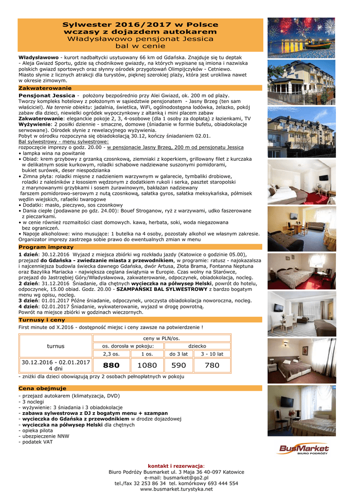 Sylwester 2016/2017 w Polsce wczasy z dojazdem autokarem Władysławowo pensjonat Jessica bal w cenie Władysławowo - kurort nadbałtycki usytuowany 66 km od Gdańska. Znajduje się tu deptak - Aleja Gwiazd Sportu, gdzie są chodnikowe gwiazdy, na których wypisane są imiona i nazwiska polskich gwiazd sportowych oraz słynny ośrodek przygotowań Olimpijczyków - Cetniewo. Miasto słynie z licznych atrakcji dla turystów, pięknej szerokiej plaży, która jest urokliwa nawet w okresie zimowym. Zakwaterowanie Pensjonat Jessica - położony bezpośrednio przy Alei Gwiazd, ok. 200 m od plaży. Tworzy kompleks hotelowy z położonym w sąsiedztwie pensjonatem - Jasny Brzeg (ten sam właściciel). Na terenie obiektu: jadalnia, świetlica, WiFi, ogólnodostępna lodówka, żelazko, pokój zabaw dla dzieci, niewielki ogródek wypoczynkowy z altanką i mini placem zabaw Zakwaterowanie: eleganckie pokoje 2, 3, 4-osobowe (dla 1 osoby za dopłatą) z łazienkami, TV Wyżywienie: 2 posiłki dziennie - smaczne, domowe (śniadanie w formie bufetu, obiadokolacje serwowane). Ośrodek słynie z rewelacyjnego wyżywienia. Pobyt w ośrodku rozpoczyna się obiadokolacją 30.12, kończy śniadaniem 02.01. Bal sylwestrowy - menu sylwestrowe: rozpoczęcie imprezy o godz. 20.00 - w pensjonacie Jasny Brzeg, 200 m od pensjonatu Jessica • lampka wina na powitanie • Obiad: krem grzybowy z grzanką czosnkową, ziemniaki z koperkiem, grillowany filet z kurczaka w delikatnym sosie kurkowym, roladki schabowe nadziewane suszonymi pomidorami, bukiet surówek, deser niespodzianka • Zimna płyta: roladki mięsne z nadzieniem warzywnym w galarecie, tymbaliki drobiowe, roladki z naleśników z łososiem wędzonym z dodatkiem rukoli i serka, pasztet staropolski z marynowanymi grzybkami i sosem żurawinowym, bakłażan nadziewany farszem pomidorowo-serowym z nutą czosnkową, sałatka gyros, sałatka meksykańska, półmisek wędlin wiejskich, rafaelki twarogowe • Dodatki: masło, pieczywo, sos czosnkowy • Dania ciepłe (podawane po gdz. 24.00): Bouef Stroganow, ryż z warzywami, udko faszerowane z pieczarkami. • w cenie również rozmaitości ciast domowych. kawa, herbata, soki, woda niegazowana bez ograniczeń. • Napoje alkoholowe: wino musujące: 1 butelka na 4 osoby, pozostały alkohol we własnym zakresie. Organizator imprezy zastrzega sobie prawo do ewentualnych zmian w menu Program imprezy 1 dzień: 30.12.2016 Wyjazd z miejsca zbiórki wg rozkładu jazdy (Katowice o godzinie 05.00), przejazd do Gdańska - zwiedzanie miasta z przewodnikiem, w programie: ratusz - najokazalsza i najcenniejsza budowla świecka dawnego Gdańska, dwór Artusa, Złota Brama, Fontanna Neptuna oraz Bazylika Mariacka - największa ceglana świątynia w Europie. Czas wolny na Starówce, przejazd do Jastrzębiej Góry/Władysławowa, zakwaterowanie, odpoczynek, obiadokolacja, nocleg. 2 dzień: 31.12.2016 Śniadanie, dla chętnych wycieczka na półwysep Helski, powrót do hotelu, odpoczynek, 15.00 obiad. Godz. 20.00 - SZAMPAŃSKI BAL SYLWESTROWY z bardzo bogatym menu wg opisu, nocleg. 3 dzień: 01.01.2017 Późne śniadanie, odpoczynek, uroczysta obiadokolacja noworoczna, nocleg. 4 dzień: 02.01.2017 Śniadanie, wykwaterowanie, wyjazd w drogę powrotną. Powrót na miejsce zbiórki w godzinach wieczornych. Turnusy i ceny First minute od X.2016 - dostępność miejsc i ceny zawsze na potwierdzenie ! ceny w PLN/os. turnus 30.12.2016 - 02.01.2017 4 dni os. dorosła w pokoju: dziecko 2,3 os. 1 os. do 3 lat 3 - 10 lat 880 1080 590 780 - zniżki dla dzieci obowiązują przy 2 osobach pełnopłatnych w pokoju a Cena obejmuje - przejazd autokarem (klimatyzacja, DVD) 3 noclegi wyżywienie: 3 śniadania i 3 obiadokolacje zabawa sylwestrowa z DJ z bogatym menu + szampan wycieczka do Gdańska z przewodnikiem w drodze dojazdowej wycieczka na półwysep Helski dla chętnych opieka pilota ubezpieczenie NNW podatek VAT kontakt i rezerwacja: Biuro Podróży Busmarket ul. 3 Maja 36 40-097 Katowice e-mail: [email protected] tel./fax 32 253 86 34 tel. komórkowy 693 444 554 www.busmarket.turystyka.net Informacje transportowe miasto Cieszyn Czechowice - Dziedzice Jastrzębie Zdrój Katowice - Giszowiec Katowice Knurów Mikołów Pawłowice Pszczyna Ruda Śląska Rybnik Tychy Wodzisław Zabrze Żory adres Stacja Paliw Statoil ul Kolejowa KFC Dworzec PKS ul. Sybiraków ul. Młodzieżowa 10. godz. 05:00 Plac Andrzeja (tył Dworca PKP) Stacja Orlen, ul. 1go Maja 9 parking Auchan ul. Gliwicka 3 parking Urzędu Miasta obok sklepu Aldi ul. Broniewskiego 1 C.H. Plaza ul. 1-go Maja 310 parking przy Dworcu PKS, ul. 3-go Maja przystanek bus vis a vis hotelu Tychy Stacja Statoil przy rondzie obok Mc Donalda Hala Widowiskowa Sport ul. Matejki 6 Stacja Statoil ul. Katowicka 1 wyjazd potwierdzony z Katowic - Giszowca, inne miasta i godziny wyjazdów do potwierdzenia, na zapytanie kontakt i rezerwacja: Biuro Podróży Busmarket ul. 3 Maja 36 40-097 Katowice e-mail: [email protected] tel./fax 32 253 86 34 tel. komórkowy 693 444 554 www.busmarket.turystyka.net