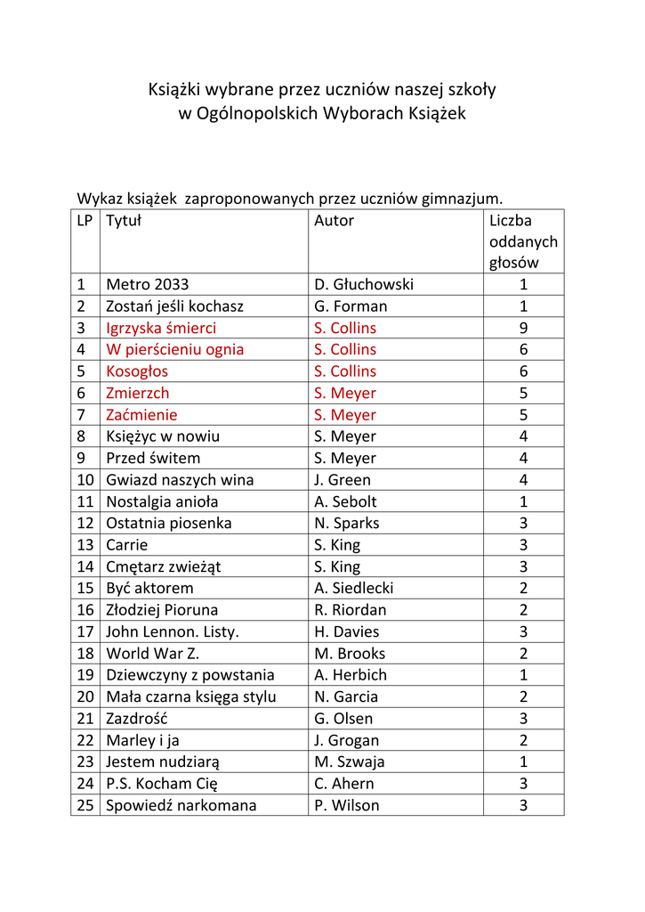 Książki wybrane przez uczniów naszej szkoły w Ogólnopolskich Wyborach Książek Wykaz książek zaproponowanych przez uczniów gimnazjum. LP Tytuł Autor Liczba oddanych głosów 1 Metro 2033 D. Głuchowski 1 2 Zostań jeśli kochasz G. Forman 1 3 Igrzyska śmierci S. Collins 9 4 W pierścieniu ognia S. Collins 6 5 Kosogłos S. Collins 6 6 Zmierzch S. Meyer 5 7 Zaćmienie S. Meyer 5 8 Księżyc w nowiu S. Meyer 4 9 Przed świtem S. Meyer 4 10 Gwiazd naszych wina J. Green 4 11 Nostalgia anioła A. Sebolt 1 12 Ostatnia piosenka N. Sparks 3 13 Carrie S. King 3 14 Cmętarz zwieżąt S. King 3 15 Być aktorem A. Siedlecki 2 16 Złodziej Pioruna R. Riordan 2 17 John Lennon. Listy. H. Davies 3 18 World War Z. M. Brooks 2 19 Dziewczyny z powstania A. Herbich 1 20 Mała czarna księga stylu N. Garcia 2 21 Zazdrość G. Olsen 3 22 Marley i ja J. Grogan 2 23 Jestem nudziarą M. Szwaja 1 24 P.S. Kocham Cię C. Ahern 3 25 Spowiedź narkomana P. Wilson 3 26 27 28 29 30 31 32 33 34 35 36 37 38 39 40 41 42 43 44 45 46 47 48 49 50 51 Byłam schizofreniczką Niemy śmiech Liceum Avalon Naznaczona Pocałunek anioła Podpalaczka Miasteczko Salem Odlot na samo dno Kokaina Gra Endera Porzucony Weronika postanawia umrzeć Pomaluj to na czarno Piękne istoty Dary anioła Za niebieskimi drzwiami Rok 1984 Rock n roll,bejbi! WebShows Miłość od pierwszego kliknięcia Dziewczyny wyklęte Pamiętnik narkomanki Wiedźmin Quo vadis Snajper. Opowieść komandosa Seal Team Six Kamienie na szaniec B. Rosiek Heidi H. M. Cabot K. i P. C. Cast E. Chandler S. King S. King J. Frey B. Rosiek D. S. Card A. Philips P. Coelho 3 2 2 1 1 1 1 3 2 2 1 1 J. Fitch M. Stohl C. Clare M. Szarygielski G. Orwell P. Rogoża K. Gonciarz J. Allert 1 1 1 1 1 1 1 1 Sz. Nowak B. Rosiek A. Sapkowski H. Sienkiewicz W. Howard E.; T. Stephen A. Kamiński 1 2 1 1 1 1