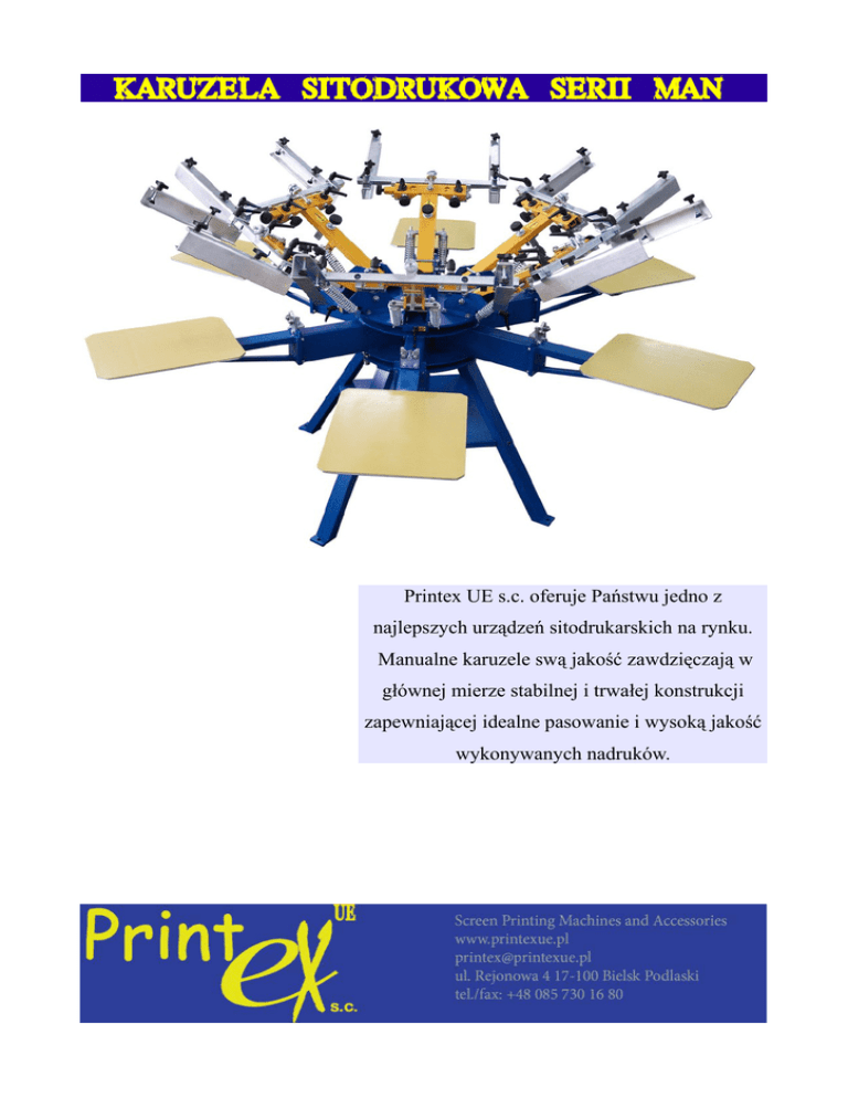 Karuzela sitodrukowa serii MAN Printex UE s.c. oferuje Państwu jedno z najlepszych urządzeń sitodrukarskich na rynku. Manualne karuzele swą jakość zawdzięczają w głównej mierze stabilnej i trwałej konstrukcji zapewniającej idealne pasowanie i wysoką jakość wykonywanych nadruków. Karuzela sitodrukowa serii MAN WYPOSAŻENIE ● Dostępne w konfiguracji 4, 6, 8 kolorów ● Stabilna trwała konstrukcja pokryta farbą proszkową ● System mikro-regulacji pozycji sita Pozycja głowicy drukującej ustalana jest poprzez dwa łożyska, tzw. widelec. Dokładna regulacja pozycji sita realizowana jest dzięki mikro rejestracji. System ten pozwala na przesunięcie sita zarówno w osi X jak i Y. Maszyna posiada bez narzędziową regulację off-contact oraz kąta sita względem stołu. Klamki zaciskowe blokujące pozycję screenholderów utrzymują jednocześnie stałą pozycję sita i pozwalają na stosowanie różnych rodzajów ramek sita. ● System szybkiego mocowania palet ● Standardowe palety 40x50 cm wykonane z płyty aluminiowej o grubości 6 mm pokryte gumą wulkanizowaną Karuzela sitodrukowa serii MAN ● Pneumatyczne zaciski sit dostępne w opcji, ● Dostępne zestawy podciśnieniowe (paleta + pompa), ● Dostępna wersja wielkoformatowa, max rozmiar sita 880x1080 mm, SPECYFIKACJA TECHNICZNA Stacje/kolory Max szerokość zadruku Max szerokość sita Standardowe palety Wysokość Średnica z sitem 4/4 68 cm 68 cm 40x50 cm 186 cm 330 cm 6/4 68 cm 68 cm 40x50 cm 186 cm 330 cm 6/6 68 cm 68 cm 40x50 cm 186 cm 330 cm 8/8 68 cm 68 cm 40x50 cm 186 cm 370 cm