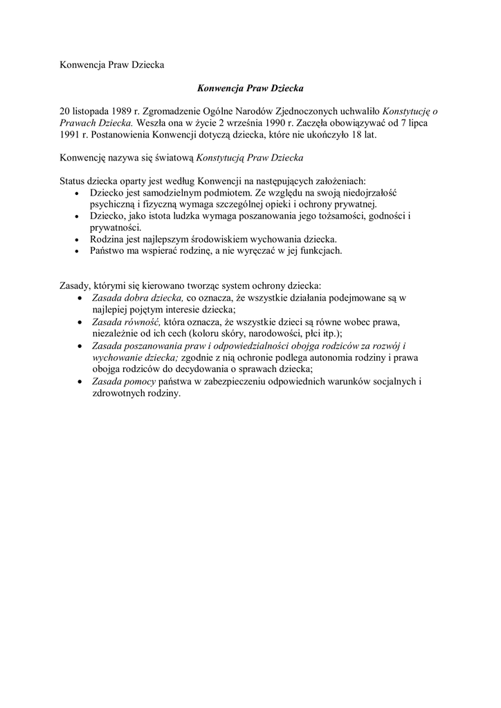 Konwencja Praw Dziecka Konwencja Praw Dziecka 20 listopada 1989 r. Zgromadzenie Ogólne Narodów Zjednoczonych uchwaliło Konstytucję o Prawach Dziecka. Weszła ona w życie 2 września 1990 r. Zaczęła obowiązywać od 7 lipca 1991 r. Postanowienia Konwencji dotyczą dziecka, które nie ukończyło 18 lat. Konwencję nazywa się światową Konstytucją Praw Dziecka Status dziecka oparty jest według Konwencji na następujących założeniach: Dziecko jest samodzielnym podmiotem. Ze względu na swoją niedojrzałość psychiczną i fizyczną wymaga szczególnej opieki i ochrony prywatnej. Dziecko, jako istota ludzka wymaga poszanowania jego tożsamości, godności i prywatności. Rodzina jest najlepszym środowiskiem wychowania dziecka. Państwo ma wspierać rodzinę, a nie wyręczać w jej funkcjach. Zasady, którymi się kierowano tworząc system ochrony dziecka: Zasada dobra dziecka, co oznacza, że wszystkie działania podejmowane są w najlepiej pojętym interesie dziecka; Zasada równość, która oznacza, że wszystkie dzieci są równe wobec prawa, niezależnie od ich cech (koloru skóry, narodowości, płci itp.); Zasada poszanowania praw i odpowiedzialności obojga rodziców za rozwój i wychowanie dziecka; zgodnie z nią ochronie podlega autonomia rodziny i prawa obojga rodziców do decydowania o sprawach dziecka; Zasada pomocy państwa w zabezpieczeniu odpowiednich warunków socjalnych i zdrowotnych rodziny. Katalog praw przyznanych dziecku w Konwencji: Prawa i wolności osobiste prawo do życia i rozwoju; prawo do tożsamości i identyczności (nazwiska, imienia, obywatelstwa, wiedzy o własnym pochodzeniu); prawo do wolności, godności, szacunku, nietykalności osobistej; prawo do swobody myśli, sumienia i wyznania; prawo do wyrażania własnych poglądów i występowania w sprawach dotyczących dziecka w postępowaniu administracyjnym i sądowym; prawo do wychowania w rodzinie i kontaktów z rodzicami w przypadku rozłączenia a nimi; prawo do wolności od przemocy fizycznej i psychicznej, wyzysku, nadużyć seksualnych i wszelkiego okrucieństwa; prawo nie rekrutowania do wojska poniżej 15 roku życia. Prawa socjalne prawo do odpowiedniego standardu życia; prawo do ochrony zdrowia; prawo do zabezpieczenia socjalnego; prawo do wypoczynku i czasu wolnego. Prawa kulturalne prawo do nauki (bezpłatnej i obowiązkowej w zakresie szkoły podstawowej); prawo do korzystania z dóbr kultury; prawo do informacji; prawo do znajomości swoich praw. Prawa polityczne prawo stowarzyszania się i zgromadzeń w celach pokojowych