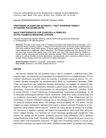 FOLIA UNIVERSITATIS AGRICULTURAE STETINENSIS Folia Univ. Agric. Stetin. 2007, Agric., Aliment., Pisc., Zootech. 257 (3), 61–66 Danuta DZIERŻANOWSKA-GÓRYŃ, Paulina JANIK PREFERENCJE SAMCÓW SZYNSZYLI PRZY WYBORZE SAMICY W CHOWIE POLIGAMICZNYM MALE PREFERENCES FOR CHINCHILLA FEMALES IN POLYGAMOUS BREEDING SYSTEM Katedra Szczegółowej Hodowli Zwierząt, Szkoła Główna Gospodarstwa Wiejskiego ul. Ciszewskiego 8, 02-786 Warszawa Abstract. The aim of the study was to evaluate chinchilla male preferences for females in polygamous family breeding system. 5 males and 20 females were observed. Male-female behaviours and relations were noted during 12 hours lighting period, repeated 3 times. Results indicated differences in particular male's behaviour, and female preferences. The choice for partner and cage, where male spend most of the time, had more that sexual behavior context: included resting, sleeping and activity with favourite female. Other females were visited sporadically or in estrus. Sudden access deprivation consequences were numerous violent entry attempts. These studies should be continued on larger population. Słowa kluczowe: behawior, szynszyla, zachowania rozrodcze. Key words: behaviour, chinchilla, mating behaviour. WSTĘP Na fermach stosuje się dwa systemy chowu. Jest to związane z wątpliwościami dotyczącymi tego, czy szynszyle są zwierzętami monogamicznymi czy poligamicznymi. W warunkach naturalnych stosunek samic do samców w koloniach szynszyli wynosi 1,6–1,41, a zatem typowej monogamii nie zaobserwowano (Soto za: Gromadzka-Ostrowska 1998). Chów monogamiczny jest systemem rzadziej stosowanym ze względu na mniejszą opłacalność. Polega on na utrzymywaniu zwierząt w parach przez cały okres użytkowania rozpłodowego. Szynszyle tak utrzymywane są aktywniejsze, obecność partnera chroni je przed stresem i nudą. Dotychczas przeprowadzone obserwacje potwierdzają, że są to zwierzęta poszukujące bliskości innych osobników. Dużą ilość czasu przeznaczają one na wzajemne czyszczenie i przytulanie się (Kędziora 2001). Chów poligamiczny jest korzystniejszy w dużych hodowlach. Stosuje się w nim jednego samca o wybitnych cechach do pokrycia większej liczby samic. Na jednego samca przypada ok. 4–5 samic, chociaż podjęto już próby zestawiania większej ilości samic z jednym samcem. Pozwala to na prowadzenie ostrej selekcji wśród samców. Jednak nie każdy samiec sprawdza się w poligamii. Są samce o wybitnym pokroju, ale słabym temperamencie, które kryją tylko jedną samicę z całego zestawu, a w stosunku do innych wykazują agresję bądź obojętność. Taki samiec nie nadaje się do hodowli, ponieważ przynosi straty (Barabasz 2001). Badania przeprowadzone przez Sulik i Seremak (2004) wykazały, iż w chowie fermowym samce są bardzo słabo wykorzystywane rozrodczo. W ciągu roku od jednego samca w chowie poligamicznym uzyskuje się średnio 4,65 miotu. Zaobserwowały także, że istnieje duża rotacja D. Dzierżanowska-Góryń i P. Janik 62 samców w stadzie, co może być wynikiem niesprawdzenia się ich w relacjach z samicami. Często rodzina, składająca się z 4 samic i samca, przebywa ze sobą przez dłuższy czas bez efektów rozrodczych. Najczęściej w takich sytuacjach wymienia się samca. Czy w takich sytuacjach „wina” leży tylko po stronie samca? U niektórych gryzoni zaobserwowano unikanie przez samicę samców z nimi spokrewnionych. Mysz, mając możliwość wyboru partnera seksualnego, najpierw węszy, a następnie odnajduje partnera, którego geny głównego układu zgodności tkankowej znacznie różnią się od jej własnych (Hormony socjalne… 2005). W społecznym zachowaniu zwierząt działają dwie różne siły, wiążące dwa osobniki ze sobą – popęd seksualny i popęd społeczny, oparty na osobistej sympatii (Kaleta 2003). Pierwszy z nich jednoczy tylko samca z samicą na krótki okres kojarzenia się, na pewną liczbę kopulacji lub co najwyżej na okres rui. Drugi rodzaj związku trwa natomiast latami, a niekiedy nawet przez całe życie (Dröscher 1980). Popęd wiążący stanowi siłę socjalizującą, a czysty seks jest jego przeciwieństwem. Popęd płciowy i seks mają na celu zaspokojenie pożądania w akcie kopulacji. Sympatia jest popędem wspólnoty niezależnym od skłonności płciowych (Dröscher 1980). Ponieważ w dostępnej literaturze brakuje wyników tego typu badań dotyczących szynszyli, opisujących ich zachowania rozrodcze, w niniejszej pracy próbowano znaleźć odpowiedź na pytanie: Czy u szynszyli istnieją tylko zachowania związane z rozrodem czy również innego rodzaju więź? W pracy poddano obserwacji samce szynszyli i ich zachowania w stosunku do samic z ich rodziny. MATERIAŁ I METODY Obserwacje były prowadzone w okresie od kwietnia do września na grupie 5 samców i 20 samic. Wszystkie obserwowane osobniki dostały imiona, dodatkowo samicom przydzielono numer od 1 do 20. Obserwowane zwierzęta utrzymywano w zestawach poligamicznych – do jednego samca przydzielono 4 samice, w klatkach ustawionych piętrowo, systemem bezściołowym. Zwierzęta utrzymywano w pomieszczeniu o powierzchni 17 m2, bez okien. Dzień świetlny trwał od 8 do 20. Schemat klatek Fredek 4. Matylda siano 3. Niunia 2. Plastuś siano 1. Calineczka siano 5. Krzykaczka siano 9. Straszak siano 13. Milunia siano 17. Aga Gutek 8. Buziaczek siano 7. Maja 6. Wiewiórka Gonzo 12. Śpioch siano 11. Kosmitek 10. Wiercipiętek Bonzo 16. Szczurek siano 15. Słonko 14. Gryząca Duńczyk 20. Mela siano 19. Nosek 18. Róża Preferencje samców szynszyli przy wyborze samicy... 63 Badania obejmowały zapis zachowań samców i ich relacje z samicami oraz z młodymi. Notowano, w której klatce i z którą samicą samce najchętniej przebywały. Obserwacje obejmowały 12 godzin dnia świetlnego i powtórzone zostały trzy razy. WYNIKI Fredek Samiec w każdej z dwunastogodzinnych obserwacji najczęściej przeby