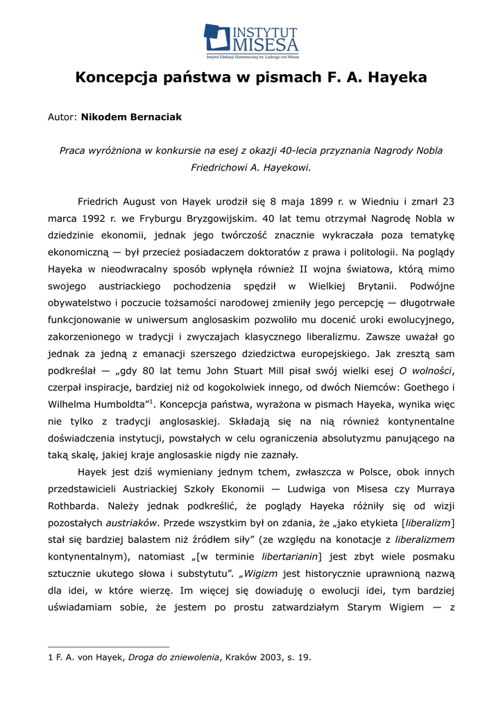 Koncepcja państwa w pismach F. A. Hayeka Autor: Nikodem Bernaciak Praca wyróżniona w konkursie na esej z okazji 40-lecia przyznania Nagrody Nobla Friedrichowi A. Hayekowi. Friedrich August von Hayek urodził się 8 maja 1899 r. w Wiedniu i zmarł 23 marca 1992 r. we Fryburgu Bryzgowijskim. 40 lat temu otrzymał Nagrodę Nobla w dziedzinie ekonomii, jednak jego twórczość znacznie wykraczała poza tematykę ekonomiczną — był przecież posiadaczem doktoratów z prawa i politologii. Na poglądy Hayeka w nieodwracalny sposób wpłynęła również II wojna światowa, którą mimo swojego austriackiego pochodzenia spędził w Wielkiej Brytanii. Podwójne obywatelstwo i poczucie tożsamości narodowej zmieniły jego percepcję — długotrwałe funkcjonowanie w uniwersum anglosaskim pozwoliło mu docenić uroki ewolucyjnego, zakorzenionego w tradycji i zwyczajach klasycznego liberalizmu. Zawsze uważał go jednak za jedną z emanacji szerszego dziedzictwa europejskiego. Jak zresztą sam podkreślał — „gdy 80 lat temu John Stuart Mill pisał swój wielki esej O wolności, czerpał inspiracje, bardziej niż od kogokolwiek innego, od dwóch Niemców: Goethego i Wilhelma Humboldta”1. Koncepcja państwa, wyrażona w pismach Hayeka, wynika więc nie tylko z tradycji anglosaskiej. Składają się na nią również kontynentalne doświadczenia instytucji, powstałych w celu ograniczenia absolutyzmu panującego na taką skalę, jakiej kraje anglosaskie nigdy nie zaznały. Hayek jest dziś wymieniany jednym tchem, zwłaszcza w Polsce, obok innych przedstawicieli Austriackiej Szkoły Ekonomii — Ludwiga von Misesa czy Murraya Rothbarda. Należy jednak podkreślić, że poglądy Hayeka różniły się od wizji pozostałych austriaków. Przede wszystkim był on zdania, że „jako etykieta [liberalizm] stał się bardziej balastem niż źródłem siły” (ze względu na konotacje z liberalizmem kontynentalnym), natomiast „[w terminie libertarianin] jest zbyt wiele posmaku sztucznie ukutego słowa i substytutu”. „Wigizm jest historycznie uprawnioną nazwą dla idei, w które wierzę. Im więcej się dowiaduję o ewolucji idei, tym bardziej uświadamiam sobie, że jestem po prostu zatwardziałym Starym Wigiem — z 1 F. A. von Hayek, Droga do zniewolenia, Kraków 2003, s. 19. naciskiem na starym”2 — pisał Hayek. Na początku lat 40. Hayek przestał pisać na tematy ekonomiczne i zajął się naukami politycznymi3. Od tej pory konsekwentnie starał się dostosowywać abstrakcyjne teorie ekonomiczne do realiów społeczno-politycznych takich, jakimi je widział. Dobitnie zaznacza odrębność od potocznie rozumianego leseferyzmu: „Chyba nic nie uczyniło większej szkody sprawie liberalizmu, jak tępe obstawanie niektórych liberałów przy pewnych prymitywnych regułach praktycznych; przede wszystkim zaś przy zasadzie laissez faire”4. „[Leseferyzm], jak samo to słowo wskazuje, należy również do francuskiej tradycji racjonalistycznej; i nigdy nie bronił go w jego dosłownym rozumieniu żaden z klasycznych angielskich ekonomistów. […] Ich argumenty jako takie nigdy w istocie nie były wymierzone w państwo, czyli anarchistyczne, co jest logiczną konsekwencją racjonalistycznej doktryny leseferyzmu; uwzględniały one zarówno właściwe funkcje państwa, jak i granice jego działania”5. Hayek nie jest więc wrogiem państwa. W swoich dziełach ściśle rozgranicza to pojęcie od rządu czy społeczeństwa. Właśnie wolne społeczeństwo jest dla niego punktem odniesienia. „Państwo, ucieleśnienie świadomie zorganizowanej i kierowanej władzy, powinno być tylko małą częścią znacznie bogatszego organizmu nazywanego społeczeństwem i powinno jedynie dostarczać ram prawnych, w obrębie których zasięg wolnej (a zatem nie świadomie kierowanej) współpracy ludzi jest maksymalny”6. Ani państwo, ani jednostka nie są uznawane za „jedyne realności” — po drodze istnieją jeszcze liczne ciała pośredniczące i stowarzyszenia. Niezwykle ważnym czynnikiem, który wg Hayeka stabilizuje funkcjonowanie wolnego społeczeństwa, jest tradycja. Przekonanie to odróżnia go jako liberała klasycznego od racjonalistycznego. Klasyczny liberał docenia wartość rodziny, a także rolę konwencji i lokalnych zwyczajów. Gotowość do podporządkowania się tym pozornie irracjonalnym regułom (o ile nie zostanie dowiedziona ich szkodliwość) skutecznie utrwalała więzi społeczne przez wieki — na długo nim zajęło się tym państwo. Wszystkie te niepisane systemy normatywne pozwalały grupom ludzi na „niezakłóconą i wydajną współpracę przy znacznie mniejszym poziomie formalnej 2 F. A. von Hayek, Dlaczego nie jestem konserwatystą [w:] Konstytucja wolności, Warszawa 2012, s. 387-389. 3 M. Skousen, Narodziny współczesnej ekonomii — żywoty i idee wielkich myślicieli, Warszawa 2012, s. 405. 4 F. A. von Hayek, Droga do zniewolenia, s. 29. 5 F. A. von Hayek, Konstytucja wolności, s. 70-71. 6 F. A. von Hayek, Indywidualizm i porządek ekonomiczny, Kraków 1998, s. 30. organizacji”7. Pretekstem do ich odrzucenia przez racjonalistów był fakt, że nie zostały zrodzone w umysłach konkretnych ludzi, tylko ewoluowały stopniowo. W konsekwencji nawet ustrój polityczny wolnego społeczeństwa opiera się na „spontanicznym i niepowstrzymanym rozwoju pewnych oczywistych zasad”8. Wolność to brak przymusu, a państwo otrzymało od wolnego społeczeństwa monopol na ten przymus9. To, że państwo obecnie przymusu tego nadużywa, nie uprawnia liberała do totalnej negacji jego istoty, która podlega zresztą nieustannej ewolucji. Hayek zdaje sobie sprawę z nieodwracalności pewnych zmian, na czele z rozpadem więzi sąsiedzkich, zwłaszcza w wielkich miastach. Jego skutkiem jest „rosnące oczekiwanie ochrony i zapewnienia bezpieczeństwa od bezosobowej siły państwa” ze strony jednostki, która „nie może już liczyć na osobiste zainteres