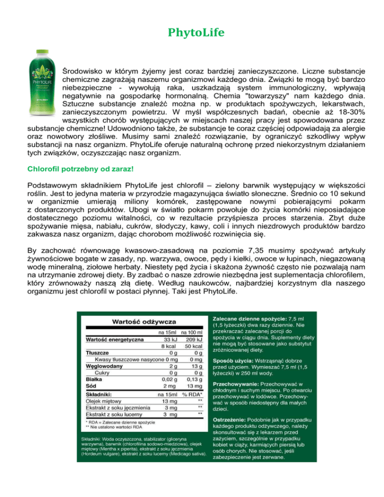 PhytoLife Środowisko w którym żyjemy jest coraz bardziej zanieczyszczone. Liczne substancje chemiczne zagrażają naszemu organizmowi każdego dnia. Związki te mogą być bardzo niebezpieczne - wywołują raka, uszkadzają system immunologiczny, wpływają negatywnie na gospodarkę hormonalną. Chemia "towarzyszy" nam każdego dnia. Sztuczne substancje znaleźć można np. w produktach spożywczych, lekarstwach, zanieczyszczonym powietrzu. W myśl współczesnych badań, obecnie aż 18-30% wszystkich chorób występujących w miejscach naszej pracy jest spowodowana przez substancje chemiczne! Udowodniono także, że substancje te coraz częściej odpowiadają za alergie oraz nowotwory złośliwe. Musimy sami znaleźć rozwiązanie, by ograniczyć szkodliwy wpływ substancji na nasz organizm. PhytoLife oferuje naturalną ochronę przed niekorzystnym działaniem tych związków, oczyszczając nasz organizm. Chlorofil potrzebny od zaraz! Podstawowym składnikiem PhytoLife jest chlorofil – zielony barwnik występujący w większości roślin. Jest to jedyna materia w przyrodzie magazynująca światło słoneczne. Średnio co 10 sekund w organizmie umierają miliony komórek, zastępowane nowymi pobierającymi pokarm z dostarczonych produktów. Ubogi w światło pokarm powołuje do życia komórki nieposiadające dostatecznego poziomu witalności, co w rezultacie przyśpiesza proces starzenia. Zbyt duże spożywanie mięsa, nabiału, cukrów, słodyczy, kawy, coli i innych niezdrowych produktów bardzo zakwasza nasz organizm, dając chorobom możliwość rozwinięcia się. By zachować równowagę kwasowo-zasadową na poziomie 7,35 musimy spożywać artykuły żywnościowe bogate w zasady, np. warzywa, owoce, pędy i kiełki, owoce w łupinach, niegazowaną wodę mineralną, ziołowe herbaty. Niestety pęd życia i skażona żywność często nie pozwalają nam na utrzymanie zdrowej diety. By zadbać o nasze zdrowie niezbędna jest suplementacja chlorofilem, który zrównoważy naszą złą dietę. Według naukowców, najbardziej korzystnym dla naszego organizmu jest chlorofil w postaci płynnej. Taki jest PhytoLife. Trzy główne funkcje chlorofilu Phytolife: Funkcja oczyszczająca: dobrze oczyszcza nasz przewód pokarmowy, wspomaga oczyszczanie krwi z toksyn, eliminuje bakterie, dezynfekuje i odtruwa organizm. Funkcja przywracająca równowagę w organizmie: utrzymuje równowagę kwasowo-zasadową naszego organizmu, usprawnia organizm. Funkcja odżywcza: wspomaga regenerację czerwonych krwinek, pobudza proces utleniania i stymuluje regenerację komórek w organizmie, odmładza skórę, pomaga w zachowaniu młodości ciała, kontroluje problemy skórne poprzez eliminację wolnych rodników. Zakwaszony organizm to chory organizm Zdaniem prof. Ragnar Berg, amerykańskiego eksperta ds. żywieniowych, utrzymanie zdrowia zależy od codziennej diety. Powinna składać się w 20% z produktów kwaśnych, a w 80% z pokarmów o odczynie zasadowym. W zdrowym ciele współczynnik pH powinien mieścić się w przedziale 7,3-7,4 co odpowiada odczynowi zasadowemu. Dieta bogata w żywność kwaśną w dłuższej perspektywie podniesienie kwasowość naszego organizmu (zakwaszając go), wywołując zaburzenia, stany zapalne, w tym choroby serca, zapalenie stawów, wyższe ciśnienie tętnicze, udary, cukrzycę, wysoki poziom cholesterolu itd. W obliczu wielu potencjalnych zagrożeń dla zdrowia, czyhających w żywności i napojach (ważna jest jakość wody pitnej), musimy zagwarantować sobie zdrową dietę, zapewniającą właściwy pobór substancji odżywczych. PhytoLife od SYNERGY WorldWide pobudza proces oczyszczania organizmu z toksyn. 1 łyżka stołowa chlorofilu (energii światła słonecznego) = spożyciu 1 kg zielonych warzyw Sposób użycia Dodaj 1 nakrętkę lub 1,5 łyżeczki PhytoLife do szklanki wody, dobrze wymieszaj i pij co najmniej 2 - 3 razy dziennie. Można go spożywać o każdej porze, ponieważ zapewnia niezbędne składniki odżywcze, wspomagające nasze zdrowie. Które osoby powinny pić PhytoLife? bardzo szczupłe, wychudzone, cierpiące na zatwardzenie, z bólami menstruacyjnymi, jedzące poza domem, posiadające jasną karnację, palące papierosy i pijące alkohol, wrażliwe na zimno, walczące z nieprzyjemnym zapachem ciała, nielubiące warzyw, z problemami z wagą, zajęte i zestresowane, przemęczone, cierpiące na zaburzenia wątroby, z zaburzeniami oddechowym, cierpiące na reumatyzm, z niedokrwistością, podatne na choroby gardła. Opinie Światowych Autorytetów Medycznych o chlorofilu Dr Richard Willstatter i Dr Hans Fisher otrzymali Nagrodę Nobla (w latach 1915 i 1930) w dziedzinie Medycyny i Chemii. Odkryli strukturę cząsteczkową ludzkiej krwinki czerwonej oraz chlorofilu. Badania wykazały, że chlorofil pobudza regenerację i wytwarzanie komórek oraz wspomaga rozbudowę układu odpornościowego. Nobliści udowodnili, że jedyną różnicą pomiędzy ludzką krwinką czerwoną, a chlorofilem jest fakt, że w centrum cząsteczki chlorofilu znajduje się atom magnezu, podczas gdy w krwince czerwonej jest to atom żelaza. W takim przypadku chlorofil może być przydatny przy anemii i innych stanach związanych z niedoborami krwi. Prof. Bernard Jensen, ekspert żywieniowy zauważył, że chlorofil pomaga przy obniżaniu stężenia toksyn pochodzących z pestycydów i leków, eliminując je z organizmu. Zdrowi ludzie mają wyższą zawartość krwinek niż chorzy. Tymczasem po spożyciu chlorofilu w grupie chorych zawartość krwinek również wzrosła, a stan zdrowia uległ poprawie. Naukowiec Offen Kranz wykazał, że chlorofil działa bardzo korzystnie na chorych z wrzodami żołądka. Chlorofil uzupełnia działanie leków na wrzody żołądka przepisywanych przez lekarzy. Rozwiązuje problemy związane ze skórą, polepsza stan cery. New England Medical Journal podaje, że chlorofil jest pomocny w leczeniu problemów skórnych, a także zakażeń wewn