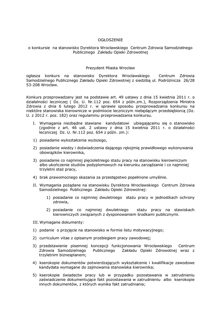 OG OSZENIE o konkursie na stanowisko Dyrektora Wroc awskiego Centrum Zdrowia Samodzielnego Publicznego Zak adu Opieki Zdrowotnej Prezydent Miasta Wroc aw og asza konkurs na stanowisko Dyrektora Wroc awskiego Centrum Zdrowia Samodzielnego Publicznego Zak adu Opieki Zdrowotnej z siedzib ul. Podró nicza 26/28 53-208 Wroc aw. Konkurs przeprowadzany jest na podstawie art. 49 ustawy z dnia 15 kwietnia 2011 r. o dzia alno ci leczniczej ( Dz. U. Nr.112 poz. 654 z pó n.zm.), Rozporz dzenia Ministra Zdrowia z dnia 6 lutego 2012 r. w sprawie sposobu przeprowadzania konkursu na niektóre stanowiska kierownicze w podmiocie leczniczym nieb cym przedsi biorc (Dz. U. z 2012 r. poz. 182) oraz regulaminu przeprowadzania konkursu. I. Wymagania niezb dne stawiane kandydatowi ubiegaj cemu si o stanowisko (zgodnie z art. 46 ust. 2 ustawy z dnia 15 kwietnia 2011 r. o dzia alno ci leczniczej Dz. U. Nr.112 poz. 654 z pó n. zm.): 1) posiadanie wykszta cenia wy szego, 2) posiadanie wiedzy i do wiadczenia daj cego r kojmi prawid owego wykonywania obowi zków kierownika, 3) posiadanie co najmniej pi cioletniego sta u pracy na stanowisku kierowniczym albo uko czenie studiów podyplomowych na kierunku zarz dzanie i co najmniej trzyletni sta pracy, 4) brak prawomocnego skazania za przest pstwo pope nione umy lnie. II. Wymagania po dane na stanowisku Dyrektora Wroc awskiego Centrum Zdrowia Samodzielnego Publicznego Zak adu Opieki Zdrowotnej: 1) posiadanie co najmniej dwuletniego zdrowia, sta u pracy w jednostkach ochrony 2) posiadanie co najmniej dwuletniego sta u pracy na stawiskach kierowniczych zwi zanych z dysponowaniem rodkami publicznymi. III. Wymagane dokumenty: 1) podanie o przyj cie na stanowisko w formie listu motywacyjnego; 2) curriculum vitae z opisanym przebiegiem pracy zawodowej; 3) przedstawienie pisemnej koncepcji funkcjonowania Wroc awskiego Centrum Zdrowia Samodzielnego Publicznego Zak adu Opieki Zdrowotnej wraz z trzyletnim biznesplanem; 4) kserokopie dokumentów potwierdzaj cych wykszta cenie i kwalifikacje zawodowe kandydata wymagane do zajmowania stanowiska kierownika; 5) kserokopie wiadectw pracy lub w przypadku pozostawania w zatrudnieniu za wiadczenie dokumentuj ce fakt pozostawania w zatrudnieniu albo kserokopie innych dokumentów, z których wynika fakt zatrudniania; 6) inne dokumenty lub ich kserokopie, w szczególno ci potwierdzaj ce dorobek i kwalifikacje zawodowe kandydata; 7) za wiadczenie o niekaralno ci z Krajowego Rejestru Karnego; 8) wiadczenie o wyra eniu zgody na przetwarzanie danych osobowych zawartych w ofercie pracy w celu przeprowadzenia post powania konkursowego na stanowisko Dyrektora Wroc awskiego Centrum Zdrowia Samodzielnego Publicznego Zak adu Opieki Zdrowotnej, zgodnie z ustaw z dnia 29 sierpnia 1997 r. o ochronie danych osobowych ( j. t. z 2002 r. Dz. U. Nr 101, poz. 926 z pó n .zm.). Koncepcja funkcjonowania Wroc awskiego Centrum Zdrowia Samodzielnego Publicznego Zak adu Opieki Zdrowotnej wraz z trzyletnim biznesplanem, powinna by dodatkowo za czona w formie elektronicznej, formacie PDF, na p ycie CD. wiadczenia winny by w asnor cznie podpisane. Kopie dokumentów, o których mowa w pkt. 4-6 powinny by po wiadczone za zgodno z orygina em, a na danie komisji konkursowej kandydat jest obowi zany przedstawi orygina y dokumentów. IV. Miejsce i termin sk adania wymaganych dokumentów Wymagane dokumenty aplikacyjne nale y sk ada w zamkni tej kopercie, z podaniem imienia i nazwiska oraz adresu i numeru telefonu kontaktowego z adnotacj o tre ci "Konkurs na stanowisko Dyrektora Wroc awskiego Centrum Zdrowia Samodzielnego Publicznego Zak adu Opieki Zdrowotnej” Dokumenty nale y z osobi cie w Wydziale Zdrowia i Spraw Spo ecznych Urz du Miejskiego Wroc awia ul. G.Zapolskiej 2/4 50-032 Wroc aw , pokój 347, w terminie do 8 kwietnia 2013 r. lub za po rednictwem poczty (w podwójnej kopercie) na adres Wydzia Zdrowia i Spraw Spo ecznych Urz du Miejskiego Wroc awia ul. G. Zapolskiej 2/4 50-032 Wroc aw (decyduje data wp ywu oferty do Urz du). V. Post powanie konkursowe przeprowadzi powo ana Komisja konkursowa. VI. Kandydaci zostan poinformowani o terminie przeprowadzenia rozmów kwalifikacyjnych telefonicznie lub e-mailem. VII. Przewidywany termin rozpatrzenia zg oszonych kandydatur - do 20 dni up ywu terminu sk adania dokumentów okre lonego w pkt. IV. od VIII. Informacja o wyniku konkursu zawieraj ca dane osobowe wybranego kandydata, zostanie podana do publicznej wiadomo ci w Biuletynie Informacji Publicznej Urz du Miejskiego Wroc awia i w Biuletynie Informacji Publicznej i na tablicy og osze w siedzibie Wroc awskiego Centrum Zdrowia Samodzielnego Publicznego Zak adu Opieki Zdrowotnej. IX. Udost pnienie materia ów informacyjnych Materia y informacyjne o stanie prawnym, organizacyjnym i ekonomicznym Wroc awskiego Centrum Zdrowia Samodzielnego Publicznego Zak adu Opieki Zdrowotnej udost pniane s dla zainteresowanych kandydatów za po rednictwem Komisji konkursowej reprezentowanej przez Joann Nyczak tel. kontaktowy Wydzia Zdrowia i Spraw Spo ecznych Urz du Miejskiego Wroc awia +48 71 777 77 60 w godzinach 9.00-15.00 Szczegó owe informacje dotycz ce konkursu mo na uzyska telefonicznie pod numerem +48 71 777 77 60.