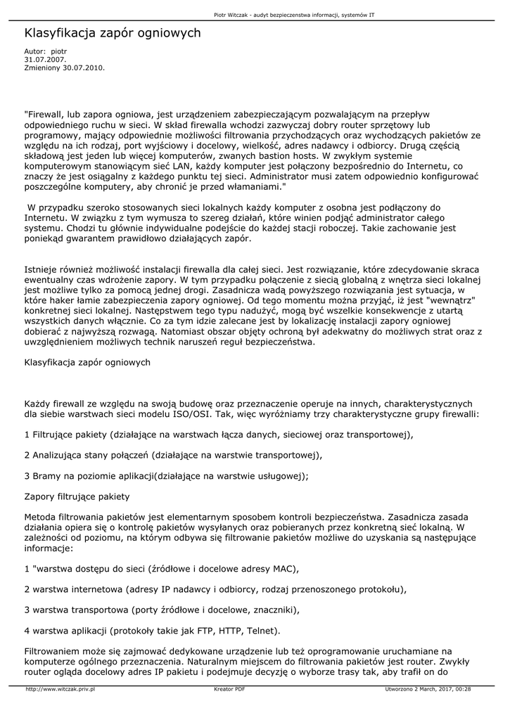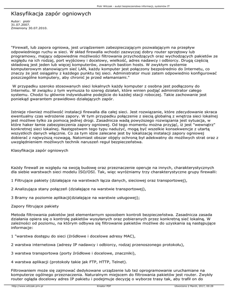 Piotr Witczak - audyt bezpieczenstwa informacji, systemów IT Klasyfikacja zapór ogniowych Autor: piotr 31.07.2007. Zmieniony 30.07.2010. "Firewall, lub zapora ogniowa, jest urządzeniem zabezpieczającym pozwalającym na przepływ odpowiedniego ruchu w sieci. W skład firewalla wchodzi zazwyczaj dobry router sprzętowy lub programowy, mający odpowiednie możliwości filtrowania przychodzących oraz wychodzących pakietów ze względu na ich rodzaj, port wyjściowy i docelowy, wielkość, adres nadawcy i odbiorcy. Drugą częścią składową jest jeden lub więcej komputerów, zwanych bastion hosts. W zwykłym systemie komputerowym stanowiącym sieć LAN, każdy komputer jest połączony bezpośrednio do Internetu, co znaczy że jest osiągalny z każdego punktu tej sieci. Administrator musi zatem odpowiednio konfigurować poszczególne komputery, aby chronić je przed włamaniami." W przypadku szeroko stosowanych sieci lokalnych każdy komputer z osobna jest podłączony do Internetu. W związku z tym wymusza to szereg działań, które winien podjąć administrator całego systemu. Chodzi tu głównie indywidualne podejście do każdej stacji roboczej. Takie zachowanie jest poniekąd gwarantem prawidłowo działających zapór. Istnieje również możliwość instalacji firewalla dla całej sieci. Jest rozwiązanie, które zdecydowanie skraca ewentualny czas wdrożenie zapory. W tym przypadku połączenie z siecią globalną z wnętrza sieci lokalnej jest możliwe tylko za pomocą jednej drogi. Zasadnicza wadą powyższego rozwiązania jest sytuacja, w które haker łamie zabezpieczenia zapory ogniowej. Od tego momentu można przyjąć, iż jest "wewnątrz" konkretnej sieci lokalnej. Następstwem tego typu nadużyć, mogą być wszelkie konsekwencje z utartą wszystkich danych włącznie. Co za tym idzie zalecane jest by lokalizację instalacji zapory ogniowej dobierać z najwyższą rozwagą. Natomiast obszar objęty ochroną był adekwatny do możliwych strat oraz z uwzględnieniem możliwych technik naruszeń reguł bezpieczeństwa. Klasyfikacja zapór ogniowych Każdy firewall ze względu na swoją budowę oraz przeznaczenie operuje na innych, charakterystycznych dla siebie warstwach sieci modelu ISO/OSI. Tak, więc wyróżniamy trzy charakterystyczne grupy firewalli: 1 Filtrujące pakiety (działające na warstwach łącza danych, sieciowej oraz transportowej), 2 Analizująca stany połączeń (działające na warstwie transportowej), 3 Bramy na poziomie aplikacji(działające na warstwie usługowej); Zapory filtrujące pakiety Metoda filtrowania pakietów jest elementarnym sposobem kontroli bezpieczeństwa. Zasadnicza zasada działania opiera się o kontrolę pakietów wysyłanych oraz pobieranych przez konkretną sieć lokalną. W zależności od poziomu, na którym odbywa się filtrowanie pakietów możliwe do uzyskania są następujące informacje: 1 "warstwa dostępu do sieci (źródłowe i docelowe adresy MAC), 2 warstwa internetowa (adresy IP nadawcy i odbiorcy, rodzaj przenoszonego protokołu), 3 warstwa transportowa (porty źródłowe i docelowe, znaczniki), 4 warstwa aplikacji (protokoły takie jak FTP, HTTP, Telnet). Filtrowaniem może się zajmować dedykowane urządzenie lub też oprogramowanie uruchamiane na komputerze ogólnego przeznaczenia. Naturalnym miejscem do filtrowania pakietów jest router. Zwykły router ogląda docelowy adres IP pakietu i podejmuje decyzję o wyborze trasy tak, aby trafił on do http://www.witczak.priv.pl Kreator PDF Utworzono 2 March, 2017, 00:28 Piotr Witczak - audyt bezpieczenstwa informacji, systemów IT miejsca swojego przeznaczenia. Router filtrujący rozważa dodatkowo pytanie czy powinien w ogóle przekazywać dany pakiet. Może on też podjąć decyzję o modyfikacji pakietu, podniesieniu alarmu lub też ewentualnej rejestracji zdarzenia. Odpowiedź na to pytanie znajduje w zdefiniowanych regułach filtrowania, a te z kolei powstają na podstawie ustalonej polityki bezpieczeństwa." Przy założeniu, iż wszelka konfiguracja została przeprowadzona z największą dokładnością możliwe jest uzyskania pełnego dostępu do przepływających pakietów. Należy również zwrócić uwagę na fakt, iż reguły filtrowania są często trudne do wdrożenia. Istnieją również pewne ograniczenia w konfiguracji zapór wynikające bezpośrednio z przyjętej przez konkretną firmę/organizację pewnej polityki prywatności. Dodatkowym utrudnieniem jest sytuacja, w które filtrowaniu zostaje poddana zbyt duża ilość pakietów. Prowadzi to do znacznie przekroczonej zalecanej obciążalności routera. Z reguły najprostsze metody filtrowania ograniczają się do kontroli: 1 przypuszczalnego adres źródłowego, 2 adresu docelowego, 3 numeru portu. Bramy na poziomie aplikacji "Te firewalle (nazywane również firewallami proxy) są pakietami oprogramowania zainstalowanymi na systemach operacyjnych o ogólnym zastosowaniu (np.: Windows NT czy UNIX) lub urządzeniach typu firewall. Taki firewall ma wiele interfejsów: osobny do każdej sieci, do której jest podłączony. Zestaw reguł strategii określa sposób, w jaki ruch z jednej sieci przechodzi di drugiej. Jeśli reguła nie zezwala jasno na przepływ danych informacji, to firewall odmówi lub odrzuci przekaz. Reguły strategii egzekwowane są za pomocą programów pośredniczących (proxy). Najlepsze programy pośredniczące są takie, które zostały stworzone dla konkretnych protokołów. Na przykład proxy dla FTP rozpoznaje protokół FTP i może stwierdzić, czy ruch przepływający jest zgodny z protokołem i dozwolony przez reguły strategii." Firewalle na poziomie aplikacji skuteczność swojego działania opierają głównie na kontroli typu, a także objętości danych, które są wysyłane lub pobierane przez konkretną sieć lokalną. Ponieważ fizycznie rozgraniczają wewnętrzną sieć lokalną i sieć globalną efektywność działania tego typu zapór istotnie zwięk