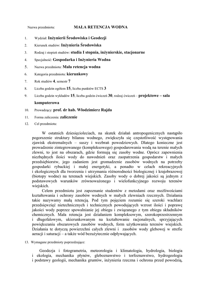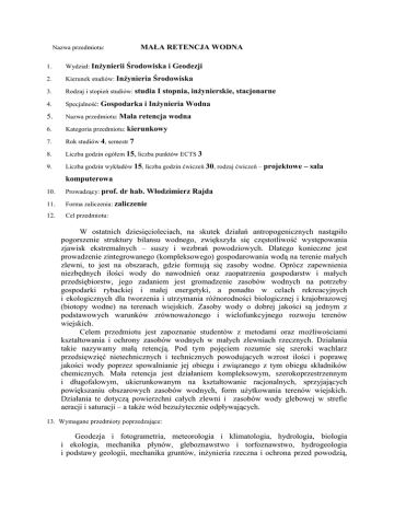 MAŁA RETENCJA WODNA Nazwa przedmiotu: 1. Wydział: InŜynierii Środowiska i Geodezji 2. Kierunek studiów: InŜynieria 3. Rodzaj i stopień studiów: studia 4. Specjalność: Gospodarka 5. Nazwa przedmiotu: Mała 6. Kategoria przedmiotu: kierunkowy 7. Rok studiów 4, semestr 7 8. Liczba godzin ogółem 15, liczba punktów ECTS 3 9. Liczba godzin wykładów 15, liczba godzin ćwiczeń 30, rodzaj ćwiczeń – projektowe Środowiska I stopnia, inŜynierskie, stacjonarne i InŜynieria Wodna retencja wodna – sala komputerowa 10. Prowadzący: prof. dr hab. Włodzimierz Rajda 11. Forma zaliczenia: zaliczenie 12. Cel przedmiotu: W ostatnich dziesięcioleciach, na skutek działań antropogenicznych nastąpiło pogorszenie struktury bilansu wodnego, zwiększyła się częstotliwość występowania zjawisk ekstremalnych – suszy i wezbrań powodziowych. Dlatego konieczne jest prowadzenie zintegrowanego (kompleksowego) gospodarowania wodą na terenie małych zlewni, to jest na obszarach, gdzie formują się zasoby wodne. Oprócz zapewnienia niezbędnych ilości wody do nawodnień oraz zaopatrzenia gospodarstw i małych przedsiębiorstw, jego zadaniem jest gromadzenie zasobów wodnych na potrzeby gospodarki rybackiej i małej energetyki, a ponadto w celach rekreacyjnych i ekologicznych dla tworzenia i utrzymania róŜnorodności biologicznej i krajobrazowej (biotopy wodne) na terenach wiejskich. Zasoby wody o dobrej jakości są jednym z podstawowych warunków zrównowaŜonego i wielofunkcyjnego rozwoju terenów wiejskich. Celem przedmiotu jest zapoznanie studentów z metodami oraz moŜliwościami kształtowania i ochrony zasobów wodnych w małych zlewniach rzecznych. Działania takie nazywamy małą retencją. Pod tym pojęciem rozumie się szeroki wachlarz przedsięwzięć nietechnicznych i technicznych powodujących wzrost ilości i poprawę jakości wody poprzez spowalnianie jej obiegu i związanego z tym obiegu składników chemicznych. Mała retencja jest działaniem kompleksowym, szerokoprzestrzennym i długofalowym, ukierunkowanym na kształtowanie racjonalnych, sprzyjających powiększaniu obszarowych zasobów wodnych, form uŜytkowania terenów wiejskich. Działania te dotyczą powierzchni całych zlewni i zasobów wody glebowej w strefie aeracji i saturacji – a takŜe wód bezuŜytecznie odpływających. 13. Wymagane przedmioty poprzedzające: Geodezja i fotogrametria, meteorologia i klimatologia, hydrologia, biologia i ekologia, mechanika płynów, gleboznawstwo i torfoznawstwo, hydrogeologia i podstawy geologii, mechanika gruntów, inŜynieria rzeczna i ochrona przed powodzią, budownictwo wodne, odwadnianie terenów rolnych, melioracje, grawitacyjne i ciśnieniowe, podstawy informatyki (program Map-Info). nawadnianie 14. Streszczenie programu (główna zawartość): Program obejmuje treści dotyczące metod i środków nie technicznych i technicznych, zmierzających do zwiększania retencji gruntowej i powierzchniowej – jednego z zasadniczych elementów bilansu wodnego zlewni rolniczych. 15. Szczegółowy program przedmiotu (kursu) z rozplanowaniem godzinowym: − wykłady: 15 godzin Zasoby wodne a rolnictwo i środowisko przyrodnicze; zasoby wodne Polski 1. – wody powierzchniowe, wody podziemne (gruntowe), wody glebowe ZagroŜenia powodowane czynnikiem wodnym, wynikające z niedoboru i 2. nadmiaru wody Prognoza zmian potrzeb wodnych w rolnictwie, jakość wód 3. powierzchniowych i gruntowych ZałoŜenia gospodarowania wodą w małych zlewniach rolniczych, a funkcje 4. przyrodnicze i rolnicze obszarów wiejskich Metody retencjonowania zasobów wodnych; rodzaje i formy małej retencji: − retencja krajobrazowa, 5. − retencja glebowa, − retencja wód powierzchniowych i gruntowych Rola obszarów podmokłych w kształtowaniu zasobów wodnych zlewni 6. rzecznej Wpływ systemów melioracyjnych na retencję zlewni – drenowanie gruntów 7. ornych, dolinowe systemy melioracyjne Rodzaje zabiegów agro- i fitomelioracyjnych i ich znaczenie dla gospodarowania wodą w rolniczej przestrzeni produkcyjnej oraz ich wpływ na poprawę retencji glebowej i właściwości fizyko-wodnych gleb: 8. − charakterystyka zabiegów agromelioracyjnych, − kompleksy gleb wymagających wykonania zabiegów agromelioracyjnych 9. Proretencyjne zagospodarowanie małych zlewni rolniczych Małe zbiorniki gospodarcze, rekreacyjne, przeciwerozyjne (kolmatacyjne) i 10. przeciwpowodziowe, ich cechy oraz znaczenie krajobrazowe i ekologiczne Zasilanie sztucznych akwenów wodnych – z przepływów aktualnych, ze 11. spływów powierzchniowych, przez wody gruntowe, z systemów drenarskich Topograficzne i przestrzenne podstawy lokalizacji i bilans wodny małego 12. akwenu 13. Badania i pomiary przy zakładaniu małych akwenów wodnych Elementy technologii budowy, eksploatacji i konserwacji akwenów 14. wodnych Wpływ małego zbiornika na środowisko i gospodarowanie wodą w małej 15. zlewni 1 godz. 1 godz. 1 godz. 1 godz. 1 godz. 1 godz. 1 godz. 1 godz. 1 godz. 1 godz. 1 godz. 1 godz. 1 godz. 1 godz. 1 godz. − Ćwiczenia – 30 godzin. Opracowanie studium do proretencyjnego zagospodarowania małej zlewni rolniczej Oszacowanie moŜliwości zwiększenia retencji wody w glebie poprzez zmianę poziomu wody gruntowej – na podstawie stałych charakterystyk wodnych profilu glebowego 1. Charakterystyczne stany uwilgotnienia gleb; pełna pojemność wodna, polowa pojemność wodna, pojemność wodna okresu suszy, wilgotność więdnięcia, ociekalność, wysychalność, objętość rezerw przejściowych w profilu glebowym z płytko połoŜonym zwierciadłem wody gruntowej 2 godz. 2. Obliczenie porowatości ogólnej (no) zapasu całkowitego (Zc) oraz odciekalności (Qh) i objętości rezerw przejściowych (Vh) dla róŜnych głębokości zwierciadła wody gruntowej. Wykreślenie krzywych odciekalności i objętości rezerw przejściowych. 2 godz. 3. Opracowanie i wykreślenie trójfazowego modelu profilu gleby. Ob
