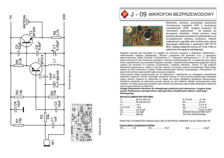 JABEL ® J - 09 MIKROFON BEZPRZEWODOWY Elementy zestawu pozwalaj¹ zbudowaæ miniaturowy nadajnik UKF z modulacj¹ czêstotliwoœci (FM), mog¹cy pos³u¿yæ do rozmaitych zastosowañ - od zabawy po strze¿enie obiektów. Uk³ad pomimo swej prostoty odznacza siê dobrymi parametrami, a w szczególnoœci wysok¹ czu³oœci¹. Odbiór nadawanych sygna³ów jest mo¿liwy przy u¿yciu dowolnego odbiornika z zakresem UKF 67-73 MHz. Zasiêg nadajnika wynosi od 10 do 100m w zale¿noœci od napiêcia zasilaj¹cego. Schemat ideowy Zasilanie sieciowe jest k³opotliwe ze wzglêdu na trudnoœci zwi¹zane z dok³adnym odk³óceniem i odfiltrowaniem napiêcia zasilaj¹cego. „Sercem” urz¹dzenia jest generator w.cz. o sprzê¿eniu pojemnoœciowym (uk³ad Colpitsa) z tranzystorem T1 i obwodem rezonansowym L1 ,CT ,D1. Dioda pojemnoœciowa D1 jest sterowana sygna³em z mikrofonu elektretowego M1, co zapewnia du¿y zakres zmian czêstotliwoœci przy niewielkim natê¿eniu dŸwiêku. Czêstotliwoœæ podstawow¹ nadajnika (noœn¹) ustawia siê trymerem CT podczas uruchamiania i strojenia mikrofonu. Trymer CT jest jedynym elementem regulacyjnym, cewka L1 jest bez rdzenia i ma postaæ obwodu drukowanego. Rolê anteny spe³nia ok.30cm przewodu w izolacji. Dziêki zastosowaniu obwodu separuj¹cego z tranzystorem T2, pojemnoœci anteny maj¹ niewielki wp³yw na pracê nadajnika. Uruchomienie uk³adu przeprowadza siê na w³¹czonym i nastrojonym na wymagan¹ czêstotliwoœæ odbiorniku radiowym. Powoli zmieniaj¹c ustawienie trymera CT (przy pomocy plastikowego wkrêtaka) nale¿y dostroiæ nadajnik do odbiornika co objawi siê silnym dŸwiêkiem sprzê¿enia akustycznego. Oddalenie nadajnika od odbiornika pozwoli s³yszeæ na tym ostatnim dŸwiêki wychwytywane przez mikrofon. W miarê zu¿ywania siê baterii mo¿e okazaæ siê konieczna ma³a korekta dostrojenia, której tym razem mo¿na dokonaæ w odbiorniku. Uwaga! Stosowanie mikrofonu do nielegalnego pods³uchu jest zabronione i œcigane przez prawo! Podstawowe wymogi kultury nakazuj¹ tak¿e niezak³ócanie odbioru radiowego i telewizyjnego. Rysunek p³ytki WYKAZ ELEMENTÓW ZESTAWU: T1.......................BF414,440,441 T2.......................BF199,240,241 C1.......................1nF C2,C3,C6............10nF C4.......................6,8-8,2pF C5.......................22-33pF D1.......................BB105 R1,R3,R4............10-15kW R2.......................22-47kW R5.......................3,3-4,7kW R6.......................1,5-3,3kW CT......................Trymer 5-25pF MIKROFON ELEKTRETOWY P£YTKA DRUKOWANA WARTOŒCI ELEMENTÓW ZNAJDUJ¥CE SIÊ W ZESTAWIE DOBRANE S¥ DO ZASILANIA 9V. OZNACZENIA KONDENSATORÓW: 102................1nF 103......................10nF 6p8.........................6,8pF