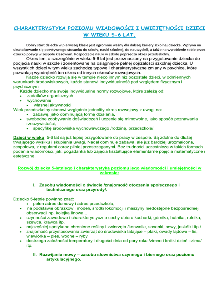 CHARAKTERYSTYKA POZIOMU WIADOMOŚCI I UMIEJĘTNOŚCI DZIECI W WIEKU 5-6 LAT. Dobry start dziecka w pierwszej klasie jest ogromnie ważny dla dalszej kariery szkolnej dziecka. Wpływa na ukształtowanie się pozytywnego stosunku do szkoły, nauki szkolnej, do nauczycieli, a także na wyrobienie sobie przez dziecko pozycji w zespole klasowym. Rozpoczęcie nauki w szkole poprzedza okres przedszkolny. Okres ten, a szczególnie w wieku 5-6 lat jest przeznaczony na przygotowanie dziecka do podjęcia nauki w szkole i zorientowane na osiągnięcie pełnej dojrzałości szkolnej dziecka. U wszystkich dzieci w tym wieku zachodzą typowe i charakterystyczne zmiany w psychice, które pozwalają wyodrębnić ten okres od innych okresów rozwojowych. Każde dziecko rozwija się w tempie nieco innym niż pozostałe dzieci, w odmiennych warunkach środowiskowych, każde stanowi indywidualność pod względem fizycznym i psychicznym. Każde dziecko ma swoje indywidualne normy rozwojowe, które zależą od: zadatków organicznych wychowanie własnej aktywności Wiek przedszkolny stanowi względnie jednolity okres rozwojowy z uwagi na: zabawę, jako dominującą formę działania, swobodne zdobywanie doświadczeń i uczenie się mimowolne, jako sposób poznawania rzeczywistości, specyfikę środowiska wychowawczego /rodzinę, przedszkole/. Dzieci w wieku 5-6 lat są już lepiej przygotowane do pracy w zespole. Są zdolne do dłużej trwającego wysiłku i skupienia uwagi. Nadal dominuje zabawa, ale już bardziej urozmaicona, zespołowa, z regułami coraz pilniej przestrzeganymi. Bez trudności uczestniczą w takich formach podania wiadomości, jak: pogadanka lub zajęcia kształtujące elementarne pojęcia matematyczne i estetyczne. Rozwój dziecka 5-letniego i charakterystyka poziomu jego wiadomości i umiejętności w zakresie: I. Zasobu wiadomości o świecie /znajomość otoczenia społecznego i technicznego oraz przyrody/. Dziecko 5-letnie powinno znać: pełen adres domowy i adres przedszkola, na podstawie obrazków i modeli, środki lokomocji i maszyny niedostępne bezpośredniej obserwacji np. kolejka linowa... czynności zawodowe i charakterystyczne cechy ubioru kucharki, górnika, hutnika, rolnika, szewca, krawca itp. najczęściej spotykane chronione rośliny i zwierzęta /konwalie, sosenki, sowy, jaskółki itp./ znajomość przystosowania zwierząt do środowiska latające – ptaki, owady lądowe – lis, wiewiórka – pies, wodne – ryby dostrzega zależności temperatury i długości dnia od pory roku /zimno i krótki dzień –zima/ itp. II. Rozwijanie mowy – zasobu słownictwa czynnego i biernego oraz poziomu artykulacyjnego. III. Zasób słownictwa rozszerzony o treści niedostępne bezpośredniej obserwacji ilustrowane obrazem, wyodrębnienie elementów akcji, stosowanie poprawnych form fleksyjnych wszystkich odmiennych części mowy, posługiwanie się liczebnikami przymiotnikami, spójnikami i przyimkami. Poziomu sprawności analizatorów /umiejętność dokonywania analizy i syntezy wzrokowej i słuchowej, ocena słuchu fonematycznego/. potrafi złożyć prostokąt z dwóch trójkątów w/g wzoru, potrafi uzupełnić brakujące elementy w postaci człowieka, umie naśladować słyszane głosy z otoczenia, wyodrębnić głoski w wyrazie zwłaszcza w głosie, różnicuje wyrazy z opozycjami ze względu na stopień zbliżenia narządów mowy /kos-koc, płotek-młotek, pies-piec, nos-noc, ząb-dąb. IV. Rozwijanie motoryki. Ogólna sprawność motoryczna potrafi pobiec do góry po schodach nie trzymając się poręczy potrafi iść na plecach na odległości 3 m nie dotykając ani razu piętami podłogi potrafi skakać na jednej nodze prosto przed siebie na odległości 5m Sprawność manualna potrafi wykonać pojedynczy węzełek wg pokazu i wzoru, potrafi wyciąć figury płaskie /kwadrat, koło/ i wyciąć z materiału, buduje samorzutnie złożone budowle z klocków, Sprawność grafomotoryczna potrafi odwzorować romb rysuje postać ludzką „an face” uwzględniając podstawowe elementy V. VI. Znajomości stosunków ilościowych, jakościowych i orientacji w przestrzeni. klasyfikacja zbiorów wg ich liczebności, porównanie zbiorów dwóch różnych przez łączenie w pary po jednym elemencie z każdego zbioru ważenie za pomocą wagi szalkowej /trzeba dodać - za mało, trzeba odsypać - za dużo/ porównanie wielkości przedmiotów 3 stopnie np. mały-mniejszy-najmniejszy używanie nazw figur geometrycznych /koło, kwadrat, prostokąt, trójkąt/ klasyfikowanie zbiorów wg cech jakościowych podział zbioru na podzbiory wg różnych właściwości elementów położenie w przestrzeni – na prawo, na lewo, naprzeciw, kierunek – w lewo, w prawo. Poziomu myślenia. Rozumienie związków czasowych i przyczynowo–skutkowych. przyswojenie określeń czasu: rano, południe, wieczór, dzisiaj, wczoraj, jutro nazywanie dni tygodnia, aktualnej pory roku porównanie tempa wykonywanej czynności: prędko-prędzej-najprędzej, wolno-wolniejnajwolniej Wykonywanie działań arytmetycznych liczenie elementów zbioru do sześciu, odwzorowanie zbiorów za pomocą liczmanów lub znaków graficznych porządkowanie układów zbiorów /w zakresie 6/ wg ich liczebności wzrastających lub malejących, posługiwanie się liczebnikami porządkowymi do „szósty”. Rozwój dziecka 6-letniego Rozwój umysłowy 1. M o w a : Każde dziecko 6 letnie przed rozpoczęciem właściwej nauki czytania powinno poprawnie i dokładnie wymawiać wszystkie głoski wypowiedziane pojedynczo, jak również w wyrazach i zdaniach. 2. W i a d o m o ś c i : Powinno mieć tak bogate słownictwo, żeby wyrazić proste treści, opisywać obrazki zdaniami nie robiąc błędów gramatycznych. Z własnej inicjatywy zadają pytania i odpowiadają na pytania. Posiada odpowiedni zasób wiadomości o środowisku społeczno – przyrodniczym. Zna i wie, co robią ludzie takich zawodów jak: lekarz, górnik, nauczyciel, rol
