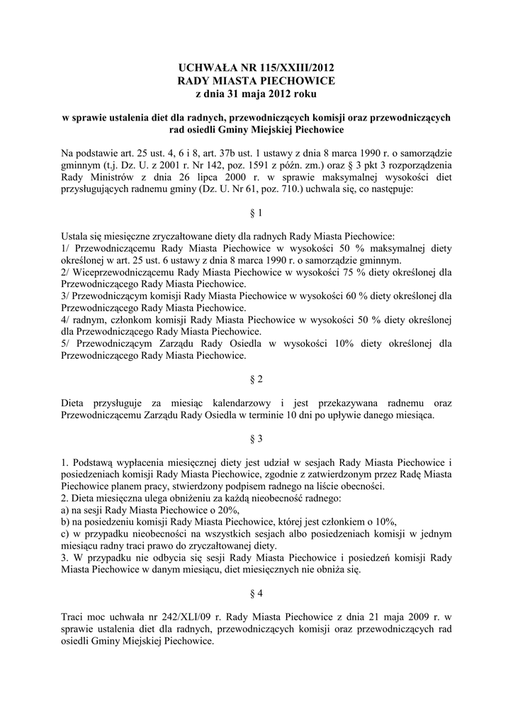 UCHWAŁA NR 115/XXIII/2012 RADY MIASTA PIECHOWICE z dnia 31 maja 2012 roku w sprawie ustalenia diet dla radnych, przewodniczących komisji oraz przewodniczących rad osiedli Gminy Miejskiej Piechowice Na podstawie art. 25 ust. 4, 6 i 8, art. 37b ust. 1 ustawy z dnia 8 marca 1990 r. o samorządzie gminnym (t.j. Dz. U. z 2001 r. Nr 142, poz. 1591 z późn. zm.) oraz § 3 pkt 3 rozporządzenia Rady Ministrów z dnia 26 lipca 2000 r. w sprawie maksymalnej wysokości diet przysługujących radnemu gminy (Dz. U. Nr 61, poz. 710.) uchwala się, co następuje: §1 Ustala się miesięczne zryczałtowane diety dla radnych Rady Miasta Piechowice: 1/ Przewodniczącemu Rady Miasta Piechowice w wysokości 50 % maksymalnej diety określonej w art. 25 ust. 6 ustawy z dnia 8 marca 1990 r. o samorządzie gminnym. 2/ Wiceprzewodniczącemu Rady Miasta Piechowice w wysokości 75 % diety określonej dla Przewodniczącego Rady Miasta Piechowice. 3/ Przewodniczącym komisji Rady Miasta Piechowice w wysokości 60 % diety określonej dla Przewodniczącego Rady Miasta Piechowice. 4/ radnym, członkom komisji Rady Miasta Piechowice w wysokości 50 % diety określonej dla Przewodniczącego Rady Miasta Piechowice. 5/ Przewodniczącym Zarządu Rady Osiedla w wysokości 10% diety określonej dla Przewodniczącego Rady Miasta Piechowice. §2 Dieta przysługuje za miesiąc kalendarzowy i jest przekazywana radnemu oraz Przewodniczącemu Zarządu Rady Osiedla w terminie 10 dni po upływie danego miesiąca. §3 1. Podstawą wypłacenia miesięcznej diety jest udział w sesjach Rady Miasta Piechowice i posiedzeniach komisji Rady Miasta Piechowice, zgodnie z zatwierdzonym przez Radę Miasta Piechowice planem pracy, stwierdzony podpisem radnego na liście obecności. 2. Dieta miesięczna ulega obniŜeniu za kaŜdą nieobecność radnego: a) na sesji Rady Miasta Piechowice o 20%, b) na posiedzeniu komisji Rady Miasta Piechowice, której jest członkiem o 10%, c) w przypadku nieobecności na wszystkich sesjach albo posiedzeniach komisji w jednym miesiącu radny traci prawo do zryczałtowanej diety. 3. W przypadku nie odbycia się sesji Rady Miasta Piechowice i posiedzeń komisji Rady Miasta Piechowice w danym miesiącu, diet miesięcznych nie obniŜa się. §4 Traci moc uchwała nr 242/XLI/09 r. Rady Miasta Piechowice z dnia 21 maja 2009 r. w sprawie ustalenia diet dla radnych, przewodniczących komisji oraz przewodniczących rad osiedli Gminy Miejskiej Piechowice. §5 Wykonanie uchwały powierza się Burmistrzowi Miasta Piechowice. §6 Uchwała wchodzi w Ŝycie z dniem 01 czerwca 2012 roku. UZASADNIENIE Podjęcie w/w uchwały spowodowane jest błędnym zapisem w § 1 pkt 5: „Przewodniczącym Rad Osiedla”. Zgodnie ze Statutami Rad Osiedli Gminy Miejskiej Piechowice nie ma Przewodniczącego Rady Osiedla, jest Przewodniczący Zarządu Osiedla. Zatem, aby mogła być wypłacana dieta Przewodniczącemu Zarządu Rady Osiedla naleŜało zmienić w/w zapis. Pozostałe zmiany polegały na doprecyzowaniu zapisów w/w uchwały.