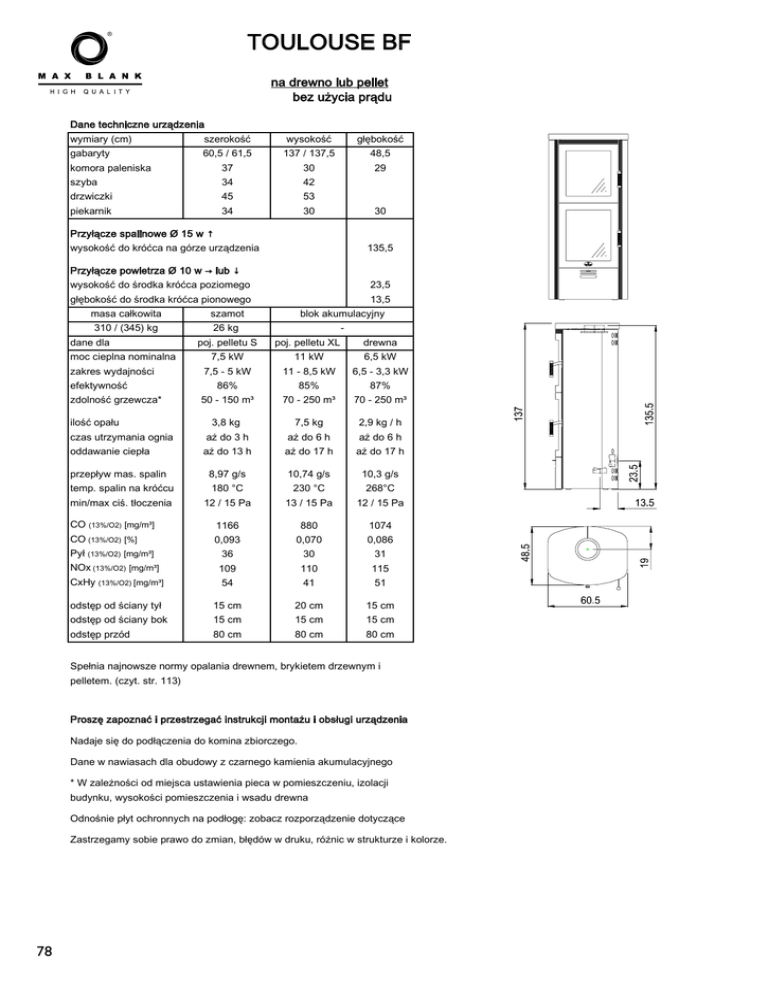 TOULOUSE BF na drewno lub pellet bez użycia prądu Dane techniczne urządzenia wymiary (cm) szerokość wysokość głębokość gabaryty 60,5 / 61,5 137 / 137,5 48,5 komora paleniska 37 30 29 szyba 34 42 drzwiczki 45 53 piekarnik 34 30 30 Przyłącze spalinowe Ø 15 w ↑ wysokość do króćca na górze urządzenia 135,5 Przyłącze powietrza Ø 10 w → lub ↓ wysokość do środka króćca poziomego 23,5 głębokość do środka króćca pionowego masa całkowita 310 / (345) kg dane dla moc cieplna nominalna zakres wydajności efektywność zdolność grzewcza* ilość opału 13,5 szamot blok akumulacyjny 26 kg - poj. pelletu S poj. pelletu XL 7,5 kW 11 kW drewna 6,5 kW 7,5 - 5 kW 11 - 8,5 kW 6,5 - 3,3 kW 86% 85% 87% 50 - 150 m³ 70 - 250 m³ 70 - 250 m³ 2,9 kg / h 3,8 kg 7,5 kg czas utrzymania ognia aż do 3 h aż do 6 h aż do 6 h oddawanie ciepła aż do 13 h aż do 17 h aż do 17 h przepływ mas. spalin 8,97 g/s 10,74 g/s 10,3 g/s temp. spalin na króćcu 180 °C 230 °C 268°C min/max ciś. tłoczenia 12 / 15 Pa 13 / 15 Pa 12 / 15 Pa CO (13%/O2) [mg/m³] 1166 880 1074 CO (13%/O2) [%] 0,086 0,093 0,070 Pył (13%/O2) [mg/m³] 36 30 31 NOx (13%/O2) [mg/m³] 109 110 115 CxHy (13%/O2) [mg/m³] 54 41 51 odstęp od ściany tył 15 cm 20 cm 15 cm odstęp od ściany bok 15 cm 15 cm 15 cm odstęp przód 80 cm 80 cm 80 cm Spełnia najnowsze normy opalania drewnem, brykietem drzewnym i pelletem. (czyt. str. 113) Proszę zapoznać i przestrzegać instrukcji montażu i obsługi urządzenia Nadaje się do podłączenia do komina zbiorczego. Dane w nawiasach dla obudowy z czarnego kamienia akumulacyjnego * W zależności od miejsca ustawienia pieca w pomieszczeniu, izolacji budynku, wysokości pomieszczenia i wsadu drewna Odnośnie płyt ochronnych na podłogę: zobacz rozporządzenie dotyczące Zastrzegamy sobie prawo do zmian, błędów w druku, różnic w strukturze i kolorze. 78 Warianty pieca akumulacyjnego piekarnikiem Toulouse BF ENR 177-2002 Model Toulouse BF ↑ dostawa 3 ∙ front antracyt ∙ boki i pokrywa 177-2017 z rzeźbionego szarego kamienia naturalnego Toulouse BF ↑ 3 ∙ front antracyt ∙ boki i pokrywa 177-2006 z jasnoszarego błyszczącego kamienia naturalnego Toulouse BF ↑ 3 ∙ front antracyt ∙ boki i pokrywa 177-2013 z kremowego błyszczącego kamienia naturalnego Toulouse BF ↑ 4 ∙ front antracyt ∙ boki i pokrywa 177-2020 z piaskowca Toulouse BF ↑ 4 ∙ front antracyt ∙ boki i pokrywa z czarnego gładkiego kamienia naturalnego o wysokiej wydajności akumulowania ciepła Akcesoria 552-2014 pojemnik na pellet S - 7,5 kW 552-2004 pojemnik na pellet XL - 11 kW patrz opis po lewej stronie ∙ z odpornej na temperaturę stali szlachetnej ∙ przy pojemniku S z 2 a przy pojemniku XL z 3 specjalnymi czarnymi szybami Ceran ∙ z zapalniczką, rękawicami silikonowymi torbą filcową na pellet o pojemności do 20 kg, pędzlem do czyszczenia, szufelką do pelletu 29 119 311 płyta ze stali szlachetnej (patrz str. 104) 29 119 400 płyta ze szkła (patrz str. 104) Dodatkowo, bez dopłaty w zakresie dostawy: 308 046 blacha do pieczenia i duszenia 308 047 chromowany ruszt 308 074 łatwy w pielęgnacji kamień piekarnika- antracyt 308 057 termometr piekarnika Możliwe doprowadzenie powietrza z zewnątrz: Proszę podać koniecznie przy zamówieniu: przyłącze powietrza poziomo czy pionowo (w zestawie) (w zestawie) Pozostałe akcesoria przyłączeniowe patrz od str. 98 Cechy szczególne modelu Toulouse BF Akcesoria do pelletu/drewna, ogrzewanie 2 rodzajami ognia, niezależne i bez użycia elektryczności. Szybkie i łatwe przestawienie między pelletem a drewnem w zaledwie pięć minut. Odkryj specjalne cechy naszego tego wielofunkcyjnego i romantycznego kominka na YouTube. Rodzaj opału do wyboru, drewno kominkowe lub pellet, sprawia, że jesteście Państwo jeszcze bardziej niezależni i oferuje Państwu możliwość nabycia tego paliwa, które jest w danej chwili tańsze. Piec akumulacyjny - piekarnik, model Toulouse BF ∙ model piekarnika z dużą wydajnością akumulowania ciepła ∙ 5-krotna korzyść: do ogrzania się +do magazynowania ciepła +do odprężenia +do przechowywania drewna +do p ∙ duży piekarnik z kamienną podstawą umożliwia pieczenie i duszenie nad ogniem i pozwala na bezpłatne wykorzystanie energii do: duszenia: pieczeni wieprzowych, kaczek, rolad itp. pieczenia: chleba, warzywnego lasagne, pizzy, ciasta itp. ∙ ściany piekarnika ze stali szlachetnej z 2 półkami ∙ łatwy w pielęgnacji kamień piekarnika- antracyt ∙ szuflada na drewno kominkowe (w przypadku wykorzystania pionowego przyłącza powietrza pojemność jest ograniczona) Proszę zapoznać się z właściwościami kamienia naturalnego na str. 110! www.maxblank.com