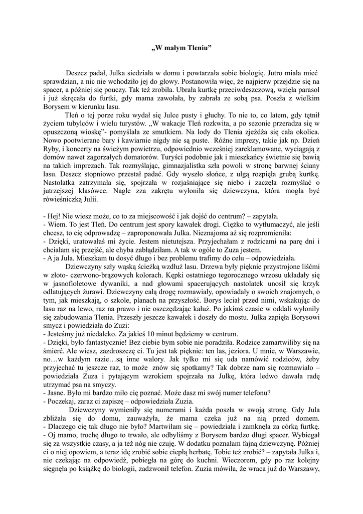 „W małym Tleniu” Deszcz padał, Julka siedziała w domu i powtarzała sobie biologię. Jutro miała mieć sprawdzian, a nic nie wchodziło jej do głowy. Postanowiła więc, że najpierw przejdzie się na spacer, a później się pouczy. Tak też zrobiła. Ubrała kurtkę przeciwdeszczową, wzięła parasol i już skręcała do furtki, gdy mama zawołała, by zabrała ze sobą psa. Poszła z wielkim Borysem w kierunku lasu. Tleń o tej porze roku wydał się Julce pusty i głuchy. To nie to, co latem, gdy tętnił życiem tubylców i wielu turystów. „W wakacje Tleń rozkwita, a po sezonie przeradza się w opuszczoną wioskę”- pomyślała ze smutkiem. Na lody do Tlenia zjeżdża się cała okolica. Nowo pootwierane bary i kawiarnie nigdy nie są puste. Różne imprezy, takie jak np. Dzień Ryby, i koncerty na świeżym powietrzu, odpowiednio wcześniej zareklamowane, wyciągają z domów nawet zagorzałych domatorów. Turyści podobnie jak i mieszkańcy świetnie się bawią na takich imprezach. Tak rozmyślając, gimnazjalistka szła powoli w stronę barwnej ściany lasu. Deszcz stopniowo przestał padać. Gdy wyszło słońce, z ulgą rozpięła grubą kurtkę. Nastolatka zatrzymała się, spojrzała w rozjaśniające się niebo i zaczęła rozmyślać o jutrzejszej klasówce. Nagle zza zakrętu wyłoniła się dziewczyna, która mogła być rówieśniczką Julii. - Hej! Nie wiesz może, co to za miejscowość i jak dojść do centrum? – zapytała. - Wiem. To jest Tleń. Do centrum jest spory kawałek drogi. Ciężko to wytłumaczyć, ale jeśli chcesz, to cię odprowadzę – zaproponowała Julka. Nieznajoma aż się rozpromieniła: - Dzięki, uratowałaś mi życie. Jestem nietutejsza. Przyjechałam z rodzicami na parę dni i chciałam się przejść, ale chyba zabłądziłam. A tak w ogóle to Zuza jestem. - A ja Jula. Mieszkam tu dosyć długo i bez problemu trafimy do celu – odpowiedziała. Dziewczyny szły wąską ścieżką wzdłuż lasu. Drzewa były pięknie przystrojone liśćmi w złoto- czerwono-brązowych kolorach. Kępki ostatniego tegorocznego wrzosu układały się w jasnofioletowe dywaniki, a nad głowami spacerujących nastolatek unosił się krzyk odlatujących żurawi. Dziewczyny całą drogę rozmawiały, opowiadały o swoich znajomych, o tym, jak mieszkają, o szkole, planach na przyszłość. Borys leciał przed nimi, wskakując do lasu raz na lewo, raz na prawo i nie oszczędzając kałuż. Po jakimś czasie w oddali wyłoniły się zabudowania Tlenia. Przeszły jeszcze kawałek i doszły do mostu. Julka zapięła Borysowi smycz i powiedziała do Zuzi: - Jesteśmy już niedaleko. Za jakieś 10 minut będziemy w centrum. - Dzięki, było fantastycznie! Bez ciebie bym sobie nie poradziła. Rodzice zamartwiliby się na śmierć. Ale wiesz, zazdroszczę ci. Tu jest tak pięknie: ten las, jeziora. U mnie, w Warszawie, no…w każdym razie…są inne walory. Jak tylko mi się uda namówić rodziców, żeby przyjechać tu jeszcze raz, to może znów się spotkamy? Tak dobrze nam się rozmawiało – powiedziała Zuza i pytającym wzrokiem spojrzała na Julkę, która ledwo dawała radę utrzymać psa na smyczy. - Jasne. Było mi bardzo miło cię poznać. Może dasz mi swój numer telefonu? - Poczekaj, zaraz ci zapiszę – odpowiedziała Zuzia. Dziewczyny wymieniły się numerami i każda poszła w swoją stronę. Gdy Jula zbliżała się do domu, zauważyła, że mama czeka już na nią przed domem. - Dlaczego cię tak długo nie było? Martwiłam się – powiedziała i zamknęła za córką furtkę. - Oj mamo, trochę długo to trwało, ale odbyliśmy z Borysem bardzo długi spacer. Wybiegał się za wszystkie czasy, a ja też nóg nie czuję. W dodatku poznałam fajną dziewczynę. Później ci o niej opowiem, a teraz idę zrobić sobie ciepłą herbatę. Tobie też zrobić? – zapytała Julka i, nie czekając na odpowiedź, pobiegła na górę do kuchni. Wieczorem, gdy po raz kolejny sięgnęła po książkę do biologii, zadzwonił telefon. Zuzia mówiła, że wraca już do Warszawy, ale nie zapomni dzisiejszego spotkania, bo dzięki niemu nie zgubiła się w lesie i przekonała się, jak pięknie jest w małym Tleniu. Po rozmowie Jula ponownie przystąpiła do powtarzania materiału. Uczyła się do późna w nocy, później okazało się, że z dobrym skutkiem. Z biologii dostała 4+. Nie spodziewała się tego, ale już teraz wiedziała, że spacer przed klasówką na łonie natury to skuteczna metoda uczenia się. Gdy wracała ze szkoły, myślała sobie, że wcześniej nie dostrzegała piękna przyrody w małej wiosce, w swoim małym Tleniu. Po południu, gdy skończyła odrabiać lekcje, znowu poszła na spacer, ale tym razem krótszy. W lesie panował spokój, tylko gdzieniegdzie, między drzewami, migały sylwetki grzybiarzy. Przypomniała sobie Zuzę i wczorajsze spotkanie. Następnego dnia w szkole zapisała się na kółko ekologiczne. Razem z kolegami i panią od biologii chodziła często do lasu rozpoznawać rośliny i zwierzątka. Zmieniła też zdanie o życiu w mieście. Zuza uświadomiła jej, że dużo sklepów, wielkie centra handlowe i markowe butiki to nie wszystko. Przyroda jest ciekawsza od biegania po sklepach. „Może wieczorem zadzwonię do Zuzy, ciekawe, kiedy wybiera się znowu do Tlenia. Już wiem nawet, dokąd pójdziemy na spacer, gdy przyjedzie”- pomyślała Julia, patrząc na bukiet jesiennych liści w wazonie. I kto by pomyślał, że w małym Tleniu może być tyle atrakcji? Katarzyna Sławomirska z kl. III D, członkini Koła Regionalnego