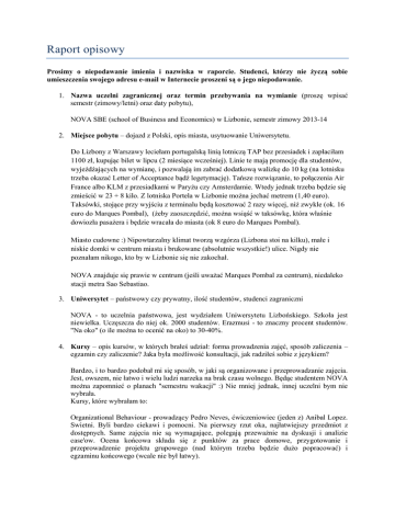 Raport opisowy Prosimy o niepodawanie imienia i nazwiska w raporcie. Studenci, którzy nie życzą sobie umieszczenia swojego adresu e-mail w Internecie proszeni są o jego niepodawanie. 1. Nazwa uczelni zagranicznej oraz termin przebywania na wymianie (proszę wpisać semestr (zimowy/letni) oraz daty pobytu), NOVA SBE (school of Business and Economics) w Lizbonie, semestr zimowy 2013-14 2. Miejsce pobytu – dojazd z Polski, opis miasta, usytuowanie Uniwersytetu. Do Lizbony z Warszawy leciełam portugalską linią lotniczą TAP bez przesiadek i zapłaciłam 1100 zł, kupując bilet w lipcu (2 miesiące wcześniej). Linie te mają promocję dla studentów, wyjeżdżających na wymianę, i pozwalają im zabrać dodatkową walizkę do 10 kg (na lotnisku trzeba okazać Letter of Acceptance bądź legetymację). Tańsze rozwiązanie, to połączenia Air France albo KLM z przesiadkami w Paryżu czy Amsterdamie. Wtedy jednak trzeba będzie się zmieścić w 23 + 8 kilo. Z lotniska Portela w Lizbonie można jechać metrem (1,40 euro). Taksówki, stojące przy wyjściu z terminalu będą kosztować 2 razy więcej, niż zwykle (ok. 16 euro do Marques Pombal), (żeby zaoszczędzić, można wsiąść w taksówkę, która właśnie dowiozła pasażera i będzie wracała do miasta (ok 8 euro do Marques Pombal). Miasto cudowne :) Nipowtarzalny klimat tworzą wzgórza (Lizbona stoi na kilku), małe i niskie domki w centrum miasta i brukowane (absolutnie wszystkie!) ulice. Nigdy nie poznałam nikogo, kto by w Lizbonie się nie zakochał. NOVA znajduje się prawie w centrum (jeśli uważać Marques Pombal za centrum), niedaleko stacji metra Sao Sebastiao. 3. Uniwersytet – państwowy czy prywatny, ilość studentów, studenci zagraniczni NOVA - to uczelnia państwowa, jest wydziałem Uniwersytetu Lizbońskiego. Szkoła jest niewielka. Uczęszcza do niej ok. 2000 studentów. Erazmusi - to znaczny procent studentów. "Na oko" (o ile można to ocenić na oko) to 30-40%. 4. Kursy – opis kursów, w których brałeś udział: forma prowadzenia zajęć, sposób zaliczenia – egzamin czy zaliczenie? Jaka była możliwość konsultacji, jak radziłeś sobie z językiem? Bardzo, i to bardzo podobał mi się sposób, w jaki są organizowane i przeprowadzanie zajęcia. Jest, owszem, nie łatwo i wielu ludzi narzeka na brak czasu wolnego. Będąc studentem NOVA można zapomnieć o planach "semestru wakacji" :) Nie mniej jednak, innej uczelni bym nie wybrała. Kursy, które wybrałam to: Organizational Behaviour - prowadzący Pedro Neves, ćwiczeniowiec (jeden z) Anibal Lopez. Swietni. Byli bardzo ciekawi i pomocni. Na pierwszy rzut oka, najłatwiejszy przedmiot z dostępnych. Same zajęcia nie są wymagające, polegają przeważnie na dyskusji i analizie case'ow. Ocena końcowa składa się z punktów za prace domowe, przygotowanie i przeprowadzenie projektu grupowego (nad którym trzeba będzie dużo popracować) i egzaminu końcowego (wcale nie był łatwy). Econometrics - jeden z najtrzudniejszych wg. portugalskich studentów przedmiot okazał się wcale nie tak zły. Prowadzący - Jose Vale e Azevedo to jeden z najlepszych wykładowców, na których zajęciach kiedykolwiek byłam. Czuć, że chce, żeby jego studenci zrozumieli przedmiot i świetnie tłumaczy materiał, co też było bardzo motywujące. Ćwiczeniowiec 5. Warunki studiowania – dostęp do biblioteki, komputera, ksero Na kampusie jest ksero, piętro 0 (polskie -1 :)). Biblioteka znajduje się w budynku SBE. Książki można wypożyczać jedynie na dzień-dwa. Komputery są dostępne w bibliotece i na 2 piętrze. 6. Warunki mieszkaniowe – opis kampusu, co trzeba ze sobą przywieźć z Polski? Na kampusie NOVA znajduje się akademik, jednak miesc w nim dla studentów z wymiany nie dawali. Znaleźć pokój do wynajęcia w Lizbonie jest bardzo łatwo jeszcze przed wyjazdem - tablicy grup erazmusowych na facebooku są pełne ogłoszeń. Ceny wachają się w przedziale 200-300 euro za pokój. Warto zwrócić uwagę na to, czy na zdjęciach w ogłoszeniu widać okno. Jeśli nie, to najprawdopodobniej w pokoju go nie ma, i to się często zdarza. Warto też przyjechać wcześniej i obejrzeć róźne mieszkania. Często w tej samej cene można znaleźć i przeciętne, i bardzo dobre. Nie widzę potrzeby niczego przywozić specjalnie. Może komplet pościeli. Na pewno ciepła piżamę - w mieszkaniach w Portugalii nie mają ogrzewania. 7. Recepcja – jak zostałeś przyjęty, kto się tobą opiekował, kontakt z International Student Office Pracownicy International Office są bardzo pomocni i odpowiedzą na każde pytanie. Do tego maja przygotowany start pack, w którym można znaleźć mapy Lizbony i transportu, ankietęwniosek o bilet miesięczny (jego wyrobienie nie jest łatwą sprawą), kartę SIM (wszyscy używają MOCHE). Swojego buddy nigdy nie spotkałam, ale odnalezienie się w mieście nie było nadzwyczajnie trudne :) 8. Koszty utrzymania – podaj szczegóły, które Twoim zdaniem mogłyby się przydać innym, np. najtańsza linia lotnicza, ubezpieczenie, jak uzyskać pozwolenie na pracę, jakie są środki komunikacji lokalnej, dokumenty, które mogą się przydać ( np. tłumaczenie metryki), codzienne wydatki w porównaniu z Warszawą. W przypadku, jeśli otrzymywałeś dofinansowanie, w jakim stopniu otrzymane stypendium zapewniało pokrycie kosztów utrzymania za granicą, relacje cen, gdzie robić zakupy? Lizbona i Portugalia jako taka są znacznie droższe od Polski. Widać to przede wszystkim po cenach wynajmu pokoi. Na to trzeba przeznaczyć średnio 250 euro miesięcznie. Transpot miejski też nie należy do najtańszych, a wszelki zniżki zostały skasowane jakiś czas temu. Bilet miesięczny kosztuje 35 euro, ale jeśli mieszka się blisko uczelni, to zazwyczaj nie opłaca się jego kupować. Taksówki natomiast są tanie. 9. Życie studenckie – rozrywki, sport Życie w Lizbonie jest bogate na wydarzenia. Poza tym, że w sa