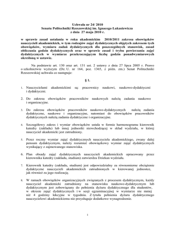 Uchwała nr 24/ 2010 Senatu Politechniki Rzeszowskiej im. Ignacego Łukasiewicza z dnia 27 maja 2010 r. w sprawie zasad ustalania w roku akademickim 2010/2011 zakresu obowiązków nauczycieli akademickich, w tym rodzajów zajęć dydaktycznych objętych zakresem tych obowiązków, wymiaru zadań dydaktycznych dla poszczególnych stanowisk, zasad obliczania godzin dydaktycznych oraz w sprawie zasad i trybu powierzania zajęć dydaktycznych w wymiarze przekraczającym liczbę godzin ponadwymiarowych określoną w ustawie. Na podstawie art. 130 oraz art. 131 ust. 2 ustawy z dnia 27 lipca 2005 r. Prawo o szkolnictwie wyższym (Dz. U. nr 164, poz. 1365, z późn. zm.) Senat Politechniki Rzeszowskiej uchwala co następuje: § 1. 1. Nauczycielami i dydaktyczni. akademickimi są: pracownicy naukowi, naukowo-dydaktyczni 2. Do zakresu obowiązków pracowników naukowych należą zadania naukowe i organizacyjne. 3. Do zakresu obowiązków pracowników naukowo-dydaktycznych należą zadania dydaktyczne, naukowe i organizacyjne, natomiast do obowiązków pracowników dydaktycznych należą zadania dydaktyczne i organizacyjne. 4. Szczegółowy zakres i wymiar obowiązków ustala w formie harmonogramu kierownik katedry (zakładu) lub innej jednostki niewchodzącej w skład wydziału, w której nauczyciel akademicki jest zatrudniony. 5. Przez roczny wymiar zajęć dydaktycznych nauczyciela akademickiego, zwany dalej pensum dydaktycznym, należy rozumieć obowiązkowy wymiar zajęć dydaktycznych wynikający z zajmowanego stanowiska. 6. Plan obsady zajęć dydaktycznych nauczycieli akademickich opracowany przez kierownika katedry (zakładu, studium) zatwierdza Dziekan wydziału. 7. Kierownik katedry (zakładu, studium) jest odpowiedzialny za równomierne obciążenie dydaktyczne nauczycieli akademickich zatrudnionych w kierowanej jednostce, jak również za jego realizację. 8. W ramach obowiązków organizacyjnych związanych z procesem dydaktycznym, każdy nauczyciel akademicki zatrudniony na stanowisku naukowo-dydaktycznym lub dydaktycznym jest zobowiązany do pełnienia dyżuru dydaktycznego dla studentów, w okresie zajęć dydaktycznych i w sesji egzaminacyjnej w wymiarze nie mniej niż 4 godziny lekcyjne w tygodniu. Z tytułu pełnienia dyżuru dydaktycznego nauczycielowi akademickiemu nie przysługuje dodatkowe wynagrodzenie. 1 9. Termin i miejsce dyżuru dydaktycznego powinny być uzgodnione ze studentami i podane do wiadomości w ciągu dwóch tygodni od rozpoczęcia semestru. 10. Zasady przyznawania w Politechnice Rzeszowskiej dodatkowych wynagrodzeń ze środków pozabudżetowych określają odrębne przepisy wewnętrzne. § 2. 1. 2. Ustala się wymiar pensum dydaktycznego w roku akademickim 2010/2011 dla nauczycieli akademickich zatrudnionych w Politechnice Rzeszowskiej w pełnym wymiarze czasu pracy na stanowiskach naukowo-dydaktycznych i dydaktycznych: Stanowisko Wymiar pensum dydaktycznego w godzinach obliczeniowych profesor zwyczajny, prof. nadzwyczajny 240 docent 240 adiunkt 240 asystent 240 starszy wykładowca 360 wykładowca 360 lektor, instruktor 540 Dla nauczycieli akademickich zatrudnionych w Politechnice Rzeszowskiej pełniących w Uczelni funkcje kierownicze ustala się roczny wymiar pensum dydaktycznego w roku akademickim 2010/2011: Funkcja Wymiar pensum dydaktycznego w godzinach obliczeniowych Rektor lub Prorektor Dziekan Prodziekan zatrudniony na stanowisku profesora zwyczajnego, profesora nadzwyczajnego 120 130 150 Prodziekan zatrudniony na stanowisku adiunkta Prodziekan zatrudniony na stanowisku starszego wykładowcy lub wykładowcy 150 240 2 3. Osoby zatrudnione w niepełnym wymiarze czasu pracy (1/2 etatu, 3/4 etatu itp.) zobowiązane są do realizacji pensum dydaktycznego ustalonego proporcjonalnie do wymiaru pensum określonego odpowiednio w ust. 1. Godziny wykonane ponad wymiar (1/2 etatu, 3/4 etatu itp.) rozliczane są według zasad godzin ponadwymiarowych. § 3. 1. Do pensum dydaktycznego zaliczane są zajęcia dydaktyczne objęte planem studiów stacjonarnych i niestacjonarnych oraz czynności dydaktyczne wymienione w § 5 ust. 4 pkt 2-4. 2. Za zajęcia dydaktyczne uznaje się: wykłady, ćwiczenia, laboratoria, projekty, seminaria oraz konsultacje ujęte w planach studiów. 3. Pensum dydaktyczne powinno być wykonane w całości na studiach stacjonarnych w formie zajęć dydaktycznych i czynności dydaktycznych rozliczanych z zastosowaniem współczynników określonych w § 5 ust. 2 i 4. W przypadku braku możliwości realizacji pensum na studiach stacjonarnych, w następnej kolejności do pensum będą wliczane zajęcia dydaktyczne i czynności dydaktyczne wykonane na studiach niestacjonarnych rozliczane z zastosowaniem współczynników określonych w § 5 ust. 2 i 4 oraz zajęcia dydaktyczne zrealizowane na studiach podyplomowych i kursach dokształcających rozliczane według zasad określonych w § 6 ust. 2. 4. Kierownicy katedr (zakładów) świadczących usługi międzywydziałowe zobowiązani są do równomiernego zaplanowania pensum dydaktycznego dla nauczycieli akademickich w pierwszej kolejności na studiach stacjonarnych w wydziale macierzystym, a następnie w innych wydziałach. W szczególnych przypadkach dopuszcza się realizację pensum dydaktycznego na studiach niestacjonarnych. Powyższy obowiązek dotyczy również SJO. 5. Dopuszcza się realizację pensum dydaktycznego poza Uczelnią w innych jednostkach szkolnictwa wyższego na zasadach określonych w porozumieniu zawartym pomiędzy uczelniami. Zasady finansowania realizacji pensum poza Politechniką Rzeszowską powinny uwzględniać rzeczywiste koszty prowadzenia zajęć dydaktycznych. § 4. 1. Godziny ponadwymiarowe stanowią zajęcia (czynności) dydaktyczne wykonane ponad obowiązkowe pensum dydaktyczne, określone w § 2. 2. W przypadku konieczności zapewnienia realizacji zajęć dydaktycznych przewidzianych w planie studiów, nauczyciel akademicki jest zobowiązany do prowadzenia zajęć