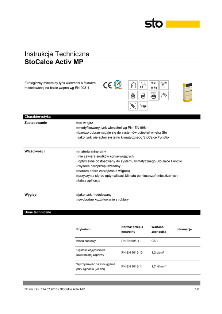 Instrukcja Techniczna StoCalce Activ MP Ekologiczny mineralny tynk wierzchni o fakturze modelowanej na bazie wapna wg EN 998-1 Charakterystyka Zastosowanie • do wnętrz • modyfikowany tynk wierzchni wg PN- EN 998-1 • bardzo dobrze nadaje się do systemów ociepleń wnętrz Sto • jako tynk wierzchni systemu klimatycznego StoCalce Functio Właściwości • materiał mineralny • nie zawiera środków konserwujących • optymalnie dostosowany do systemu klimatycznego StoCalce Functio • wysoce paroprzepuszczalny • bardzo dobre zarządzanie wilgocią • przyczynia się do optymalizacji klimatu pomieszczeń mieszkalnych • łatwa aplikacja Wygląd • jako tynk modelowany • swobodne kształtowanie struktury Dane techniczne Kryterium Klasa zaprawy Gęstość objętościowa stwardniałej zaprawy Wytrzymałość na rozciąganie przy zginaniu (28 dni) Nr wer.: 2 / / 24.07.2015 / StoCalce Activ MP Norma/ przepis Wartość/ kontrolny Jednostka PN EN 998-1 CS II PN-EN 1015-10 1,2 g/cm³ PN-EN 1015-11 1,7 N/mm² Informacje 1/6 Instrukcja Techniczna StoCalce Activ MP Wytrzymałość na ściskanie (28 dni) Dynamiczny moduł sprężystości (28 dni) PN-EN 1015-11 3,8 N/mm² TP BE-PCC 2.700 N/mm² Współczynnik. oporu 14 dyfuzyjnego pary wodnej µ Przewodność cieplna PN EN 1745 Przewodność cieplna PN EN 1745 Reakcja na ogień (klasa) PN EN 13501-1 ≤ 0,39 W/(m*K) wartość dla P=50 % tabelaryczna ≤ 0,43 W/(m*K) wartość w P = 90 % tabelaryczna A1 niepalny Wydajność 895 L/t Absorbcja wody spowodowana > 0,4 podciąganiem kapilarnym kkg/(m²·min0,5) W0 Podane parametry są wartościami średnimi albo przybliżonymi. Z uwagi na zastosowanie w naszych produktach naturalnych surowców, rzeczywiste wartości w poszczególnych dostawach mogą nieznacznie odbiegać od podanych, co jednak nie ma wpływu na przydatność produktu. Podłoże Wymagania Podłoże musi być solidne, równe, suche, wytrzymałe oraz wolne od tłuszczu i pyłu. Wilgotne lub niecałkowicie związane podłoże może prowadzić do uszkodzeń kolejnych powłok, powodując powstawanie pęcherzy i zarysowań. Dla zachowania funkcjonalności należy przestrzegać także zasad ochrony przed działaniem wilgoci i ciepła dla całej struktury ściany. Przygotowania Sprawdzić poprawność naniesienia i nośność poprzednich powłok. Usunąć powłoki o niedostatecznej nośności. Aplikacja Temperatura aplikacji najniższa temperatura podłoża i powietrza: +5 °C Najwyższa temperatura podłoża i powietrza: +30 °C Nr wer.: 2 / / 24.07.2015 / StoCalce Activ MP 2/6 Instrukcja Techniczna StoCalce Activ MP Czas obróbki Przy +20 °C: ok. 2 godzin Stosunek składników mieszanki 9,5 l wody na 25 kg Przygotowanie materiału Przygotować wodę i dodać suchą zaprawę. Mieszać przez ok. 2 minuty, pozostawić do dojrzewania na ok. 5 minut i ponownie wymieszać przez ok. 30 sekund. Zużycie Rodzaj zastosowania Zużycie ok. Według wymaganej grubości warstwy 1,70 - 4,00 kg/mX Zużycie materiału uzależnione jest między innymi od obróbki, podłoża oraz konsystencji. Podane wartości dotyczące zużycia służą jedynie orientacji. Dokładne wartości dotyczące zużycia należy ustalić na miejscu, dla danego obiektu. Struktura powłok powłoka gruntująca w nowym budownictwie: StoLevell Calce RP grubość warstwy przy aplikacji jednowarstwowej: ok. 1020 mm W przypadku podłoży gipsowych: patrz rozdział Przygotowanie podłoża Na niechłonne podłoża, np. z betonu, XPS lub zagruntowane podłoża gipsowe, należy nanieść mostek sczepny, używając środka StoLevell Calce FS i szpachelki zębatej (8 x 8 mm) W przypadku muru mieszanego i płyt XPS: uzbroić StoLevell Calce RP za pomocą siatki zbrojącej Sto-Glasfasergewebe F (4 x 4 mm). Powłoka gruntująca w przypadku renowacji bez powłoki gruntującej bez środka gruntującego na istniejące nośne, matowe stare powłoki można bezpośrednio nanosić StoLevell Calce FS grubość warstwy: 3–5 mm jedna warstwa, maks. 8 mm w przypadku kilku warstw Powłoka pośrednia: StoLevell Calce FS grubość warstwy: 3–5 mm jedna warstwa, maks. 8 mm w przypadku kilku warstw W zależności od rodzaju podłoża może być konieczne wtopienie siatki zbrojącej Sto-Glasfasergewebe F (4 x 4 mm) Powłoka końcowa: Nr wer.: 2 / / 24.07.2015 / StoCalce Activ MP 3/6 Instrukcja Techniczna StoCalce Activ MP StoCalce Activ MP Wskazówka: Opcjonalnie można nanieść powłokę StoColor Calcetura lub StoColor Sil In bez znacznego ograniczania sorpcji. Aplikacja ręcznie Produkt należy zacierać równomiernie gładką pacą ze stali nierdzewnej Grubość warstwy od min. 2 mm do maks. 5 mm w pojedynczych przypadkach. Technika pracy, narzędzia używane do obróbki oraz podłoże mają istotny wpływ na ostateczny efekt. Rekomendujemy zastosowanie podanych narzędzi. Schnięcie, twardnienie, czas oczekiwania do ponownej obróbki Czas schnięcia uzależniony jest od temperatury, wiatru i względnej wilgotności powietrza. Czyszczenie narzędzi Wyczyścić wodą natychmiast po użyciu. Informacje, zalecenia, szczególne informacje, pozostałe W niskiej temperaturze i dużej wilgotności powietrza w przypadku wszystkich tynków wiążących hydraulicznie możliwe jest powstawanie wykwitów. Zjawisko to nie wynika z technicznej wady produktu i nie jest podstawą do zgłaszania reklamacji. Dostawa Odcień naturalnie biała możliwość barwienia przy użyciu StoLook Punto F w stężeniu maks. 20 % W celu zabarwienia zmieszać całą zawartość opakowania ze StoLook Punto F. Dokładność koloru: Z uwagi na chemiczne i/lub fizyczne procesy wiązania, zachodzące w różnych warunkach lokalizacyjnych, nie gwarantuje się równomiernej dokładności odcienia i braku delikatnych przebarwień powierzchni materiału, szczególnie w przypadkach: a. niejednakowej porowatości podłoża b. różnej wilgotności pokrytego obszaru Nr wer.: 2 / / 24.07.2015 / StoCalce Activ MP 4/6 Instrukcja Techniczna StoC