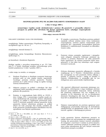 10 PL Dziennik Urzędowy Unii Europejskiej 07/t. 8 DZIENNIK URZĘDOWY UNII EUROPEJSKIEJ L 46/1 32004R0261 17.2.2004 ROZPORZĄDZENIE (WE) NR 261/2004 PARLAMENTU EUROPEJSKIEGO I RADY z dnia 11 lutego 2004 r. ustanawiające wspólne zasady odszkodowania i pomocy dla pasażerów w przypadku odmowy przyjęcia na poklad albo odwolania lub dużego opóźnienia lotów, uchylające rozporządzenie (EWG) nr 295/91 (Tekst mający znaczenie dla EOG) PARLAMENT EUROPEJSKI I RADA UNII EUROPEJSKIEJ, (4) W związku z powyższym, Wspólnota powinna podnieść standardy ochrony ustalone przez wyżej wymienione rozporządzenie, zarówno poprzez wzmocnienie praw pasażerów jak i zapewnienie przewoźnikom lotniczym dzialalności w ujednoliconych warunkach na zliberalizowanym rynku. (5) Ponieważ różnica pomiędzy regularnymi i nieregularnymi uslugami transportu lotniczego zmniejsza się, ochrona ta powinna obejmować nie tylko pasażerów lotów regularnych, ale również pasażerów lotów nieregularnych, w tym także loty stanowiące część zorganizowanych wycieczek. (6) Ochrona obejmująca pasażerów odlatujących z lotniska znajdującego się w Państwie Czlonkowskim powinna być rozciągnięta na tych pasażerów, którzy odlatują z lotniska w państwie trzecim i lądują na lotnisku w Państwie Czlonkowskim, w przypadku gdy lot jest obslugiwany przez przewoźnika wspólnotowego. (7) Aby zapewnić efektywność stosowania niniejszego rozporządzenia, zobowiązania z niego wynikające powinny dotyczyć przewoźników lotniczych, którzy wykonują lub zamierzają wykonywać loty, bez względu na to samoloty są ich wlasnością czy też są przedmiotem dzierżawy bezzalogowej (dry lease) lub zalogowej (wet lease) lub na jakiejkolwiek innej podstawie. (8) Niniejsze rozporządzenie nie powinno ograniczać praw obslugującego przewoźnika lotniczego do dochodzenia odszkodowania od jakiejkolwiek osoby, w tym od osób trzecich, zgodnie z obowiązującym prawem. (9) Liczba pasażerów, którym odmówiono przyjęcia na poklad wbrew ich woli powinna być zredukowana przez wymóg, aby przewoźnicy lotniczy wzywali ochotników do rezygnacji z rezerwacji w zamian za pewne korzyści, zamiast odmawiać pasażerom przyjęcia na poklad oraz przez pelną rekompensatę dla tych, którym ostatecznie odmówiono przyjęcia na poklad. uwzględniając Traktat ustanawiający Wspólnotę Europejską, w szczególności jego art. 80 ust. 2, uwzględniając wniosek Komisji (1), uwzględniając opinię Europejskiego Komitetu EkonomicznoSpolecznego (2), po konsultacji z Komitetem Regionów, dzialając zgodnie z procedurą ustanowioną w art. 251 Traktatu (3), w świetle wspólnego projektu zatwierdzonego przez komitet pojednawczy w dniu 1 grudnia 2003 r., a także mając na uwadze, co następuje: (1) Dzialanie Wspólnoty w dziedzinie transportu lotniczego powinno mieć na celu, między innymi, zapewnienie wysokiego poziomu ochrony pasażerów. Ponadto, powinno się w pelni zwracać uwagę na ogólne wymogi ochrony konsumentów. (2) Odmowa przyjęcia na poklad i odwolanie lub duże opóźnienie lotów powodują poważne problemy i niedogodności dla pasażerów. (3) Pomimo, iż rozporządzenie Rady (EWG) nr 295/91 z dnia 4 lutego 1991 r. ustanawiające wspólne zasady systemu odszkodowań dla pasażerów, którym odmówiono przyjęcia na poklad w regularnych przewozach lotniczych (4) stworzylo podstawy ochrony pasażerów, liczba pasażerów, którym odmówiono przyjęcia na poklad wbrew ich woli, pozostaje zbyt wysoka, podobnie jak liczba pasażerów poszkodowanych odwolaniem lotu bez uprzedzenia oraz dużymi opóźnieniami. (1) Dz.U. C 103 E z 30.4.2002, str. 225 oraz Dz.U. C 71 E z 25.3.2003, str. 188. (2) Dz.U. C 241 z 7.10.2002, str. 29. (3) Opinia Parlamentu Europejskiego z dnia 24 października 2002 r. (Dz.U. C 300 E z 11.12.2003, str. 443). Wspólne stanowisko Rady z dnia 18 marca 2003 r. (Dz.U. C 125 E z 27.5.2003, str. 63) i stanowisko Parlamentu Europejskiego z dnia 3 lipca 2003 r. Rezolucja prawodawcza Parlamentu Europejskiego z dnia 18 grudnia 2003 r. i decyzja Rady z dnia 26 stycznia 2004 r. (4) Dz.U. L 36 z 8.2.1991, str. 5. 07/t. 8 (10) (11) (12) (13) (14) (15) PL Dziennik Urzędowy Unii Europejskiej Pasażerowie, którym odmówiono przyjęcia na poklad wbrew ich woli powinni mieć możliwość rezygnacji z lotu i otrzymania zwrotu należności za bilet albo kontynuowania podróży na satysfakcjonujących warunkach, z zapewnieniem odpowiedniej opieki podczas oczekiwania na późniejszy lot. Ochotnicy powinni mieć również możliwość odwolania swojego lotu i otrzymania zwrotu należności za bilet albo kontynuowania podróży na satysfakcjonujących warunkach, z uwagi na fakt, iż spotykają ich niedogodności w podróżowaniu podobne do tych, których doświadczają pasażerowie, którym odmówiono przyjęcia na poklad wbrew ich woli. Powinno się również zminimalizować trudności i niedogodności dla pasażerów wynikające z odwolania lotów. W tym celu należy naklaniać przewoźników do informowania pasażerów o odwolaniach lotów przed planową godziną odlotu i ponadto do oferowania pasażerom możliwych do przyjęcia zmian planów podróży, tak by mieli oni możliwość dostosowania się do nich. W przypadku nieuczynienia tego, przewoźnicy lotniczy byliby zobowiązani do wyplacenia odszkodowania pasażerom, chyba że odwolanie jest spowodowane zaistnieniem wyjątkowych okoliczności, których nie można bylo uniknąć pomimo podjęcia wszelkich racjonalnych środków. Pasażerowie, których loty zostaly odwolane, powinni mieć możliwość otrzymania zwrotu należności z ich bilety albo oferty zmiany trasy podróży na satysfakcjonujących warunkach, a w czasie oczekiwania na późniejszy lot powinni zostać otoczeni należytą opieką. Podobnie jak w konwencji montrealskiej, zobowiązania przewoźników lotniczych powinny być ograniczone lub ich odpowiedzialność wylączona w przypadku gdy z