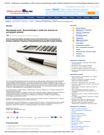 23.6.2014 Wynalazek prof. Szymańskiego z UwB ma szansę na europejski patent, Nauka, Wiadomości Białystok Online Portal Miejski Białystok (Bialystok), Strona 1 Portal Miejski Białystok Online Poniedziałek 23 czerwca 2014 Katalog firm Lokale Imprezy Wiadomości Albina, Wandy, Zenona Ogłoszenia Wpisz czego szukasz w Katalogu Firm i Instytucji Białystok Wiadomości Rozrywka Motoryzacja Dom Biznes Nauka Praca Uroda Zdrowie Turystyka 879 osób online Poleć nas Startuj z Białystok Online Dodaj do ulubionych Zarejestruj się Twój Profil Jesteś tu: Strona główna / Wiadomości / Nauka / Wynalazek prof. Szymańskiego z UwB ma szansę na europejski patent Na skróty Nauka Strona Główna Wynalazek prof. Szymańskiego z UwB ma szansę na europejski patent Katalog Firm i Instytucji 2014-06-18 136 imprez 8554 obiekty Imprezy, wydarzenia Promocje, oferty Tagi: uwb, patent, patent plus, konkurs, szymański, 388 promocji Ogłoszenia Prof. Krzysztof Szymański z Wydziału Fizyki z UwB został jednym ze zwycięzców III Konkursu Programu Patent Plus. Otrzyma dofinansowanie na wsparcie komercjalizacji i procedur związanych z uzyskaniem międzynarodowego patentu dla swojego wynalazku. Ogłoszenia drobne 30493 ogłoszenia Plan miasta Komunikacja miejska PKP Przewoźnicy prywatni Lokale Repertuar Kin, Teatrów i Opery Konkursy Zakupy online Najnowsze wiadomości Szukasz pewnego, używanego auta? Zaufaj profesjonaliście Białostocka firma Gepardem Biznesu 23 czerwca. Dzień wszystkich ojców Początek tygodnia z przelotnym deszczem Kuratorium skontrolowało świetlice szkolne w Podlaskiem Najczęściej czytane Wyniki egzaminu gimnazjalnego. Jak wypadli podlascy uczniowie? Fot: sxc.hu Prof. Krzysztof Szymański opracował nowatorski sposób pomiaru jednorodności płyt materiałów przewodzących prąd elektryczny. Do tej pory jednorodność badana była głównie przy użyciu rentgenografii lub ultrasonografii. Jego metoda opiera się na analizie rozpływu prądu w badanym materiale. Dzięki temu będzie mogła być używana do testowania np. jakości dużych elementów stalowych wykorzystywanych do konstrukcji budowlanych. To z kolei pozwoli ustalić, czy nie ma w nich np. zagrażających ich wytrzymałości rozwarstwień. Wynalazek fizyka z Uniwersytetu w Białymstoku został już zgłoszony w Urzędzie Patentowym Rzeczpospolitej Polskiej. - Dzięki dofinansowaniu z Programu Patent Plus naukowiec będzie mógł rozpocząć procedurę w trybie European Patent Convention, co pozwoli na opatentowanie metody w krajach europejskich. Procedury są kosztowne, dlatego bez wsparcia z NCBiR nie byłyby możliwe informują przedstawiciele uczelni. Wniosek z Wydziału Fizyki UwB został w konkursie oceniony wysoko – znalazł się na 6. miejscu spośród 14 zakwalifikowanych do dofinansowania. Wynalazkiem prof. Szymańskiego już zainteresowała się jedna z krakowskich firm, która nabyła od UwB 10% udziałów w prawie do uzyskania patentu w Polsce. W praktyce oznacza to, że będzie też miała 10% udziału w zyskach płynących z wdrożenia wynalazku. Kultura na weekend. Dni Miasta i mnóstwo atrakcji dla każdego [WIDEO] Weekend z dużą ilością chmur i deszczem Konkursy w białostockich urzędach. Sprawdź, dla kogo jest praca Dawno temu nad Białką. Zabawny skandal na dworcu PKP Małe, 2-pokojowe mieszkania w nowych inwestycjach białostockich deweloperów. Ile kosztują? Wybrano piwo roku. Trunek z Podlasia ponownie najlepszy Dni Miasta. Goran Bregović, katarynki i jarmark na rynku [WIDEO] Podlaski Piknik Militarny w Ogrodniczkach. Największa tego typu impreza w regionie Zmiana wyglądu to zmiana charakteru? Metamorfozy w białostockich salonach wizażu Katalog Firm i Instytucji Małgorzata Cichocka [email protected] Biznes, prawo, ekonomia Dom, mieszkanie, budownictwo Handel Internet, komputery Komunikacja, transport Drukuj Wyślij do znajomego Przeczytaj później | Kultura, sztuka Moda, uroda Motoryzacja Nauka, edukacja, szkolnictwo Przeczytaj także Produkcja, usługi Reklama Jak pomysł zamienić w pieniądze? Spotkania dla przedsiębiorczych studentów (2014-04-07) Białostoccy naukowcy uzyskali patent na nowy związek Sport, rozrywka, rekreacja Turystyka, noclegi Urzędy, instytucje http://www.bialystokonline.pl/wynalazek-prof-szymanskiego-z-uwb-ma-szanse-na-europejski-patent,artykul,78428,6,1.html 1/2 23.6.2014 Wynalazek prof. Szymańskiego z UwB ma szansę na europejski patent, Nauka, Wiadomości Białystok Online Portal Miejski Białystok (Bialystok), Strona 1 (2014-01-17) Zdrowie, medycyna Odkrycie białostockich naukowców pomoże w walce z rakiem (2014-02-25) Zdrowie: gabinety i poradnie medyczne Wszystkie kategorie Student z Białegostoku zaprojektował nowatorski wynalazek. Uczelnia chce go opatentować (2013-01-31) Polecamy Obóz żeglarski z AZS Białystok (2010-07-07) Konkursy dla młodych twórców. C zekają nagrody (2013-12-04) Zdrowie: gabinety i poradnie medyczne / Okulistyka Konkurs literacki upamiętni zmarłego poetę i dziennikarza (2014-02-18) Konkurs dla miłośników fizyki. Dokonaj pomiarów i wygraj pieniądze (2013-02-08) Wiesław Szymański nie żyje. Dziennikarz zmarł po długiej chorobie (2013-02-27) Przyjaciele czytają wiersze Wiesława Szymańskiego (2013-03-09) Centrum Okulistyczno-Laserowe. Laserowa korekcja wzroku. Diagnostyka i leczenie chorób oczu. ul. Legionowa 6 lok. 9 15-099 Białystok www.okulistyka.bialystok.pl Więcej informacji o portalu reklama współpraca praca kontakt pomoc ISOK Polityka prywatności | Polityka cookies C opyright © 2001-2014 C MG, Białystok Adres redakcji: ul. Sienkiewicza 49 lok. 311, Białystok, tel. 85 746 07 39 http://www.bialystokonline.pl/wynalazek-prof-szymanskiego-z-uwb-ma-szanse-na-europejski-patent,artykul,78428,6,1.html 2/2