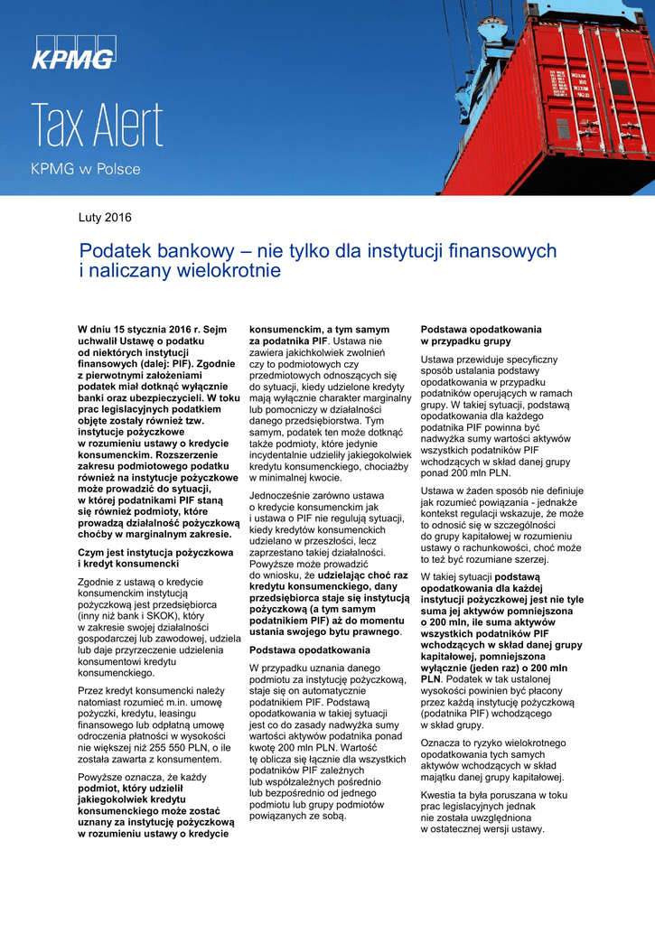 Luty 2016 Podatek bankowy – nie tylko dla instytucji finansowych i naliczany wielokrotnie W dniu 15 stycznia 2016 r. Sejm uchwalił Ustawę o podatku od niektórych instytucji finansowych (dalej: PIF). Zgodnie z pierwotnymi założeniami podatek miał dotknąć wyłącznie banki oraz ubezpieczycieli. W toku prac legislacyjnych podatkiem objęte zostały również tzw. instytucje pożyczkowe w rozumieniu ustawy o kredycie konsumenckim. Rozszerzenie zakresu podmiotowego podatku również na instytucje pożyczkowe może prowadzić do sytuacji, w której podatnikami PIF staną się również podmioty, które prowadzą działalność pożyczkową choćby w marginalnym zakresie. Czym jest instytucja pożyczkowa i kredyt konsumencki konsumenckim, a tym samym za podatnika PIF. Ustawa nie zawiera jakichkolwiek zwolnień czy to podmiotowych czy przedmiotowych odnoszących się do sytuacji, kiedy udzielone kredyty mają wyłącznie charakter marginalny lub pomocniczy w działalności danego przedsiębiorstwa. Tym samym, podatek ten może dotknąć także podmioty, które jedynie incydentalnie udzieliły jakiegokolwiek kredytu konsumenckiego, chociażby w minimalnej kwocie. Podstawa opodatkowania w przypadku grupy Jednocześnie zarówno ustawa o kredycie konsumenckim jak i ustawa o PIF nie regulują sytuacji, kiedy kredytów konsumenckich udzielano w przeszłości, lecz zaprzestano takiej działalności. Powyższe może prowadzić do wniosku, że udzielając choć raz kredytu konsumenckiego, dany przedsiębiorca staje się instytucją pożyczkową (a tym samym podatnikiem PIF) aż do momentu ustania swojego bytu prawnego. Ustawa w żaden sposób nie definiuje jak rozumieć powiązania - jednakże kontekst regulacji wskazuje, że może to odnosić się w szczególności do grupy kapitałowej w rozumieniu ustawy o rachunkowości, choć może to też być rozumiane szerzej. Zgodnie z ustawą o kredycie konsumenckim instytucją pożyczkową jest przedsiębiorca (inny niż bank i SKOK), który w zakresie swojej działalności gospodarczej lub zawodowej, udziela Podstawa opodatkowania lub daje przyrzeczenie udzielenia konsumentowi kredytu W przypadku uznania danego konsumenckiego. podmiotu za instytucję pożyczkową, Przez kredyt konsumencki należy staje się on automatycznie natomiast rozumieć m.in. umowę podatnikiem PIF. Podstawą pożyczki, kredytu, leasingu opodatkowania w takiej sytuacji finansowego lub odpłatną umowę jest co do zasady nadwyżka sumy odroczenia płatności w wysokości wartości aktywów podatnika ponad nie większej niż 255 550 PLN, o ile kwotę 200 mln PLN. Wartość została zawarta z konsumentem. tę oblicza się łącznie dla wszystkich podatników PIF zależnych Powyższe oznacza, że każdy lub współzależnych pośrednio podmiot, który udzielił lub bezpośrednio od jednego jakiegokolwiek kredytu podmiotu lub grupy podmiotów konsumenckiego może zostać powiązanych ze sobą. uznany za instytucję pożyczkową w rozumieniu ustawy o kredycie Ustawa przewiduje specyficzny sposób ustalania podstawy opodatkowania w przypadku podatników operujących w ramach grupy. W takiej sytuacji, podstawą opodatkowania dla każdego podatnika PIF powinna być nadwyżka sumy wartości aktywów wszystkich podatników PIF wchodzących w skład danej grupy ponad 200 mln PLN. W takiej sytuacji podstawą opodatkowania dla każdej instytucji pożyczkowej jest nie tyle suma jej aktywów pomniejszona o 200 mln, ile suma aktywów wszystkich podatników PIF wchodzących w skład danej grupy kapitałowej, pomniejszona wyłącznie (jeden raz) o 200 mln PLN. Podatek w tak ustalonej wysokości powinien być płacony przez każdą instytucję pożyczkową (podatnika PIF) wchodzącego w skład grupy. Oznacza to ryzyko wielokrotnego opodatkowania tych samych aktywów wchodzących w skład majątku danej grupy kapitałowej. Kwestia ta była poruszana w toku prac legislacyjnych jednak nie została uwzględniona w ostatecznej wersji ustawy. Przykład Spółka A, B i C wchodzą do jednej grupy kapitałowej. Spółka A i B to podatnicy PIF (instytucje pożyczkowe), Spółka C tym podatnikiem nie jest. Suma aktywów: Spółka A – 800 mln Spółka B – 150 mln Spółka C – 500 mln Wyliczenie podatku: Spółka A: 800 mln + 150 mln – 200 mln (kwota wolna od podatku) x 0,44% = 4,18 mln PLN PIF rocznie Spółka B: 800 mln + 150 mln – 200 mln (kwota wolna od podatku) x 0,44% = 4,18 mln PLN PIF rocznie Spółka C: brak opodatkowania Razem: 8,36 mln PIF rocznie Mając na uwadze powyższe, w przypadku gdyby zidentyfikowali Państwo w ramach swoich grup/podmiotów sytuacje, gdzie udzielono kredytów konsumenckich, istnieje znaczące ryzyko uznania tego podmiotu za podatnika PIF. W przypadku gdyby w Państwa grupie funkcjonowało więcej takich podmiotów, opodatkowanie niniejszym podatkiem może mieć charakter wielokrotny. W takiej sytuacji prosimy o kontakt – nasi eksperci udzielą wszelkich możliwych wyjaśnień. Informacje zawarte w niniejszej publikacji mają charakter ogólny i nie dotyczą sytuacji konkretnej firmy. Ze względu na szybkość zmian zachodzących w polskim prawodawstwie prosimy o upewnienie się w dniu zapoznania się z niniejszą publikacją, czy informacje w niej zawarte są wciąż aktualne. Przed podjęciem konkretnych decyzji proponujemy skonsultowanie ich z naszymi doradcami. Nazwa i logo KPMG są zastrzeżonymi znakami towarowymi bądź znakami towarowymi KPMG International. © 2016 KPMG Tax M.Michna sp.k. jest polską spółką komandytową i członkiem sieci KPMG składającej się z niezależnych spółek członkowskich stowarzyszonych z KPMG International Cooperative („KPMG International”), podmiotem prawa szwajcarskiego. Wszelkie prawa zastrzeżone. kpmg.pl 3 Kontakt Biura KPMG Mirosław Michna Partner Tel. : +48 12 424 94 00 Tel. kom. : +48 604 493 343 [email protected] Warszawa ul. Inflancka 4a 00-189 Warszawa Tel. : +48 22 528 11 00 Faks: +48 22 528 10 09 [ema