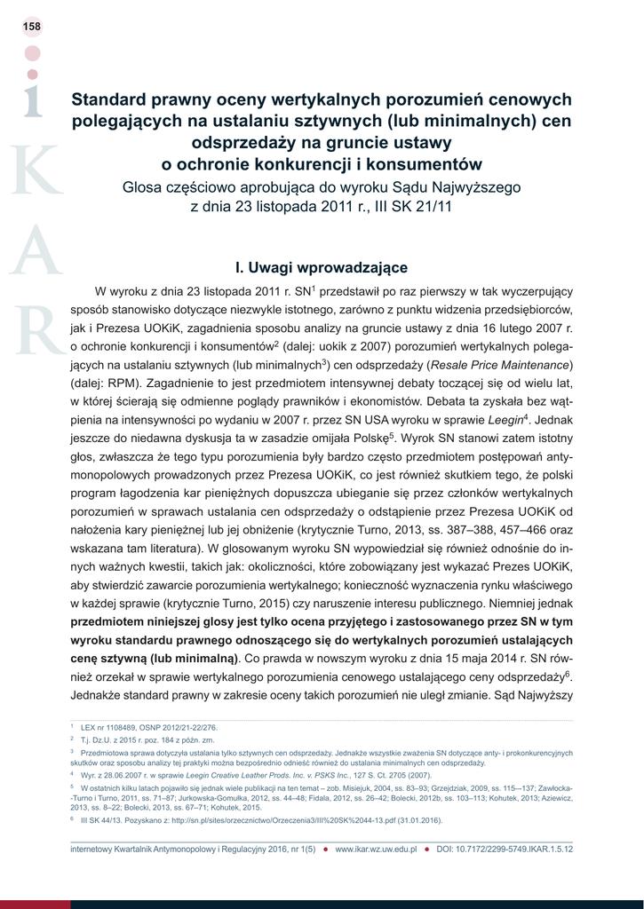 158 Standard prawny oceny wertykalnych porozumień cenowych polegających na ustalaniu sztywnych (lub minimalnych) cen odsprzedaży na gruncie ustawy o ochronie konkurencji i konsumentów Glosa częściowo aprobująca do wyroku Sądu Najwyższego z dnia 23 listopada 2011 r., III SK 21/11 I. Uwagi wprowadzające W wyroku z dnia 23 listopada 2011 r. SN1 przedstawił po raz pierwszy w tak wyczerpujący sposób stanowisko dotyczące niezwykle istotnego, zarówno z punktu widzenia przedsiębiorców, jak i Prezesa UOKiK, zagadnienia sposobu analizy na gruncie ustawy z dnia 16 lutego 2007 r. o ochronie konkurencji i konsumentów2 (dalej: uokik z 2007) porozumień wertykalnych polegających na ustalaniu sztywnych (lub minimalnych3) cen odsprzedaży (Resale Price Maintenance) (dalej: RPM). Zagadnienie to jest przedmiotem intensywnej debaty toczącej się od wielu lat, w której ścierają się odmienne poglądy prawników i ekonomistów. Debata ta zyskała bez wątpienia na intensywności po wydaniu w 2007 r. przez SN USA wyroku w sprawie Leegin4. Jednak jeszcze do niedawna dyskusja ta w zasadzie omijała Polskę5. Wyrok SN stanowi zatem istotny głos, zwłaszcza że tego typu porozumienia były bardzo często przedmiotem postępowań antymonopolowych prowadzonych przez Prezesa UOKiK, co jest również skutkiem tego, że polski program łagodzenia kar pieniężnych dopuszcza ubieganie się przez członków wertykalnych porozumień w sprawach ustalania cen odsprzedaży o odstąpienie przez Prezesa UOKiK od nałożenia kary pieniężnej lub jej obniżenie (krytycznie Turno, 2013, ss. 387–388, 457–466 oraz wskazana tam literatura). W glosowanym wyroku SN wypowiedział się również odnośnie do innych ważnych kwestii, takich jak: okoliczności, które zobowiązany jest wykazać Prezes UOKiK, aby stwierdzić zawarcie porozumienia wertykalnego; konieczność wyznaczenia rynku właściwego w każdej sprawie (krytycznie Turno, 2015) czy naruszenie interesu publicznego. Niemniej jednak przedmiotem niniejszej glosy jest tylko ocena przyjętego i zastosowanego przez SN w tym wyroku standardu prawnego odnoszącego się do wertykalnych porozumień ustalających cenę sztywną (lub minimalną). Co prawda w nowszym wyroku z dnia 15 maja 2014 r. SN również orzekał w sprawie wertykalnego porozumienia cenowego ustalającego ceny odsprzedaży6. Jednakże standard prawny w zakresie oceny takich porozumień nie uległ zmianie. Sąd Najwyższy 1 LEX nr 1108489, OSNP 2012/21-22/276. 2 T.j. Dz.U. z 2015 r. poz. 184 z późn. zm. 3 Przedmiotowa sprawa dotyczyła ustalania tylko sztywnych cen odsprzedaży. Jednakże wszystkie zważenia SN dotyczące anty- i prokonkurencyjnych skutków oraz sposobu analizy tej praktyki można bezpośrednio odnieść również do ustalania minimalnych cen odsprzedaży. 4 Wyr. z 28.06.2007 r. w sprawie Leegin Creative Leather Prods. Inc. v. PSKS Inc., 127 S. Ct. 2705 (2007). 5 W ostatnich kilku latach pojawiło się jednak wiele publikacji na ten temat – zob. Misiejuk, 2004, ss. 83–93; Grzejdziak, 2009, ss. 115–-137; Zawłocka-Turno i Turno, 2011, ss. 71–87; Jurkowska-Gomułka, 2012, ss. 44–48; Fidala, 2012, ss. 26–42; Bolecki, 2012b, ss. 103–113; Kohutek, 2013; Aziewicz, 2013, ss. 8–22; Bolecki, 2013, ss. 67–71; Kohutek, 2015. 6 III SK 44/13. Pozyskano z: http://sn.pl/sites/orzecznictwo/Orzeczenia3/III%20SK%2044-13.pdf (31.01.2016). internetowy Kwartalnik Antymonopolowy i Regulacyjny 2016, nr 1(5) www.ikar.wz.uw.edu.pl DOI: 10.7172/2299-5749.IKAR.1.5.12 159 Agata Zawłocka-Turno, Bartosz Turno Standard prawny oceny wertykalnych porozumień cenowych… w tym wyroku wyraźnie podtrzymał wielowątkową argumentację wyrażoną w glosowanym wyroku i generalną klasyfikację cenowych ograniczeń wertykalnych jako ograniczających konkurencję ze względu na cel. Dalsza część rozważań SN w tym wyroku odnosi się do kwestii kary pieniężnej nakładanej za tego typu naruszenia (szerzej Kohutek, 2014, ss. 119–123). II. Omówienie wyroku Wyrok SN zapadł w sprawie toczącej się z odwołania od decyzji Prezesa UOKiK z 29 czerwca 2007 r.7, w której organ uznał, że Röben Ceramika Budowlana Sp. z o.o. (dalej: Röben) zawarł z 20 dystrybutorami jego towarów porozumienie ograniczające konkurencję polegające na ustalaniu sztywnych cen odsprzedaży dachówki „Röben miedziana” odbiorcom końcowym, przez co naruszył art. 5 ust. 1 pkt 1 ustawy z dnia 15 grudnia 2000 r. o ochronie konkurencji i konsumentów8 (dalej: uokik z 2000 r.), którego odpowiednikiem jest art. 6 ust. 1 pkt 1 uokik z 2007 r. Sądy kolejnych instancji potwierdziły stanowisko Prezesa UOKiK, oddalając składane przez Röben odwołanie9, a następnie apelację10. Sąd Najwyższy, oddalając skargę kasacyjną Röben, w obszerny sposób, w kontekście stawianych przez powoda zarzutów, zajął stanowisko co do standardu prawnego obowiązującego w zakresie wertykalnych porozumień cenowych na gruncie ustawy. Sąd Najwyższy pomimo podkreślenia, że porozumienia wertykalne stanowią istotny instrument w kształtowaniu sieci dystrybucji i generalnie uznawane są za prokonkurencyjne z uwagi na ich pozytywny wpływ na konkurencję międzymarkową kosztem zmniejszenia konkurencji wewnątrzmarkowej, podtrzymał jednak dotychczasowe podejście wobec ustalania sztywnych (lub minimalnych) cen odsprzedaży, uznając, że tego rodzaju praktyka należy do „oczywistych ograniczeń konkurencji”. Taka klasyfikacja, zdaniem SN, jest prawidłowa „(…) niezależnie od tego czy wyznacznikiem ograniczenia konkurencji jest negatywny wpływ zachowania uczestników porozumienia na zakres wyboru lub interesy ekonomiczne konsumentów, czy też na samą efektywność działania” (pkt 12 wyroku). Uzasadniając swoje stanowisko, SN wskazał, że ustalanie sztywnych cen odsprzedaży skutkuje wyższymi cenami oraz nie pozwala na posługiwanie się ceną przez sprzedawców zbywających substytucyjne względem s