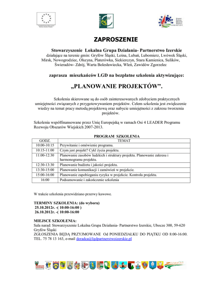 ZAPROSZENIE Stowarzyszenie Lokalna Grupa Działania- Partnerstwo Izerskie działające na terenie gmin: Gryfów Śląski, Leśna, Lubań, Lubomierz, Lwówek Śląski, Mirsk, Nowogrodziec, Olszyna, Platerówka, Siekierczyn, Stara Kamienica, Sulików, Świeradów- Zdrój, Warta Bolesławiecka, Wleń, Zawidów Zgorzelec zaprasza mieszkańców LGD na bezpłatne szkolenia aktywizujące: „PLANOWANIE PROJEKTÓW”. Szkolenia skierowane są do osób zainteresowanych zdobyciem praktycznych umiejętności związanych z przygotowywaniem projektów. Celem szkolenia jest zwiększenie wiedzy na temat pracy metodą projektową oraz nabycie umiejętności z zakresu tworzenia projektów. Szkolenia współfinansowane przez Unię Europejską w ramach Osi 4 LEADER Programu Rozwoju Obszarów Wiejskich 2007-2013. GODZ. 10:00-10:15 10:15-11:00 11:00-12:30 12:30-13:30 13:30-15:00 15:00-16:00 16:00 PROGRAM SZKOLENIA TEMAT Przywitanie i omówienie programu. Czym jest projekt? Cykl życia projektu. Planowanie zasobów ludzkich i struktury projektu. Planowanie zakresu i harmonogramu projektu. Planowanie budżetu i jakości projektu. Planowanie komunikacji i zamówień w projekcie. Planowanie zapobieganiu ryzyka w projekcie. Kontrola projektu. Podsumowanie i zakończenie szkolenia W trakcie szkolenia przewidziano przerwy kawowe. TERMINY SZKOLENIA: (do wyboru) 25.10.2012r. -( 10:00-16:00 ) 26.10.2012r. -( 10:00-16:00 MIEJSCE SZKOLENIA: Sala narad: Stowarzyszenie Lokalna Grupa Działania- Partnerstwo Izerskie, Ubocze 300, 59-620 Gryfów Śląski ZGŁOSZENIA BĘDĄ PRZYJMOWANE Od PONIEDZIAŁKU DO PIĄTKU OD 8:00-16:00. TEL. 75 78 13 163, e-mail [email protected] ZAPROSZENIE Stowarzyszenie Lokalna Grupa Działania- Partnerstwo Izerskie działające na terenie gmin: Gryfów Śląski, Leśna, Lubań, Lubomierz, Lwówek Śląski, Mirsk, Nowogrodziec, Olszyna, Platerówka, Siekierczyn, Stara Kamienica, Sulików, Świeradów- Zdrój, Warta Bolesławiecka, Wleń, Zawidów Zgorzelec zaprasza lokalnych liderów, przedstawicieli organizacji pozarządowych, osoby fizyczne, przedsiębiorców na bezpłatne szkolenie aktywizujące: „Jak założyć i prowadzić działalność gospodarczą w oparciu o zasoby wsi”. Szkolenia współfinansowane przez Unię Europejską w ramach Osi 4 LEADER Programu Rozwoju Obszarów Wiejskich 2007-2013. PROGRAM SZKOLENIA GODZ. 10:00-10:15 10:15-11:00 11:00-12:30 12:30-13:30 13:30-15:00 15:00-16:00 16:00 TEMAT Przywitanie i omówienie programu. Działalność gospodarcza- dopuszczalne prawne formy prowadzenia działalności gospodarczej Współczesna wieś i jej zasoby- na jakich zasobach budować konkurencyjne produkty i usługi? Dobre praktyki „zielonej” działalności gospodarczej w Europie i Polsce. Potencjalne źródła finansowania rozpoczęcia i rozwijania działalności gospodarczej na obszarach wiejskich; „Ziarnko do ziarnka…”- jak się odważyć i zaplanować rozwój działalności gospodarczej Pozwól się zauważyć- planowanie działań promocyjnych Podsumowanie i zakończenie szkolenia W trakcie szkolenia przewidziano przerwy kawowe. TERMINY SZKOLEŃ : (do wyboru) 16.10.2012- (10:00-16:00) 17.10.2012-( 10:00-16:00 ) MIEJSCE SZKOLENIA: Sala narad: Stowarzyszenie Lokalna Grupa Działania- Partnerstwo Izerskie, Ubocze 300, 59-620 Gryfów Śląski ZGŁOSZENIA BĘDĄ PRZYJMOWANE Od PONIEDZIAŁKU DO PIĄTKU OD 8:00-16:00. TEL. 75 78 13 163, e-mail [email protected]