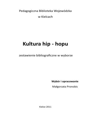 Pedagogiczna Biblioteka Wojewódzka w Kielcach Kultura hip - hopu zestawienie bibliograficzne w wyborze Wybór i opracowanie Małgorzata Pronobis Kielce 2011 1. Beith, Malcolm : Ile biedy, tyle rapu / Malcolm Beith, Katy M. Spencer // „Newsweek Polska”. - 2002, *nr+ 51/52, s. 186-190 *Hip hop narodził się ok. 30 lat temu w USA+ Czytelnia Pedagogicznej Biblioteki Wojewódzkiej 2. Bernasiewicz, Maciej : Subkultura hip-hopowa a problem narkotyków / Maciej Bernasiewicz // „Wychowanie na co Dzieo”. - 2006, nr 1/2, s. 19-22 *Zawarte teksty wybranych piosenek muzyki hip-hopowej i krótkie ich omówienie+ Czytelnia Pedagogicznej Biblioteki Wojewódzkiej 3. Bernasiewicz, Maciej : Treści kształcące w popkulturze / Maciej Bernasiewicz // „Chowanna”. - T. 1 (2009), *Tom jubileuszowy+, s. *183+-193 *Artykuł dostępny w Internecie http://www.sbc.org.pl/Content/12298/ Chowanna_tom_jubileuszowy.pdf. Wpływ wychowawczy prasy i muzyki hip-hop na młodzież. Kształtowanie tożsamości młodego pokolenia+ Czytelnia Pedagogicznej Biblioteki Wojewódzkiej 4. Bielak, Tomasz : Z archiwum śląskiego hip-hopu / Tomasz Bielak // „Opcje". - 2006, nr 1, s. 54-59 *Śląscy hip-hopowcy+ Czytelnia Pedagogicznej Biblioteki Wojewódzkiej 5. Buda, Andrzej : Jak komercjalizuje się hip-hop / Andrzej Buda // "Czas Kultury". 2003, nr 4, s.53-59 *Hip-hop jako kultura masowa+ Czytelnia Pedagogicznej Biblioteki Wojewódzkiej 6. Byd sobą, czyli hip hop / debatę przeprowadził i oprac. M.J. Sochocki // „Remedium”. - 2004, nr 9, dodatek s. VI-VII *Rozmowa z młodymi ludźmi na temat hip hopu+ Czytelnia Pedagogicznej Biblioteki Wojewódzkiej 7. Chang, Jeff : Planeta HIP-HOPU / Jeff Chang // “Forum”. - 2007, nr 47, s. 48-54 *Powstanie i rozpowszechnienie się muzyki hip-hop+ Wojewódzka Biblioteka Publiczna 8. Empire, Kitty : Skóra, fura i komóra / Kitty Empire // „Forum”. - 2004, nr 9, s. 41-*43+ *Muzyka hip-hop+ Wojewódzka Biblioteka Publiczna 9. Flicioski, Piotr : Hip-hop : słownik / Piotr Flicioski, Stanisław Wojtowicz . - Warszawa : Wydaw. Naukowe PWN, 2007 Sygn. 244941 Czytelnia Pedagogicznej Biblioteki Wojewódzkiej 10. Hoffman, Beata : "Gra w zielone", czyli o marihuanie w kulturze hip-hopowej / Beata Hoffman // „Problemy Opiekuoczo-Wychowawcze”. - 2006, nr 10, s. 21-26 *Używanie środków odurzających przez młodzież związaną z kulturą hip-hopową+ Czytelnia Pedagogicznej Biblioteki Wojewódzkiej 11. Jaworska, Justyna : Teatr dla ziomali / Justyna Jaworska // „Dialog". - 2005, nr 3, s. 154-159 *Obecnośd hip-hopu w teatrze amerykaoskim+ Czytelnia Pedagogicznej Biblioteki Wojewódzkiej 12. Jędrzejewski, Marek : Subkultura hip-hopu / Marek Jędrzejewski // „Problemy Opiekuoczo-Wychowawcze”. - 2002, nr 10, s. 30-36 *Charakterystyka i krótka historia hip-hopu i graffiti. Hip-hop jako sposób na życie+ Czytelnia Pedagogicznej Biblioteki Wojewódzkiej 13. Kondracka-Zielioska, Anna : Hip-hopowcy o ziomalach i lepakach, czyli obraz młodego pokolenia w tekstach "OSTR-ego" i "Kalibra 44" / Anna Kondracka-Zielioska // „Język Polski w Liceum”. – 2005/2006, nr 3, s. 73-91 *Wyjaśnienie zjawiska hip-hopu oraz pojęd z nim związanych. Interpretacja i analiza języka tekstów hip-hopowych+ Czytelnia Pedagogicznej Biblioteki Wojewódzkiej 14. Kondracka-Zielioska, Anna : Obraz młodego pokolenia w wybranych tekstach hiphopowych : (na podstawie utworu grup O.S.T.R. i Kaliber 44) / Anna KondrackaZielioska // „Albo Albo : problemy psychologii i kultury’. - 2004, nr 4, s. 145-154 *Definicja zjawiska hip-hopu. Kim są polscy hip-hpowscy+ Uniwersytet Humanistyczno-Przyrodniczy, Czytelnia Główna 15. Kuligowski, Waldemar : Hip-hop : w poszukiwaniu domu / Waldemar Kuligowski // „Czas Kultury". - 2005, nr 2, s. 12-19 *Kultura hip-hopu,rapu;palestyoska odmiana hip-hopu,pozycja i znaczenie hip-hopu w Izraelu+ Czytelnia Pedagogicznej Biblioteki Wojewódzkiej 16. Kwiatkowska-Ratajczak, Maria : Między chorałem, rockiem a hip hopem / Maria Kwiatkowska-Ratajczak // „Polonistyka”. - 2005, nr 3, s. 27(155)-33(161) *Wykorzystanie przez młodzież współczesnych tekstów poezji w muzyce hiphopowej i rockowej+ Czytelnia Pedagogicznej Biblioteki Wojewódzkiej 17. Materek, Dariusz : Kielce tętnią rapem / Dariusz Materek // „Teraz". - 2004, nr 4, s. 10-11 *Kielecki hip hop+ Czytelnia Pedagogicznej Biblioteki Wojewódzkiej 18. McBride, James : Planeta hip-hopu / James McBride // “National Geographic : Polska”. - 2007, nr 6, s. 100-115 *Historia hip-hopu. Artykuł zawiera 7 zdjęd+ Czytelnia Pedagogicznej Biblioteki Wojewódzkiej 19. Nawrot, Jacek : Refleksje w pobliżu hip-hopu / Jacek Nawrot // „Problemy Opiekuoczo-Wychowawcze”. - 2009, nr 10, s. 43-47 *Wpływ tekstów piosenek na język i zachowanie młodzieży+ Czytelnia Pedagogicznej Biblioteki Wojewódzkiej 20. Palęcka, Alicja : Najbogatsze z popularnych zjawisk : subkultury młodzieżowe / Alicja Palęcka // „Gazeta Szkolna : aktualności”. - 2004, nr 17, s. 11 *Kultura hip - hopu. Graffiti+ Czytelnia Pedagogicznej Biblioteki Wojewódzkiej 21. Perzanowski, Tadeusz : Hip hop - kultura dzieci gorszej szansy / Tadeusz Perzanowski // „Remedium”. - 2004, nr 7/8, s. 36-38 *Charakterystyka hip hopu jako części kultury młodzieżowej+ Czytelnia Pedagogicznej Biblioteki Wojewódzkiej 22. Radziszewska, Iwona : Hip-hop na pop top / Iwona Radziszewska // „Polityka”. 2004, nr 3, s. 62-64 *Muzyka i interesy - hiphopowy biznes, styl życia+ Czytelnia Pedagogicznej Biblioteki Wojewódzkiej 23. Rayzacher, Agnieszka : Hiphopowe manifesty / Agnieszka Rayzacher // „Cogito”. 2001, nr 10, s. 24-26 *Hip-hop - styl życia muzycznego młodzieży+ Czytelnia Pedagogicznej Biblioteki Wojewódzkiej 24. Rozbicki, Adam : Hip Hop do sukcesu : dzieci blokowisk i wolnego rynku / Adam Rozbicki // „Wprost”. - 2002, nr 43, s. 68-70 Wojewódzka Biblioteka Publiczna 25. Rychła, Joanna : Ucieczka, bunt, twórczośd : subkultura hip