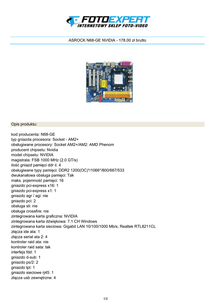 ASROCK N68-GE NVIDIA - 178.00 zł brutto Opis produktu: kod producenta: N68-GE typ gniazda procesora: Socket - AM2+ obsługiwane procesory: Socket AM2+/AM2: AMD Phenom producent chipsetu: Nvidia model chipsetu: NVIDIA magistrala: FSB 1000 MHz (2.0 GT/s) ilość gniazd pamięci ddr ii: 4 obsługiwane typy pamięci: DDR2 1200(OC)*/1066*/800/667/533 dwukanałowa obsługa pamięci: Tak maks. pojemność pamięci: 16 gniazdo pci-express x16: 1 gniazdo pci-express x1: 1 gniazdo agr / agi: nie gniazdo pci: 2 obsługa sli: nie obsługa crossfire: nie zintegrowana karta graficzna: NVIDIA zintegrowana karta dźwiękowa: 7.1 CH Windows zintegrowana karta sieciowa: Gigabit LAN 10/100/1000 Mb/s, Realtek RTL8211CL złącza ide ata: 1 złącza serial ata 2: 4 kontroler raid ata: nie kontroler raid sata: tak interfejs fdd: 1 gniazdo d-sub: 1 gniazdo ps/2: 2 gniazdo lpt: 1 gniazdo sieciowe rj45: 1 złącza usb zewnętrzne: 4 1/2 złącza usb wewnętrzne: 6 gniazda audio analogowe: 6 gniazda zasilania: 24 pin ATX, 4 pin 12V, CPU/Chassis/Power FAN dodatkowe złącza wewnętrzne: 1 x COM, CD in, Front panel audio standard: mikro ATX wymiary (wys x szer): 24.4 cm x 20.8 cm www: http://www.asrock.com/mb/overview.asp?Model=N68-GE obsługiwane procesory: Socket AM2+/AM2: AMD Phenom? FX / Phenom / Athlon 64 FX / Athlon 64 X2 Dual-Core / Athlon X2 Dual-Core / Athlon 64 / Sempron. AM3: AMD Phenom? II X4 / X3 / X2 and Athlon II X4 / X3 / X2 model chipsetu: NVIDIA? GeForce 7025 / nForce 630a zintegrowana karta graficzna: NVIDIA? GeForce 7025, DX9.0 VGA, Pixel Shader 3.0, maksymalna wielkość pamięci współdzielonej 256MB zintegrowana karta dźwiękowa: 7.1 CH Windows? Vista? Premium Level HD Audio (VIA? VT1708S Audio Codec) www: Aparaty cyfrowe ASROCK N68-GE NVIDIA e-mail: [email protected] Forum: www.forum.fotoexpert.pl tel.: (0)68 320 23 45, (0)68 320-23-34, (0)509 598 697 2/2