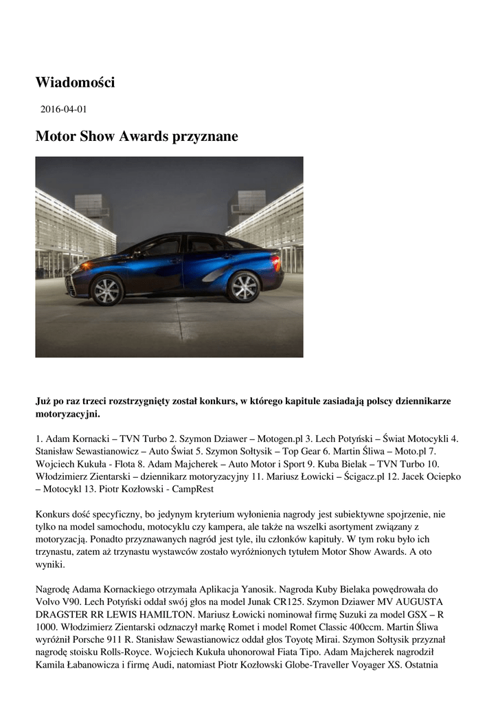 Wiadomości 2016-04-01 Motor Show Awards przyznane Już po raz trzeci rozstrzygnięty został konkurs, w którego kapitule zasiadają polscy dziennikarze motoryzacyjni. 1. Adam Kornacki – TVN Turbo 2. Szymon Dziawer – Motogen.pl 3. Lech Potyński – Świat Motocykli 4. Stanisław Sewastianowicz – Auto Świat 5. Szymon Sołtysik – Top Gear 6. Martin Śliwa – Moto.pl 7. Wojciech Kukuła - Flota 8. Adam Majcherek – Auto Motor i Sport 9. Kuba Bielak – TVN Turbo 10. Włodzimierz Zientarski – dziennikarz motoryzacyjny 11. Mariusz Łowicki – Ścigacz.pl 12. Jacek Ociepko – Motocykl 13. Piotr Kozłowski - CampRest Konkurs dość specyficzny, bo jedynym kryterium wyłonienia nagrody jest subiektywne spojrzenie, nie tylko na model samochodu, motocyklu czy kampera, ale także na wszelki asortyment związany z motoryzacją. Ponadto przyznawanych nagród jest tyle, ilu członków kapituły. W tym roku było ich trzynastu, zatem aż trzynastu wystawców zostało wyróżnionych tytułem Motor Show Awards. A oto wyniki. Nagrodę Adama Kornackiego otrzymała Aplikacja Yanosik. Nagroda Kuby Bielaka powędrowała do Volvo V90. Lech Potyński oddał swój głos na model Junak CR125. Szymon Dziawer MV AUGUSTA DRAGSTER RR LEWIS HAMILTON. Mariusz Łowicki nominował firmę Suzuki za model GSX – R 1000. Włodzimierz Zientarski odznaczył markę Romet i model Romet Classic 400ccm. Martin Śliwa wyróżnił Porsche 911 R. Stanisław Sewastianowicz oddał głos Toyotę Mirai. Szymon Sołtysik przyznał nagrodę stoisku Rolls-Royce. Wojciech Kukuła uhonorował Fiata Tipo. Adam Majcherek nagrodził Kamila Łabanowicza i firmę Audi, natomiast Piotr Kozłowski Globe-Traveller Voyager XS. Ostatnia nagroda imienia Jacka Ociepko przypadła KTM 1290 Super Duke GT. Grand Prix Motor Show Awards, czyli wspólna nagroda całej kapituły przypadła w tym roku marce Hyundai za model Elantra i jego europejską premierę, która odbyła się na targach Motor Show. Sponsorem targów Motor Show jest Otomoto oraz Bank Zachodni WBK Grupa Santander. Źródło: MTP WIĘCEJ: czytaj w kolejnych wydaniach miesięcznika „Paliwa Płynne” XXIII Międzynarodowe Targi STACJA PALIW 2016, 11-13 maja 2016 r. EXPO XXI Warszawa (opr. pb) Źródło: http://www.paliwa.pl/strona-startowa/archiwum/motor-show-awards-przyznane Powered by TCPDF (www.tcpdf.org)