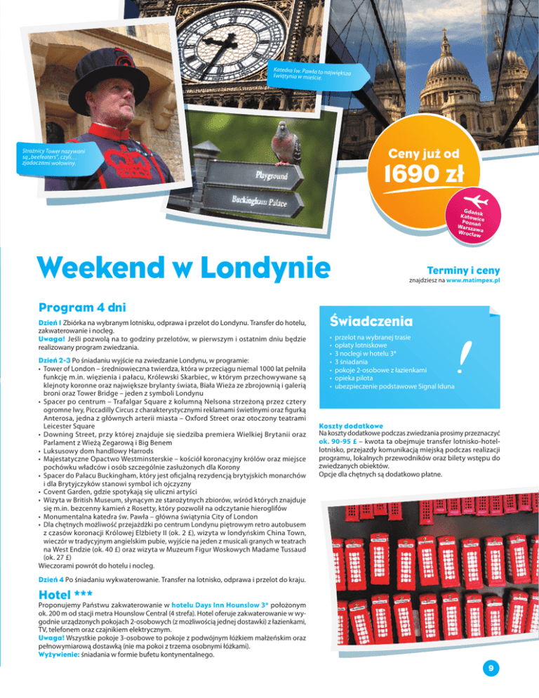 Katedra św. Pawła to najw iększa świątynia w mieście. Ceny już od Strażnicy Tower nazywani są „beefeaters”, czyli… zjadaczami wołowiny. 1690 zł Gdań Katow sk ic Pozna e Warsza ń w Wrocła a w Weekend w Londynie Program 4 dni Dzień 1 Zbiórka na wybranym lotnisku, odprawa i przelot do Londynu. Transfer do hotelu, zakwaterowanie i nocleg. Uwaga! Jeśli pozwolą na to godziny przelotów, w pierwszym i ostatnim dniu będzie realizowany program zwiedzania. Dzień 2-3 Po śniadaniu wyjście na zwiedzanie Londynu, w programie: • Tower of London – średniowieczna twierdza, która w przeciągu niemal 1000 lat pełniła funkcję m.in. więzienia i pałacu, Królewski Skarbiec, w którym przechowywane są klejnoty koronne oraz największe brylanty świata, Biała Wieża ze zbrojownią i galerią broni oraz Tower Bridge – jeden z symboli Londynu • Spacer po centrum – Trafalgar Square z kolumną Nelsona strzeżoną przez cztery ogromne lwy, Piccadilly Circus z charakterystycznymi reklamami świetlnymi oraz figurką Anterosa, jedna z głównych arterii miasta – Oxford Street oraz otoczony teatrami Leicester Square • Downing Street, przy której znajduje się siedziba premiera Wielkiej Brytanii oraz Parlament z Wieżą Zegarową i Big Benem • Luksusowy dom handlowy Harrods • Majestatyczne Opactwo Westminsterskie – kościół koronacyjny królów oraz miejsce pochówku władców i osób szczególnie zasłużonych dla Korony • Spacer do Pałacu Buckingham, który jest oficjalną rezydencją brytyjskich monarchów i dla Brytyjczyków stanowi symbol ich ojczyzny • Covent Garden, gdzie spotykają się uliczni artyści • Wizyta w British Museum, słynącym ze starożytnych zbiorów, wśród których znajduje się m.in. bezcenny kamień z Rosetty, który pozwolił na odczytanie hieroglifów • Monumentalna katedra św. Pawła – główna świątynia City of London • Dla chętnych możliwość przejażdżki po centrum Londynu piętrowym retro autobusem z czasów koronacji Królowej Elżbiety II (ok. 2 £), wizyta w londyńskim China Town, wieczór w tradycyjnym angielskim pubie, wyjście na jeden z musicali granych w teatrach na West Endzie (ok. 40 £) oraz wizyta w Muzeum Figur Woskowych Madame Tussaud (ok. 27 £) Wieczorami powrót do hotelu i nocleg. Terminy i ceny znajdziesz na www.matimpex.pl Świadczenia • przelot na wybranej trasie • opłaty lotniskowe • 3 noclegi w hotelu 3* • 3 śniadania • pokoje 2-osobowe z łazienkami • opieka pilota • ubezpieczenie podstawowe Signal Iduna Koszty dodatkowe Na koszty dodatkowe podczas zwiedzania prosimy przeznaczyć ok. 90-95 £ – kwota ta obejmuje transfer lotnisko-hotellotnisko, przejazdy komunikacją miejską podczas realizacji programu, lokalnych przewodników oraz bilety wstępu do zwiedzanych obiektów. Opcje dla chętnych są dodatkowo płatne. Dzień 4 Po śniadaniu wykwaterowanie. Transfer na lotnisko, odprawa i przelot do kraju. Hotel *** Proponujemy Państwu zakwaterowanie w hotelu Days Inn Hounslow 3* położonym ok. 200 m od stacji metra Hounslow Central (4 strefa). Hotel oferuje zakwaterowanie w wygodnie urządzonych pokojach 2-osobowych (z możliwością jednej dostawki) z łazienkami, TV, telefonem oraz czajnikiem elektrycznym. Uwaga! Wszystkie pokoje 3-osobowe to pokoje z podwójnym łóżkiem małżeńskim oraz pełnowymiarową dostawką (nie ma pokoi z trzema osobnymi łóżkami). Wyżywienie: śniadania w formie bufetu kontynentalnego. 9