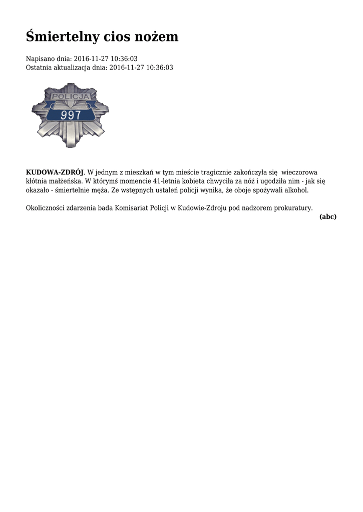 Śmiertelny cios nożem Napisano dnia: 2016-11-27 10:36:03 Ostatnia aktualizacja dnia: 2016-11-27 10:36:03 KUDOWA-ZDRÓJ. W jednym z mieszkań w tym mieście tragicznie zakończyła się wieczorowa kłótnia małżeńska. W którymś momencie 41-letnia kobieta chwyciła za nóż i ugodziła nim - jak się okazało - śmiertelnie męża. Ze wstępnych ustaleń policji wynika, że oboje spożywali alkohol. Okoliczności zdarzenia bada Komisariat Policji w Kudowie-Zdroju pod nadzorem prokuratury. (abc)