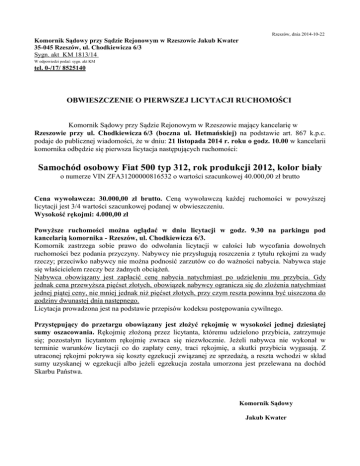 Rzeszów, dnia 2014-10-22 Komornik Sądowy przy Sądzie Rejonowym w Rzeszowie Jakub Kwater 35-045 Rzeszów, ul. Chodkiewicza 6/3 Sygn. akt KM 1813/14 W odpowiedzi podać: sygn. akt KM tel. 0-/17/ 8525140 OBWIESZCZENIE O PIERWSZEJ LICYTACJI RUCHOMOŚCI Komornik Sądowy przy Sądzie Rejonowym w Rzeszowie mający kancelarię w Rzeszowie przy ul. Chodkiewicza 6/3 (boczna ul. Hetmańskiej) na podstawie art. 867 k.p.c. podaje do publicznej wiadomości, że w dniu: 21 listopada 2014 r. roku o godz. 10.00 w kancelarii komornika odbędzie się pierwsza licytacja następujących ruchomości: Samochód osobowy Fiat 500 typ 312, rok produkcji 2012, kolor biały o numerze VIN ZFA31200000816532 o wartości szacunkowej 40.000,00 zł brutto Cena wywoławcza: 30.000,00 zł brutto. Ceną wywoławczą każdej ruchomości w powyższej licytacji jest 3/4 wartości szacunkowej podanej w obwieszczeniu. Wysokość rękojmi: 4.000,00 zł Powyższe ruchomości można oglądać w dniu licytacji w godz. 9.30 na parkingu pod kancelarią komornika - Rzeszów, ul. Chodkiewicza 6/3. Komornik zastrzega sobie prawo do odwołania licytacji w całości lub wycofania dowolnych ruchomości bez podania przyczyny. Nabywcy nie przysługują roszczenia z tytułu rękojmi za wady rzeczy; przeciwko nabywcy nie można podnosić zarzutów co do ważności nabycia. Nabywca staje się właścicielem rzeczy bez żadnych obciążeń. Nabywca obowiązany jest zapłacić cenę nabycia natychmiast po udzieleniu mu przybcia. Gdy jednak cena przewyższa pięćset złotych, obowiązek nabywcy ogranicza się do zlożenia natychmiast jednej piątej ceny, nie mniej jednak niż pięćset złotych, przy czym reszta powinna być uiszczona do godziny dwunastej dnia następnego. Licytacja prowadzona jest na podstawie przepisów kodeksu postępowania cywilnego. Przystępujący do przetargu obowiązany jest złożyć rękojmię w wysokości jednej dziesiątej sumy oszacowania. Rękojmię złożoną przez licytanta, któremu udzielono przybicia, zatrzymuje się; pozostałym licytantom rękojmię zwraca się niezwłocznie. Jeżeli nabywca nie wykonał w terminie warunków licytacji co do zapłaty ceny, traci rękojmię, a skutki przybicia wygasają. Z utraconej rękojmi pokrywa się koszty egzekucji związanej ze sprzedażą, a reszta wchodzi w skład sumy uzyskanej w egzekucji albo jeżeli egzekucja została umorzona jest przelewana na dochód Skarbu Państwa. Komornik Sądowy Jakub Kwater Otrzymują: - wierzyciel; - dłużnik; - Sąd Rejonowy - tablica ogłoszeń; - Urząd Miasta Rzeszowa - tablica ogłoszeń