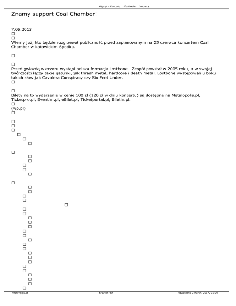 Gigs.pl - Koncerty :: Festiwale :: Imprezy Znamy support Coal Chamber! 7.05.2013 Wiemy już, kto będzie rozgrzewał publiczność przed zaplanowanym na 25 czerwca koncertem Coal Chamber w katowickim Spodku. Przed gwiazdą wieczoru wystąpi polska formacja Lostbone. Zespół powstał w 2005 roku, a w swojej twórczości łączy takie gatunki, jak thrash metal, hardcore i death metal. Lostbone występowali u boku takich sław jak Cavalera Conspiracy czy Six Feet Under. Bilety na to wydarzenie w cenie 100 zł (120 zł w dniu koncertu) są dostępne na Metalopolis.pl, Ticketpro.pl, Eventim.pl, eBilet.pl, Ticketportal.pl, Biletin.pl. (wp.pl) http://gigs.pl Kreator PDF Utworzono 2 March, 2017, 01:29 Gigs.pl - Koncerty :: Festiwale :: Imprezy http://gigs.pl Kreator PDF Utworzono 2 March, 2017, 01:29