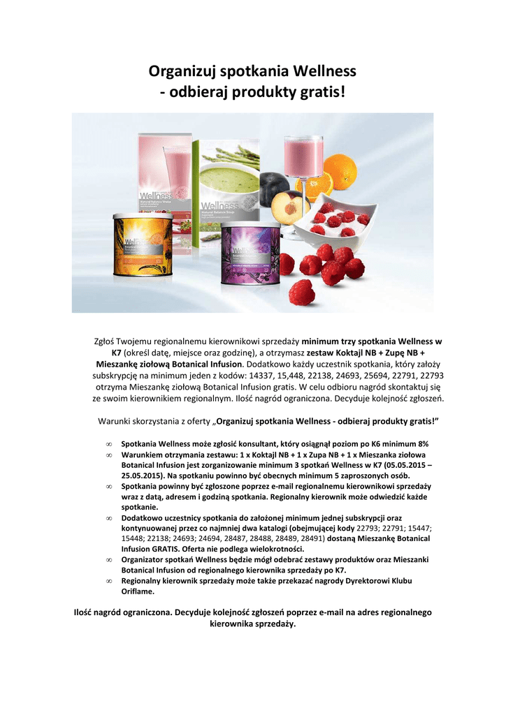 Organizuj spotkania Wellness - odbieraj produkty gratis! Zgłoś Twojemu regionalnemu kierownikowi sprzedaży minimum trzy spotkania Wellness w K7 (określ datę, miejsce oraz godzinę), a otrzymasz zestaw Koktajl NB + Zupę NB + Mieszankę ziołową Botanical Infusion. Dodatkowo każdy uczestnik spotkania, który założy subskrypcję na minimum jeden z kodów: 14337, 15,448, 22138, 24693, 25694, 22791, 22793 otrzyma Mieszankę ziołową Botanical Infusion gratis. W celu odbioru nagród skontaktuj się ze swoim kierownikiem regionalnym. Ilość nagród ograniczona. Decyduje kolejność zgłoszeń. Warunki skorzystania z oferty „Organizuj spotkania Wellness - odbieraj produkty gratis!” • • • • • • Spotkania Wellness może zgłosić konsultant, który osiągnął poziom po K6 minimum 8% Warunkiem otrzymania zestawu: 1 x Koktajl NB + 1 x Zupa NB + 1 x Mieszanka ziołowa Botanical Infusion jest zorganizowanie minimum 3 spotkań Wellness w K7 (05.05.2015 – 25.05.2015). Na spotkaniu powinno być obecnych minimum 5 zaproszonych osób. Spotkania powinny być zgłoszone poprzez e-mail regionalnemu kierownikowi sprzedaży wraz z datą, adresem i godziną spotkania. Regionalny kierownik może odwiedzić każde spotkanie. Dodatkowo uczestnicy spotkania do założonej minimum jednej subskrypcji oraz kontynuowanej przez co najmniej dwa katalogi (obejmującej kody 22793; 22791; 15447; 15448; 22138; 24693; 24694, 28487, 28488, 28489, 28491) dostaną Mieszankę Botanical Infusion GRATIS. Oferta nie podlega wielokrotności. Organizator spotkań Wellness będzie mógł odebrać zestawy produktów oraz Mieszanki Botanical Infusion od regionalnego kierownika sprzedaży po K7. Regionalny kierownik sprzedaży może także przekazać nagrody Dyrektorowi Klubu Oriflame. Ilość nagród ograniczona. Decyduje kolejność zgłoszeń poprzez e-mail na adres regionalnego kierownika sprzedaży. WYJĄTKOWA OFERTA- TORBY PUMA W CENIE 19,90 Drogi Klubowiczu - jeżeli w K4 założyłeś minimum 3 subskrypcje na kody: 22793; 22791; 15447; 15448; 22138; 24693; 24694 oraz kontynuowałeś je w K5 oraz K6, to w K7 możesz kupić torbę PUMA (kod: 28656) w cenie CH - 19.90 zł , OH – 8,09 zł; PP – 3.