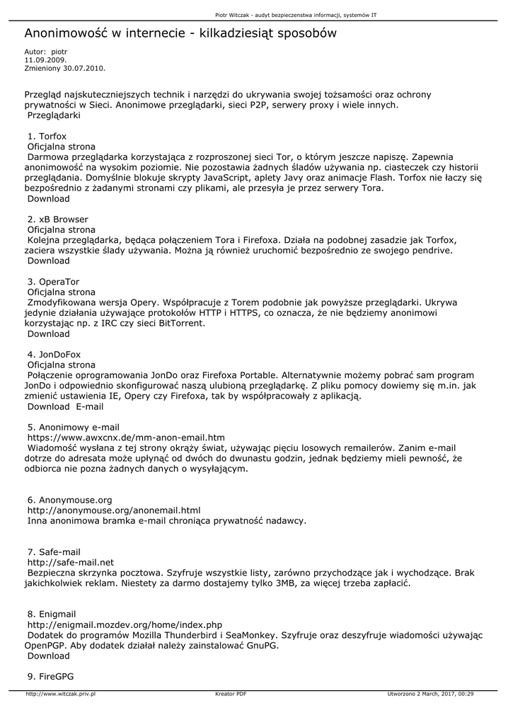 Piotr Witczak - audyt bezpieczenstwa informacji, systemów IT Anonimowość w internecie - kilkadziesiąt sposobów Autor: piotr 11.09.2009. Zmieniony 30.07.2010. Przegląd najskuteczniejszych technik i narzędzi do ukrywania swojej tożsamości oraz ochrony prywatności w Sieci. Anonimowe przeglądarki, sieci P2P, serwery proxy i wiele innych. Przeglądarki 1. Torfox Oficjalna strona Darmowa przeglądarka korzystająca z rozproszonej sieci Tor, o którym jeszcze napiszę. Zapewnia anonimowość na wysokim poziomie. Nie pozostawia żadnych śladów używania np. ciasteczek czy historii przeglądania. Domyślnie blokuje skrypty JavaScript, aplety Javy oraz animacje Flash. Torfox nie łaczy się bezpośrednio z żadanymi stronami czy plikami, ale przesyła je przez serwery Tora. Download 2. xB Browser Oficjalna strona Kolejna przeglądarka, będąca połączeniem Tora i Firefoxa. Działa na podobnej zasadzie jak Torfox, zaciera wszystkie ślady używania. Można ją również uruchomić bezpośrednio ze swojego pendrive. Download 3. OperaTor Oficjalna strona Zmodyfikowana wersja Opery. Współpracuje z Torem podobnie jak powyższe przeglądarki. Ukrywa jedynie działania używające protokołów HTTP i HTTPS, co oznacza, że nie będziemy anonimowi korzystając np. z IRC czy sieci BitTorrent. Download 4. JonDoFox Oficjalna strona Połączenie oprogramowania JonDo oraz Firefoxa Portable. Alternatywnie możemy pobrać sam program JonDo i odpowiednio skonfigurować naszą ulubioną przeglądarkę. Z pliku pomocy dowiemy się m.in. jak zmienić ustawienia IE, Opery czy Firefoxa, tak by współpracowały z aplikacją. Download E-mail 5. Anonimowy e-mail https://www.awxcnx.de/mm-anon-email.htm Wiadomość wysłana z tej strony okrąży świat, używając pięciu losowych remailerów. Zanim e-mail dotrze do adresata może upłynąć od dwóch do dwunastu godzin, jednak będziemy mieli pewność, że odbiorca nie pozna żadnych danych o wysyłającym. 6. Anonymouse.org http://anonymouse.org/anonemail.html Inna anonimowa bramka e-mail chroniąca prywatność nadawcy. 7. Safe-mail http://safe-mail.net Bezpieczna skrzynka pocztowa. Szyfruje wszystkie listy, zarówno przychodzące jak i wychodzące. Brak jakichkolwiek reklam. Niestety za darmo dostajemy tylko 3MB, za więcej trzeba zapłacić. 8. Enigmail http://enigmail.mozdev.org/home/index.php Dodatek do programów Mozilla Thunderbird i SeaMonkey. Szyfruje oraz deszyfruje wiadomości używając OpenPGP. Aby dodatek działał należy zainstalować GnuPG. Download 9. FireGPG http://www.witczak.priv.pl Kreator PDF Utworzono 2 March, 2017, 00:29 Piotr Witczak - audyt bezpieczenstwa informacji, systemów IT http://pl.getfiregpg.org/s/home Rozszerzenie do przeglądarki Firefox. Umożliwia szyfrowanie, deszyfrowanie oraz podpisywanie danych. Download Wymiana plików 10. GNUnet Oficjalna strona Narzędzie pozwalające na bezpieczne i anonimowe wymienianie się plikami w sieci P2P. Jest częścią projektu GNU. Niestety jest wciąż mało popularne i na razie może zapewnić jedynie niewielką ilość zasobów. Download 11. MUTE Oficjalna strona Prosty klient P2P, umożliwiający anonimowe dzielenie się plikami. Rozpowszechniany na licencji Public domain. Obsługuje różne systemy operacyjne. Download 12. ANts P2P Oficjalna strona Udostępniona na licencji GPL aplikacja do anonimowego współdzielenia plików w sieci P2P. Wymaga zainstalowanej Javy. Download 13. Nodezilla Oficjalna strona Oprócz wymiany plików Nodezilla dostarcza takich usług jak czat czy transmisja strumieni wideo. Wszystkie przesyłane dane są szyfrowane, a węzły nie posiadają informacji o obiektach oraz ich pochodzeniu. Program nie zbiera żadnych danych o użytkownikach. Download 14. WASTE Oficjalna strona Bezpieczny program friend-to-friend (F2F). Pliki w tej sieci współdzielone są przez niewielkie grupy użytkowników, którzy zazwyczaj znają się nawzajem, co bardzo zwiększa poziom bezpieczeństwa. Dodatkowe funkcje aplikacji to czat, komunikator, przeglądarka oraz wyszukiwarka plików. Download 15. Rodi Oficjalna strona Niewielki klient P2P napisany w Javie. Download 16. SUMI Oficjalna strona Program wykorzystuje IP Spoofing, czyli fałszuje źródłowy adres IP. W założeniu ma zapewnić całkowitą anonimowość uploaderowi. Pliki w tej sieci przyjmują format podobny do torrenta: .sumi. Download 17. StealthNet Oficjalna strona Klient P2P bazujący na aplikacji RShare. Download 18. OFF System Oficjalna strona OFF System (Owner-Free File System) stworzony przez The Digital Douwd (koalicję hakerów) został skonstruowany tak, by uniemożliwić pozywanie użytkowników programu za ściąganie plików chronionych prawami autorskimi. Mechanizm działania sieci jest szczegółowo opisany na stronie domowej projektu. Download http://www.witczak.priv.pl Kreator PDF Utworzono 2 March, 2017, 00:29 Piotr Witczak - audyt bezpieczenstwa informacji, systemów IT pozostałe sposoby na stronie: http://www.heptan.pl/article/27/40_sposobow_na_anonimowosc_w_Internecie/2 http://www.witczak.priv.pl Kreator PDF Utworzono 2 March, 2017, 00:29