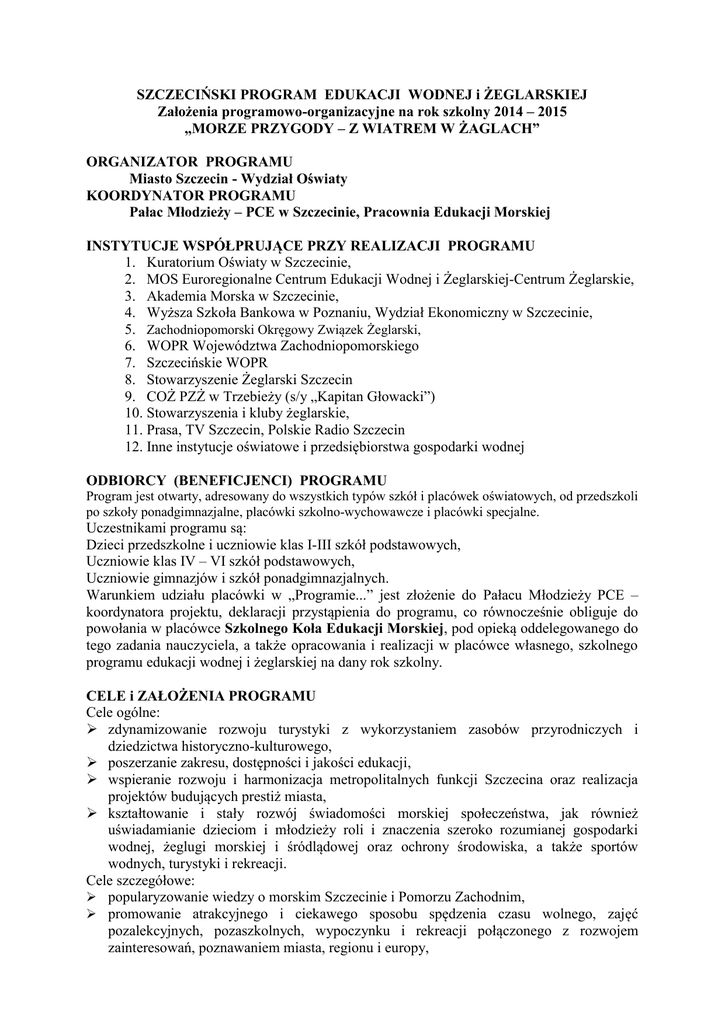 SZCZECIŃSKI PROGRAM EDUKACJI WODNEJ i ŻEGLARSKIEJ Założenia programowo-organizacyjne na rok szkolny 2014 – 2015 „MORZE PRZYGODY – Z WIATREM W ŻAGLACH” ORGANIZATOR PROGRAMU Miasto Szczecin - Wydział Oświaty KOORDYNATOR PROGRAMU Pałac Młodzieży – PCE w Szczecinie, Pracownia Edukacji Morskiej INSTYTUCJE WSPÓŁPRUJĄCE PRZY REALIZACJI PROGRAMU 1. Kuratorium Oświaty w Szczecinie, 2. MOS Euroregionalne Centrum Edukacji Wodnej i Żeglarskiej-Centrum Żeglarskie, 3. Akademia Morska w Szczecinie, 4. Wyższa Szkoła Bankowa w Poznaniu, Wydział Ekonomiczny w Szczecinie, 5. Zachodniopomorski Okręgowy Związek Żeglarski, 6. WOPR Województwa Zachodniopomorskiego 7. Szczecińskie WOPR 8. Stowarzyszenie Żeglarski Szczecin 9. COŻ PZŻ w Trzebieży (s/y „Kapitan Głowacki”) 10. Stowarzyszenia i kluby żeglarskie, 11. Prasa, TV Szczecin, Polskie Radio Szczecin 12. Inne instytucje oświatowe i przedsiębiorstwa gospodarki wodnej ODBIORCY (BENEFICJENCI) PROGRAMU Program jest otwarty, adresowany do wszystkich typów szkół i placówek oświatowych, od przedszkoli po szkoły ponadgimnazjalne, placówki szkolno-wychowawcze i placówki specjalne. Uczestnikami programu są: Dzieci przedszkolne i uczniowie klas I-III szkół podstawowych, Uczniowie klas IV – VI szkół podstawowych, Uczniowie gimnazjów i szkół ponadgimnazjalnych. Warunkiem udziału placówki w „Programie...” jest złożenie do Pałacu Młodzieży PCE – koordynatora projektu, deklaracji przystąpienia do programu, co równocześnie obliguje do powołania w placówce Szkolnego Koła Edukacji Morskiej, pod opieką oddelegowanego do tego zadania nauczyciela, a także opracowania i realizacji w placówce własnego, szkolnego programu edukacji wodnej i żeglarskiej na dany rok szkolny. CELE i ZAŁOŻENIA PROGRAMU Cele ogólne: zdynamizowanie rozwoju turystyki z wykorzystaniem zasobów przyrodniczych i dziedzictwa historyczno-kulturowego, poszerzanie zakresu, dostępności i jakości edukacji, wspieranie rozwoju i harmonizacja metropolitalnych funkcji Szczecina oraz realizacja projektów budujących prestiż miasta, kształtowanie i stały rozwój świadomości morskiej społeczeństwa, jak również uświadamianie dzieciom i młodzieży roli i znaczenia szeroko rozumianej gospodarki wodnej, żeglugi morskiej i śródlądowej oraz ochrony środowiska, a także sportów wodnych, turystyki i rekreacji. Cele szczegółowe: popularyzowanie wiedzy o morskim Szczecinie i Pomorzu Zachodnim, promowanie atrakcyjnego i ciekawego sposobu spędzenia czasu wolnego, zajęć pozalekcyjnych, pozaszkolnych, wypoczynku i rekreacji połączonego z rozwojem zainteresowań, poznawaniem miasta, regionu i europy, kształtowanie pozytywnych cech osobowych uczniów, dyscypliny, odpowiedzialności i pracy w zespole poprzez „żeglarską szkołę życia”- organizowane szkolenia żeglarskie, wyprawy i rejsy , edukację wodną i żeglarską ze szczególnym uwzględnieniem upowszechniania wśród dzieci i młodzieży szkolnej, wiedzy o morzu i żeglarstwie. rewalidacja wychowanków placówek specjalnych, uczestniczących w programie. TEMATY WIODĄCE 70-lecie polskiego żeglarstwa w Szczecinie i na Pomorzu Zachodnim, 20-lecie szczecińskiego programu edukacji morskiej, Bałtyk łączy-jachtem i żaglowcem po Europie i świecie Szczecin miastem przyjaznym dla żeglarzy. Poznaj morski Szczecin - walory turystyczne Szczecina i Pomorza zachodniego. Podstawy wiedzy morskiej i żeglarskiej projekt „Na szlaku wielkich wypraw" Popularyzowanie turystyki żeglarskiej, w tym przygotowanie załóg i jachtów, jako młodzieżowej reprezentacji Szczecina do udziału w rejsach, regatach i wyprawach żeglarskich. Baltic Tall Ships Regatta 2015 Regaty na Morzu Bałtyckim organizowane przez STI na trasie: Kłajpeda (Litwa) – Szczecin (Polska) Termin: 05 – 15 czerwca 2015 roku. Baltic Tall Ships Races 2015 Regaty na Morzu Północnym organizowane przez STI na trasie: Belfast (UK) – Alesund (Norwegia) – Kristiansand (Norwegia) – Aalborg (Dania) Termin: 02 lipca do 04 sierpnia 2015 roku. projekt „Rejsy Odkrywców” Popularyzacja żeglarstwa i sportów wodnych wśród dzieci i młodzieży, jako sposobu na życie jest ważnym założeniem edukacyjnym umożliwiającym poznanie świata zasad i wartości. Organizowanie wypraw żeglarskich i wodnych, zarówno dla najmłodszych, jak i starszej młodzieży. Rejsy z bogatym programem przyrodniczym, geograficznym, historycznym oraz szkoleniowym. Wyprawy po akwenach Szczecina i Pomorza, wyprawy tematyczne, wyprawy kajakowe, duże wyprawy żeglarskie. Wyprawa Narvik 2015 Wyprawa na jachcie „Śmiały” na akwenie Morza Bałtyckiego, Atlantyku (M. Północne, M. Norweskie, M. Barentsa), Oceanu Arktycznego, organizator „Żeglarski Szczecin”, na trasie: Szczecin – Kopenhaga – Kristiansand – Bergen – Narvik – Hornsund – Longyearbyen (Spitsbergen) – Stavanger – Kopenhaga – Szczecin; płynąc żeglarze zobaczą wyspy: Lofoty, Wyspę Niedźwiedzią i inne. Termin: 31 maja – 08 sierpnia 2015 roku. projekt „Morskie Oblicze Szczecina" Działania edukacyjne realizowane przez szkoły i placówki oświatowe, szkolne koła edukacji morskiej w formie imprez, konkursów wiedzy, artystycznych (plastycznych, recytatorskich, fotograficznych, muzycznych) oraz warsztatów marynistycznych podnoszących i popularyzujących wiedzę o historii, tradycjach i morskości Szczecina i Regionu. Opracowanie i realizacja działań edukacyjnych i promocyjnych w oparciu o Kalendarz imprez marynistycznych na rok szkolny 2014/2015. projekt „Z wiatrem w Żaglach” Praktyczne szkolenia uczestników Programu uczniów i nauczycieli, „ABC żeglarskie”, w oparciu o instruktorów, bazę i sprzęt Międzyszkolnego Ośrodka Sportowego Eureregionalnego Centrum Edukacji Wodnej i Żeglarskiej, a także na żaglowcach czarterowanych od innych armatorów, w miarę potrzeb. Organizacja i udział w: podstawowych szkoleniach