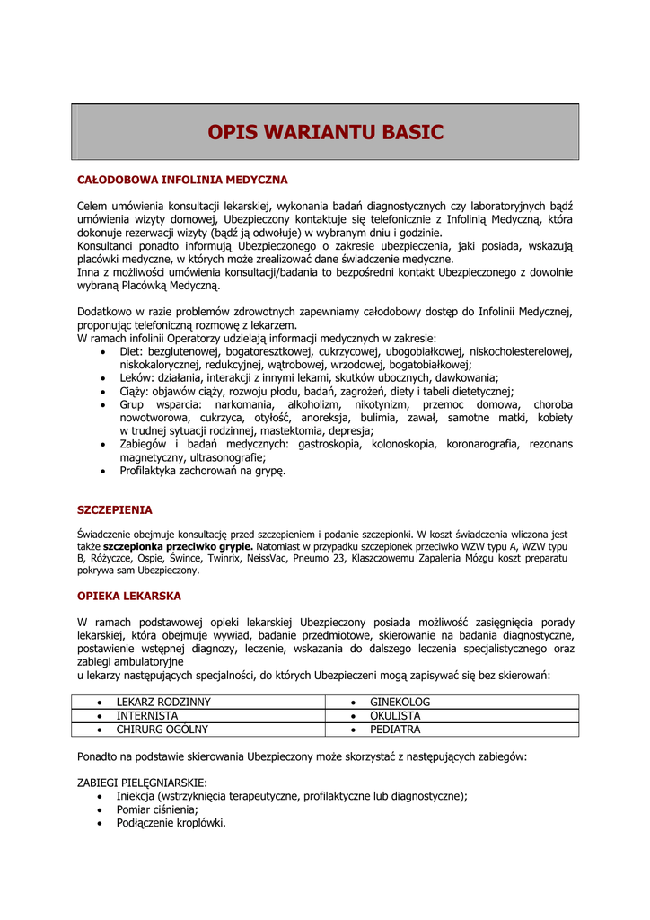 OPIS WARIANTU BASIC CAŁODOBOWA INFOLINIA MEDYCZNA Celem umówienia konsultacji lekarskiej, wykonania badań diagnostycznych czy laboratoryjnych bądź umówienia wizyty domowej, Ubezpieczony kontaktuje się telefonicznie z Infolinią Medyczną, która dokonuje rezerwacji wizyty (bądź ją odwołuje) w wybranym dniu i godzinie. Konsultanci ponadto informują Ubezpieczonego o zakresie ubezpieczenia, jaki posiada, wskazują placówki medyczne, w których może zrealizować dane świadczenie medyczne. Inna z możliwości umówienia konsultacji/badania to bezpośredni kontakt Ubezpieczonego z dowolnie wybraną Placówką Medyczną. Dodatkowo w razie problemów zdrowotnych zapewniamy całodobowy dostęp do Infolinii Medycznej, proponując telefoniczną rozmowę z lekarzem. W ramach infolinii Operatorzy udzielają informacji medycznych w zakresie: · Diet: bezglutenowej, bogatoresztkowej, cukrzycowej, ubogobiałkowej, niskocholesterelowej, niskokalorycznej, redukcyjnej, wątrobowej, wrzodowej, bogatobiałkowej; · Leków: działania, interakcji z innymi lekami, skutków ubocznych, dawkowania; · Ciąży: objawów ciąży, rozwoju płodu, badań, zagrożeń, diety i tabeli dietetycznej; · Grup wsparcia: narkomania, alkoholizm, nikotynizm, przemoc domowa, choroba nowotworowa, cukrzyca, otyłość, anoreksja, bulimia, zawał, samotne matki, kobiety w trudnej sytuacji rodzinnej, mastektomia, depresja; · Zabiegów i badań medycznych: gastroskopia, kolonoskopia, koronarografia, rezonans magnetyczny, ultrasonografie; · Profilaktyka zachorowań na grypę. SZCZEPIENIA Świadczenie obejmuje konsultację przed szczepieniem i podanie szczepionki. W koszt świadczenia wliczona jest także szczepionka przeciwko grypie. Natomiast w przypadku szczepionek przeciwko WZW typu A, WZW typu B, Różyczce, Ospie, Śwince, Twinrix, NeissVac, Pneumo 23, Klaszczowemu Zapalenia Mózgu koszt preparatu pokrywa sam Ubezpieczony. OPIEKA LEKARSKA W ramach podstawowej opieki lekarskiej Ubezpieczony posiada możliwość zasięgnięcia porady lekarskiej, która obejmuje wywiad, badanie przedmiotowe, skierowanie na badania diagnostyczne, postawienie wstępnej diagnozy, leczenie, wskazania do dalszego leczenia specjalistycznego oraz zabiegi ambulatoryjne u lekarzy następujących specjalności, do których Ubezpieczeni mogą zapisywać się bez skierowań: · · · LEKARZ RODZINNY INTERNISTA CHIRURG OGÓLNY · · · GINEKOLOG OKULISTA PEDIATRA Ponadto na podstawie skierowania Ubezpieczony może skorzystać z następujących zabiegów: ZABIEGI PIELĘGNIARSKIE: · Iniekcja (wstrzyknięcia terapeutyczne, profilaktyczne lub diagnostyczne); · Pomiar ciśnienia; · Podłączenie kroplówki. ZABIEGI OKULISTYCZNE: · Usunięcie ciała obcego; · Badanie dna oka; · Dobieranie szkieł okularowych. ZABIEGI CHIRURGICZNE: · Szycie rany także usunięcie szwów; · Nacięcie ropnia; · Zmiana opatrunku. ZABIEG INTERNISTYCZNE: · Wprowadzenie cewnika do pęcherza moczowego. PODSTAWOWE BADANIA DIAGNOSTYCZNE Na podstawie skierowania od lekarza w ramach ubezpieczenia zdrowotnego Ubezpieczonym wykonywane są badania diagnostyczne: BADANIA LABORATORYJNE: · Badania hematologiczne (Morfologia, odczyn Biernackiego – OB); · Badania biochemiczne (Cholesterol, Trójglicerydy, Lipidogram, Lipoproteiny, Glukoza, Kreatynina, Mocznik, Kwas moczowy,Transaminazy (ASPAT, ALAT), Bilirubina, Sód, Potas, Amylaza, Magnez, Żelazo); · Badania układu krzepnięcia (Czas krwawienia, Czas protrombinowy, Fibrynogen); · Badania hormonalne i metaboliczne (Gonadotropina kosmówkowa; Hormon tyryotropowy); · Badania moczu (Badanie ogólne moczu, Amylaza w moczu, Osad moczu); · Badania bakteriologiczne (Posiew moczu, Antybiogram); · Badania inne (Zapalenie wątroby typu B – antygen powierzchniowy (HBsAg)). BADANIA OBRAZOWE: · Badanie RTG: klatka piersiowa, jama brzuszna, kręgosłup szyjny, kręgosłup piersiowy, kręgosłup lędźwiowy, miednica, staw krzyżowo-biodrowy, bark, staw łokciowy, nadgarstek, ręka, biodro, kolano, staw skokowy, stopa, kość ramienna, przedramię, palec ręki, kość udowa, piszczel i strzałka, kość piętowa; · Badanie USG: jama brzuszna, miednica, tarczyca · Mammografia. INNE BADANIA DIAGNOSTYCZNE: · Cytologia; · Spirometria; · EKG spoczynkowe; · Audiometria.