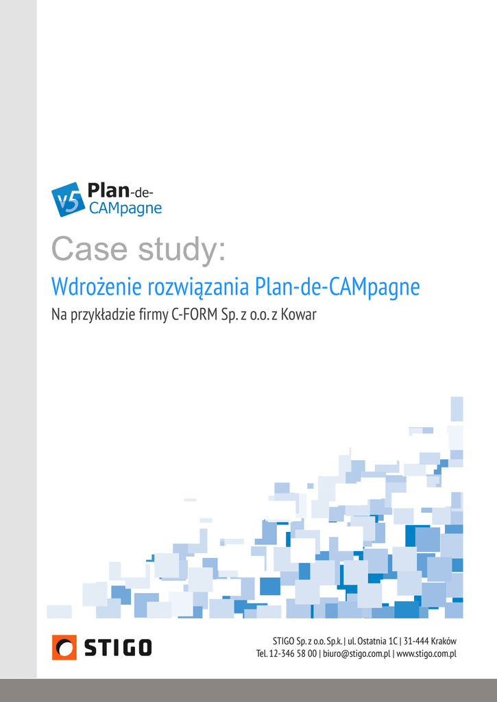 Case study: Wdrożenie rozwiązania Plan-de-CAMpagne Na przykładzie firmy C-FORM Sp. z o.o. z Kowar STIGO Sp. z o.o. Sp.k. | ul. Ostatnia 1C | 31-444 Kraków Tel. 12-346 58 00 | [email protected] | www.stigo.com.pl Case study: Wdrożenie rozwiązania Plan-de-CAMpagne Na przykładzie firmy C-FORM Sp. z o.o. z Kowar Firma C-FORM Sp. z o.o. powstała w roku 2006 i zajmuje się głównie produkcją form wtryskowych, ich regeneracją oraz przetwórstwem tworzyw sztucznych. C-FORM posiada precyzyjne maszyny i urządzenia numeryczne. Formy wykonywane są z najlepszych materiałów przez wysoko wykwalifikowanych pracowników z bogatym, wieloletnim doświadczeniem. O programie Plan-de-CAMpagne Rozmowa z panem Pawłem Cyganik - prezesem firmy C-FORM. Jakie warunki muszą być spełnione, aby firma mogła wdrożyć u siebie rozwiązanie Plan-de-CAMpagne? P.C.: System oferowany przez firmę STIGO dedykowany jest dla firm branży metalowej oraz przetwórstwa tworzyw sztucznych. Nie jest to jednak jedyny wyznacznik dla firmy, która chce takie rozwiązanie wdrożyć. Nasza firma poszukiwała przede wszystkim rozwiązania, które w łatwy sposób będziemy w stanie dostosować do naszych potrzeb. Często brak podstawowych informacji o uruchomionych zleceniach produkcyjnych, analizie kosztów rzeczywistych realizowanych projektów będzie wyznacznikiem skłaniającym firmy do poszukiwania odpowiedniego systemu komputerowego. Jak przedstawia się procedura wdrażania systemu Plande-CAMpagne w firmie? P.C.: Rozwiązanie Plan-de-CAMpagne w Naszej firmie wdrażała krakowska firma STIGO. Wspólny projekt rozpoczęliśmy od wstępnej analizy najistotniejszych dla nas aspektów, które według nas wymagały poprawy. W kolejnych tygodniach odbyły się dni instalacyjnokonsultacyjne, które pozwoliły na poprawną parametryzację systemu. Kluczowymi w trakcie całego procesu wdrożenia były celowane w odpowiednie działy firmy szkolenia z obsługi systemu. Finalnie, po okresie 4 miesięcy byliśmy gotowi do samodzielnej pracy w nowym środowisku. Konsultanci firmy STIGO nadal pozostają z nami w ścisłym kontakcie, co pozwala na jeszcze lepsze wykorzystywanie dalszych funkcjonalności systemu. Przykładowe produkty firmy C-FORM. 1 Jakie są zauważalne zalety systemu? P.C: System Plan-de-CAMpagne to przede wszystkim łatwość obsługi. Czytelny wygląd tabel, które możemy samodzielnie konfigurować, to funkcjonalność, która pozwala nam na szybsze odczytywanie kluczowych dla nas informacji. Zauważalny jest logiczny tok postępowania w sprawach związanych z przygotowaniem produkcji. W łatwy sposób odbywa się kalkulowanie nowych wyrobów oraz weryfikacja produkcji powtarzalnej. Prowadzenie gospodarki materiałowej ściśle powiązane jest z uruchomionymi zleceniami produkcyjnymi, co pozwala na ich szybką analizę kosztową. Dział jakości wspomaga się modułem pozwalającym na rejestrację reklamacji, zwrotów do dostawców oraz braków lub wad produkcyjnych powstałych na etapie kontroli międzystanowiskowej i końcowej. Każdy z tak zarejestrowanych raportów może być dodatkowo opracowany i przetworzony w systemie. Na tej podstawie śledzimy kompletny koszt naszych projektów, uwzględniając ewentualne reklamacje lub braki produkcyjne. Dziękujemy za rozmowę. Co zyskuje firma, która z powodzeniem wdrożyła system Plan-de-CAMpagne? P.C.: Dla osoby zarządzającej przedsiębiorstwem, obok powyższych zalet zauważalne są również konkretne, wymierne korzyści stosowania Plan-deCAMpagne. Dzięki bieżącej kontroli zdolności produkcyjnych obserwujemy poprawę efektywności produkcji. Poprzez zautomatyzowanie procesów logistycznych w systemie, zdecydowanie lepiej jesteśmy w stanie nadzorować zapasy w firmie. Plan-de-CAMpagne to przede wszystkim jedna baza danych dla wszystkich działów firmy. Dzięki temu całość obiegu informacji związanej z realizowanymi zamówieniami przechowywana jest w jednym systemie. Jakie ciekawe rozwiązania zastosowano w systemie Plan-de-CAMpagne? P.C.: Do najciekawszych zaliczyć należy automatyczną rejestrację czasów pracy. Na podstawie przygotowanych w systemie technologii drukowane są karty przewodnie do uruchomionych zleceń produkcyjnych. Informacja o realizacji kolejnych czynności trafia do systemu automatycznie na podstawie raportów generowanych przez dział produkcji. Przykładowe produkty firmy C-FORM. Interfejs programu Plan-de-CAMpagne. Podziękowania Wyrazy wdzięczności dla firmy C-FORM za możliwość przeprowadzenia wywiadu. Szczególne podziękowania kierujemy do Pana Pawła Cyganik - prezesa firmy C-FORM. Zespół STIGO Dzięki takiej funkcjonalności jesteśmy w stanie na bieżąco śledzić proces zaawansowania zamówień od klientów. 2