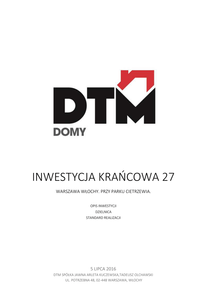INWESTYCJA KRAŃCOWA 27 WARSZAWA WŁOCHY. PRZY PARKU CIETRZEWIA. OPIS INWESTYCJI DZIELNICA STANDARD REALIZACJI 5 LIPCA 2016 DTM SPÓŁKA JAWNA ARLETA KUCZEWSKA,TADEUSZ OLCHAWSKI UL. POTRZEBNA 48, 02-448 WARSZAWA, WŁOCHY BUDUJEMY MARZENIA OPIS INWESTYCJI Inwestycja przy ulicy Krańcowej 27, na którą składają się dwa budynki typu bliźniak o łącznej powierzchni użytkowej ok 900m2 to propozycja idealna dla osób ceniących nowoczesne wzornictwo i design, a jednocześnie poszukujących wytchnienia od codziennego zgiełku miasta. Piaskowiec wykorzystany na elewacji budynków oraz zgodna z aktualnymi trendami kolorystyka dodają inwestycji charakteru i elegancji. Każdy spośród łącznie czterech segmentów mieszkalnych wyposażono w dwa tarasy – wyjście na pierwszy znajduje się na parterze, natomiast drugi zlokalizowany został na płaskim dachu. Teren otoczono bramą mieszkalną o wjeździe wspólnym dla obu budynków. Nasłonecznioną działkę porastają stare drzewa, a cała inwestycja znajduje się w sąsiedztwie niezwykle malowniczego Parku Cietrzewia, co jeszcze dodaje jej uroku. Niewątpliwy atut inwestycji – obok jej walorów architektonicznych i praktycznych – stanowi również lokalizacja – dzielnica o bogatej infrastrukturze, dogodnie skomunikowana z centrum stolicy. DZIELNICA STARE WŁOCHY Warszawskie Stare Włochy to osiedle łączące uroki miejsca znajdującego się w ścisłym otoczeniu przyrody z udogodnieniami i infrastrukturą charakterystycznymi dla dzielnic sąsiadujących z centrum miasta. Stanowiące elementarną część krajobrazu dzielnicy Park Cietrzewia i Stawy Cietrzewia nadają tej lokalizacji unikalnego charakteru, który szczególnie cenny może okazać się dla tych mieszkańców stolicy, którzy poszukują wyciszenia z dala od zgiełku miasta. Z drugiej strony jednak – Stare Włochy to także lokalizacja, która – obok sąsiedztwa zieleni – jest w stanie zaoferować swoim mieszkańcom dostęp do wszelkich niezbędnych usług, instytucji edukacyjnych, kulturalnych czy edukacyjnych. Infrastrukturę dzielnicy Stare Włochy tworzą m.in. liczne przedszkola, szkoły podstawowe i gimnazja, przychodnie i szpitale czy centra handlowe, sklepy i restauracje. Atut wspomnianej lokalizacji stanowi także jej skomunikowanie z pozostałymi częściami miasta. Idylliczne Stare Włochy od centrum stolicy dzieli zaledwie kilka minut drogi samochodem lub do kilkunastu, kiedy poruszamy się komunikacją miejską – w tym zakresie do dyspozycji mamy cztery linie autobusowe, a przystanek zlokalizowany jest w odległości około 200 m od osiedla. DTM Spółka Jawna Arleta Kuczewska, Tadeusz Olchawski, ul. Potrzebna 48, 02-448 Warszawa, Włochy tel/fax: +48 857402791, mobile: 602 405 242, e-mail: [email protected] BUDUJEMY MARZENIA OPIS STANDARDU REALIZACJI Inwestycja została zaprojektowana w technologii tradycyjnej murowanej. Jej wyjątkowym atutem są płaskie dachy ze słonecznym drewnianym tarasem, na którym z przyjemnością można będzie wypić poranną kawę. Nowoczesną bryłę budynku świetnie uzupełnia elewacja łącząca elementy naturalne takie jak płyty piaskowca oraz imitująca drewno płyta HPL z nowoczesnymi aluminiowymi oknami (z pakietem 3-szybowym) oraz balustradami z wypełnieniem ze szkła. Przyszli właściciele z pewnością docenią fakt, że w każdym segmencie przewidziany został garaż z dwoma stanowiskami. Cały teren posesji zostanie ogrodzony i oświetlony. Wykonamy drogę dojazdową wewnętrzną oraz zaaranżujemy zieleń. Wszystkie segmenty oferujemy w standardzie developerskim to znaczy wnętrza są otynkowane i pomalowane (w kolorze białym), bez okładzin ścian i podłóg. Segmenty będą wyposażone w pełne instalacje: CO z własną kotłownią gazową (ogrzewanie podłogowe + grzejniki), elektryczną (okablowanie + osprzęt) oraz wodno-kanalizacyjną. Dbając o komfort i bezpieczeństwo mieszkańców zainstalujemy również instalację alarmową opartą o czujniki ruchu i kontaktrony w oknach, wideo-domofony oraz orurowanie do klimatyzacji. DTM Spółka Jawna Arleta Kuczewska, Tadeusz Olchawski, ul. Potrzebna 48, 02-448 Warszawa, Włochy tel/fax: +48 857402791, mobile: 602 405 242, e-mail: [email protected]