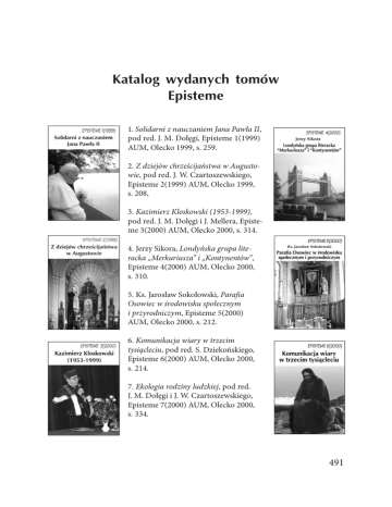 Katalog wydanych tomów Episteme 1. Solidarni z nauczaniem Jana Pawła II, pod red. J. M. Dołęgi, Episteme 1(1999) AUM, Olecko 1999, s. 259. 2. Z dziejów chrześcijaństwa w Augustowie, pod red. J. W. Czartoszewskiego, Episteme 2(1999) AUM, Olecko 1999, s. 208, 3. Kazimierz Kloskowski (1953-1999), pod red. J. M. Dołęgi i J. Mellera, Episte me 3(2000) AUM, Olecko 2000, s. 314. 4. Jerzy Sikora, Londyńska grupa literacka „Merkuriusza” i „Kontynentów”, Episteme 4(2000) AUM, Olecko 2000, s. 310. 5. Ks. Jarosław Sokołowski, Parafia Osowiec w środowisku społecznym i przyrodniczym, Episteme 5(2000) AUM, Olecko 2000, s. 212. 6. Komunikacja wiary w trzecim tysiącleciu, pod red. S. Dziekońskiego, Episteme 6(2000) AUM, Olecko 2000, s. 214. 7. Ekologia rodziny ludzkiej, pod red. J. M. Dołęgi i J. W. Czartoszewskiego, Episteme 7(2000) AUM, Olecko 2000, s. 334. 491 Katalog wydanych tomów EPISTEME 8. Rodzina w nauce i kulturze, pod red. J. M. Dołęgi i J. W. Czartoszewskiego, Episteme 8(2000) AUM, Olecko 2000, s. 343. 9. Edukacja ekologiczna w rodzinie, pod red. J. M. Dołęgi i J. W. Czartoszew skiego, Episteme 9(2000), AUM, Olecko 2000, s. 336. 10. Ks. Jerzy Szorc, Wolność i posłuszeństwo, Episteme 10(2000) AUM, Olecko 2000, s. 263. 11. Kazimierz Kloskowski Zasady – edukacja – testament, pod red. J. Krajewskiego i J. Sokołowskiego, Episteme 11(2001) AUM, Olecko 2001, s. 228. 12. Wielki Jubileusz Chrześcijaństwa 2000, cz. I, pod red. J. M. Dołęgi, J. Sokołowskiego, S. Śledziewskiego, Episteme 12(2001) AUM, Olecko 2001, s. 314. 13. Wielki Jubileusz Chrześcijaństwa 2000, cz. II, pod red. J. M. Dołęgi, J. Sokołowskiego, S. Śledziewskiego, Episteme 13(2001) AUM, Olecko 2001, s. 314. 14. Marian Piotr Krysiak, Średnie szkoły ogólnokształcące w Kolnie (1918-2000), Episteme 14(2001) AUM, Olecko 2001, s. 362. 15. Prymas Tysiąclecia Kardynał Stefan Wyszyński, cz. I: Prymas Tysiąclecia a rodzina polska, pod. red. J. M. Dołęgi i J. W. Czartoszewskiego, Episteme 15(2001) AUM, Olecko 2001, s. 304. 492 Katalog wydanych tomów EPISTEME 16. Prymas Tysiąclecia Kardynał Stefan Wyszyński, cz. II: Prymas Tysiąclecia w pa mięci regionu, pod red. J. M. Dołęgi i J. W. Czartoszewskiego, Episteme 16(2001) AUM, Olecko 2001, s. 288. 17. Meandry etyki, pod red. Z. Sareły, Episteme 17(2001) AUM, Olecko 2001, s. 272. 18. Dziesięć lat Wszechnicy Mazurskiej w Olecku, pod red.: J. Krajewskiego i J. Sokołowskiego, Episteme 18(2001) AUM, Olecko 2001, s. 232. 19. Ks. Antoni Boszko (1942-2001), pod red. J. M. Dołęgi, J. Harasima, S. Łupińskiego i J. Sokołowskiego, Episteme 19(2002) AUM, Olecko 2002, s. 302. 20. Teologia duchowości, pod red. J. M. Dołęgi, Episteme 20(2002) AUM, Olecko 2002, s. 260. 21. Ziemia kolneńska na przełomie XX i XXI wieku, pod red. ks. J. L. Grajewskiego, ks. J. Sokołowskiego, Episteme 21(2002) AUM, Olecko 2002, s. 348. 22. Od kosmologii do ekofilozofii, pod red. J. M. Dołęgi, Episteme 22(2002) AUM, Olecko 2002, s. 332. 23. Ks. Józef Łupiński, Dzieje grekokatolików w Królestwie Polskim po powstaniu styczniowym, Episteme 23(2002) AUM, Olecko 2002, s. 258. 24. Jarosław Poteraj, Polskie instytucje finansowe. Kreacja rynków i procesy 493 Katalog wydanych tomów EPISTEME konsolidacyjne, Episteme 24(2002) AUM, Olecko 2002, s. 288. 25. Unia Europejska. Geneza – rozwój – perspektywy, pod red. J. M. Dołęgi, Episteme 25(2002) AUM, Olecko 2002, s. 496. 26. Współczesne dylematy diagnostyczne i metodyczne w opiece i wychowaniu, pod red. J. Nikitorowicza, K. Sawickiego, T. Bajkowskiego, Episteme 26(2003) AUM, Olecko 2003, s. 278. 27. Biskup Edward Eugeniusz Samsel (1940-2003), pod red. J. M. Dołęgi i A. Skowrońskiego, Episteme 27(2003) AUM, Olecko 2003, s. 384. 28. Kardynał Marian Jaworski, Wybór pism filozoficznych, Episteme 28(2003) AUM, Olecko 2003, s. 333. 29. Konteksty podmiotowej świadomości, pod red. E. Podrez i R. Monia, Episteme 29(2003) AUM, Olecko 2003, s. 230. 30. Ochrona œrodowiska i edukacja ekologiczna w Unii Europejskiej i Polsce, pod red. Z. Ciećki i J. M. Dołęgi, Episteme 30(2003) AUM, Olecko 2003, s. 244. 31. Pedagogika – wczoraj, dziś i jutro, pod red. J. Plachy i J. K. Zabłockiego, Episteme 31(2003) AUM, Olecko 2003, s. 210. 494 Katalog wydanych tomów EPISTEME 32. Mieczysław Markowski, Pierwowzory uniwersytetów, Episteme 32(2003) AUM, Olecko 2003, s. 406. 33. Biskup Ełcki Edward Eugeniusz Sam sel, pod red. J. M. Dołęgi, A. Skowrońskiego i J. Sokołowskiego, Episteme 33(2003) AUM, Olecko 2003, s. 402. 34. Ks. Janusz Aptacy, Antropologia Oliviera Clémenta, 34(2004) AUM, Olecko 2004, s. 245. 35. 25 lat Pontyfikatu Jana Pawła II, pod. red. ks. Jerzego Sikory, Episteme 35(2004) AUM, Olecko 2004, s. 432. 36. Ziemia olecka na początku XXI wie ku, pod. red. Józefa Krajewskiego i Woj ciecha Guzewicza, Episteme 36(2004) AUM, Olecko 2004, s. 364. 37. Jarosław Poteraj, Procesy konsolida cyjne. Raiders & Targets w polskich insty tucjach finansowych, Episteme 37(2004) AUM, Olecko 2004, s. 800. 38. Kultura religijna Kurpiowszczyzny, pod. red. ks. Mieczysława Ozorowskiego, Episteme 38(2004) AUM, Olecko 2004, s. 212. 39. Ks. Krzysztof Stępniak, W poszukiwaniu Kościoła idealnego. Życie i dzieło Tadeusza Żychiewicza (1922-1994), Episteme 39(2004) AUM, Olecko 2004, s. 280. 495 Katalog wydanych tomów EPISTEME 40. Mieczysław Markowski, Uniwersytet Krakowski w kontekście środkowoeuro pejskim późnego średniowiecza i wczesnej nowożytności, Episteme 40(2005) AUM, Olecko 2005. 41. W słubie Bogu i ludziom. Ks. Czesław Jakub Domel (1932-2004), pod. red. ks. Wojciecha Guzewicza, Episteme 41(2005) AUM, Olecko 2005, s. 192. 42. Ochrona środowiska i edukacja ekologiczna w regionie: Gmina Turośl i Wigierski Park Narodowy, pod. red. Józefa M. Dołgi, Edwarda Grotta i Mariana P. Krysiaka, Episteme 42(2005) AUM, Olecko 2005, s. 254. 43. Waldemar Świątkowski, Das Beziehungsgefüge von Sünde und Schuld