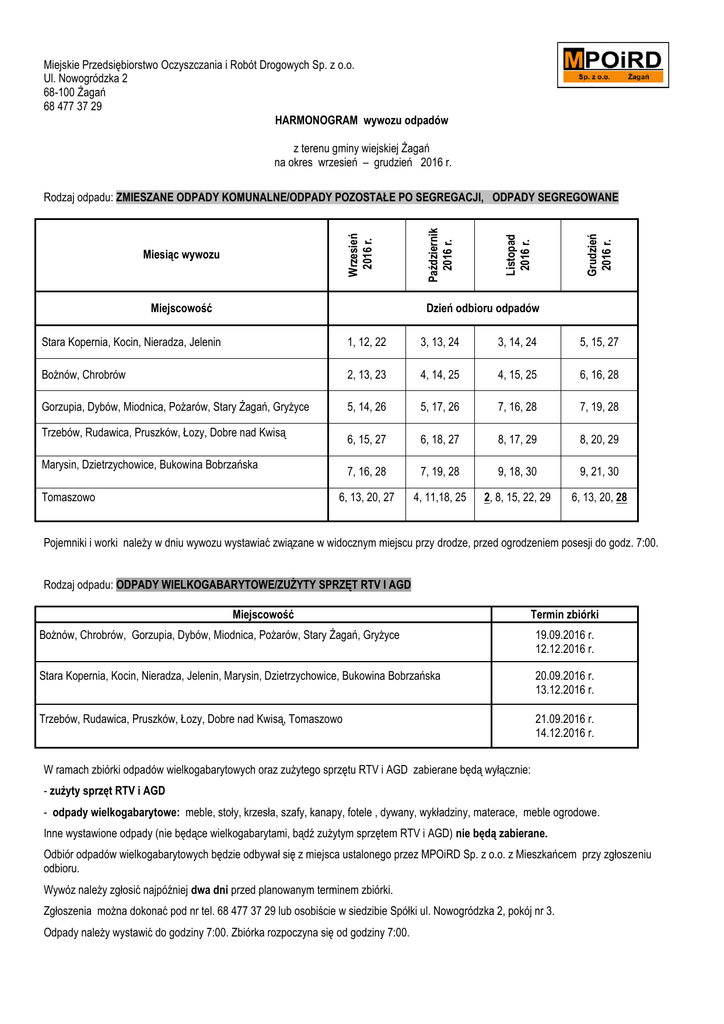 Miejskie Przedsiębiorstwo Oczyszczania i Robót Drogowych Sp. z o.o. Ul. Nowogródzka 2 68-100 Żagań 68 477 37 29 HARMONOGRAM wywozu odpadów z terenu gminy wiejskiej Żagań na okres wrzesień – grudzień 2016 r. Miejscowość Grudzień 2016 r. Listopad 2016 r. Miesiąc wywozu Październik 2016 r. Wrzesień 2016 r. Rodzaj odpadu: ZMIESZANE ODPADY KOMUNALNE/ODPADY POZOSTAŁE PO SEGREGACJI, ODPADY SEGREGOWANE Dzień odbioru odpadów Stara Kopernia, Kocin, Nieradza, Jelenin 1, 12, 22 3, 13, 24 3, 14, 24 5, 15, 27 Bożnów, Chrobrów 2, 13, 23 4, 14, 25 4, 15, 25 6, 16, 28 Gorzupia, Dybów, Miodnica, Pożarów, Stary Żagań, Gryżyce 5, 14, 26 5, 17, 26 7, 16, 28 7, 19, 28 6, 15, 27 6, 18, 27 8, 17, 29 8, 20, 29 7, 16, 28 7, 19, 28 9, 18, 30 9, 21, 30 6, 13, 20, 27 4, 11,18, 25 2, 8, 15, 22, 29 6, 13, 20, 28 Trzebów, Rudawica, Pruszków, Łozy, Dobre nad Kwisą Marysin, Dzietrzychowice, Bukowina Bobrzańska Tomaszowo Pojemniki i worki należy w dniu wywozu wystawiać związane w widocznym miejscu przy drodze, przed ogrodzeniem posesji do godz. 7:00. Rodzaj odpadu: ODPADY WIELKOGABARYTOWE/ZUŻYTY SPRZĘT RTV I AGD Miejscowość Termin zbiórki Bożnów, Chrobrów, Gorzupia, Dybów, Miodnica, Pożarów, Stary Żagań, Gryżyce 19.09.2016 r. 12.12.2016 r. Stara Kopernia, Kocin, Nieradza, Jelenin, Marysin, Dzietrzychowice, Bukowina Bobrzańska 20.09.2016 r. 13.12.2016 r. Trzebów, Rudawica, Pruszków, Łozy, Dobre nad Kwisą, Tomaszowo 21.09.2016 r. 14.12.2016 r. W ramach zbiórki odpadów wielkogabarytowych oraz zużytego sprzętu RTV i AGD zabierane będą wyłącznie: - zużyty sprzęt RTV i AGD - odpady wielkogabarytowe: meble, stoły, krzesła, szafy, kanapy, fotele , dywany, wykładziny, materace, meble ogrodowe. Inne wystawione odpady (nie będące wielkogabarytami, bądź zużytym sprzętem RTV i AGD) nie będą zabierane. Odbiór odpadów wielkogabarytowych będzie odbywał się z miejsca ustalonego przez MPOiRD Sp. z o.o. z Mieszkańcem przy zgłoszeniu odbioru. Wywóz należy zgłosić najpóźniej dwa dni przed planowanym terminem zbiórki. Zgłoszenia można dokonać pod nr tel. 68 477 37 29 lub osobiście w siedzibie Spółki ul. Nowogródzka 2, pokój nr 3. Odpady należy wystawić do godziny 7:00. Zbiórka rozpoczyna się od godziny 7:00.