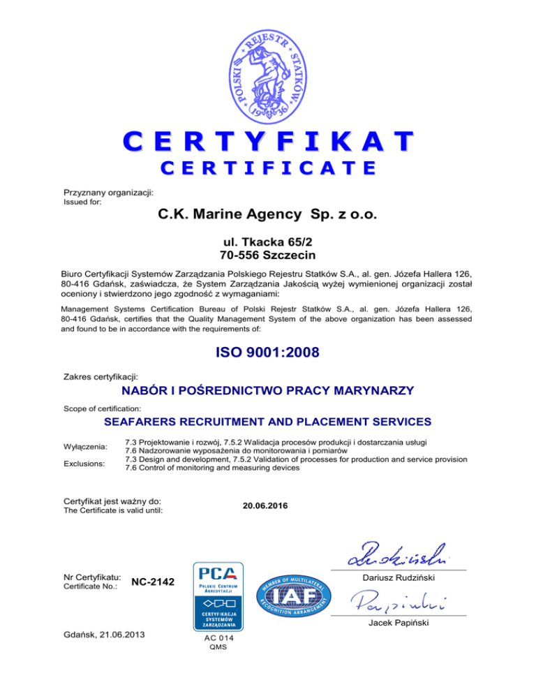 CERTYFIKAT CERTIFICATE Przyznany organizacji: Issued for: C.K. Marine Agency Sp. z o.o. ul. Tkacka 65/2 70-556 Szczecin Biuro Certyfikacji Systemów Zarządzania Polskiego Rejestru Statków S.A., al. gen. Józefa Hallera 126, 80-416 Gdańsk, zaświadcza, że System Zarządzania Jakością wyżej wymienionej organizacji został oceniony i stwierdzono jego zgodność z wymaganiami: Management Systems Certification Bureau of Polski Rejestr Statków S.A., al. gen. Józefa Hallera 126, 80-416 Gdańsk, certifies that the Quality Management System of the above organization has been assessed and found to be in accordance with the requirements of: ISO 9001:2008 Zakres certyfikacji: NABÓR I POŚREDNICTWO PRACY MARYNARZY Scope of certification: SEAFARERS RECRUITMENT AND PLACEMENT SERVICES Wyłączenia: Exclusions: 7.3 Projektowanie i rozwój, 7.5.2 Walidacja procesów produkcji i dostarczania usługi 7.6 Nadzorowanie wyposażenia do monitorowania i pomiarów 7.3 Design and development, 7.5.2 Validation of processes for production and service provision 7.6 Control of monitoring and measuring devices Certyfikat jest ważny do: 20.06.2016 The Certificate is valid until: Nr Certyfikatu: Certificate No.: Dariusz Rudziński NC-2142 Jacek Papiński Gdańsk, 21.06.2013 QMS