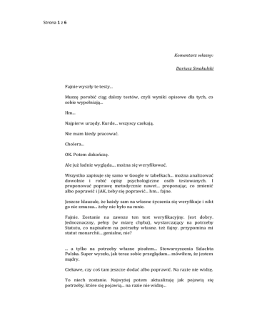 Strona 1 z 6 Komentarz własny: Dariusz Smakulski Fajnie wyszły te testy... Muszę porobić ciąg dalszy testów, czyli wyniki opisowe dla tych, co sobie wypełniają... Hm... Najpierw urzędy. Kurde... wszyscy czekają. Nie mam kiedy pracować. Cholera... OK. Potem dokończę. Ale już ładnie wygląda.... można się weryfikować. Wszystko zapisuje się samo w Google w tabelkach... można analizować dowolnie i robić opisy psychologiczne osób testowanych. I proponować poprawę metodycznie nawet... proponując, co zmienić albo poprawić i JAK, żeby się poprawić... hm... fajne. Jeszcze klauzule, że każdy sam na własne życzenia się weryfikuje i nikt go nie zmusza... żeby nie było na mnie. Fajnie. Zostanie na zawsze ten test weryfikacyjny. Jest dobry. Jednoznaczny, pełny (w miarę chyba), wystarczający na potrzeby Statutu, co napisałem na potrzeby własne. też fajny. przypomina mi statut monarchii... genialne, nie? ... a tylko na potrzeby własne pisałem... Stowarzyszenia Szlachta Polska. Super wyszło, jak teraz sobie przeglądam... mówiłem, że jestem mądry. Ciekawe, czy coś tam jeszcze dodać albo poprawić. Na razie nie widzę. To niech zostanie. Najwyżej potem aktualizuję jak pojawią się potrzeby, które się pojawią... na razie nie widzę... Strona 2 z 6 Hm... OK. To muszę zdążyć na Czerniakowską w tym tygodniu... żeby móc pracować legalnie w stowarzyszeniu. Ciekawe, czy można założyć jednoosobowo... bo ja nie chcę być spółką 5-osobową... jestem jeden przecież. jakoś to wymyślę... wait. Chyba wszystko ładnie wyszło... nie jest głupie... ładnie wydrukowane wygląda... podoba mi się. Te testy najwyżej z czasem uzupełnię, jak pojawią się osoby złe szkodnikowe, których nie blokuje weryfikacyjnie automatycznie weryfikacja wg Art. VIII Statutu Stow. 'SP' z dn. 11.01.2014 r. Hm... zobaczymy z czasem. na razie chyba weryfikacja zgodnie z Art. VIII.1 i VIII.2. i VIII.3. jest wystarczająca... żeby zamknąć furtki szkodnikom, i żeby nie przeleźli... byłoby niedobrze przyjmować do Raju szkodniki... oczywiste. OK. Na razie wystarcza. Zobaczę z czasem. DS`.PL.EU.FEB.26.2014T14:29CET. ====. Serwis Sąd Prokuratura Smaku Books (c) 2010 r. Dariusz Smakulski Psychologia – Psychoterapia – Algorytmy Sądowe sadprok.smakubooks.com Wysokiej jakości produkty i usługi, wszystkie informacje o firmie i możliwościach zakupu. Wyszła chyba monarchia ponadnarodowa - globalna - światowa... a nawet wszechświatowa... a w dodatku w dowolnym świecie istniejącym lub nie, ale podobnym do świata, w którym żyjemy na Ziemi... jak zastosuje się weryfikację wg Art. VIII Statutu Strona 3 z 6 Stowarzyszenia Szlachta Polska z dn. 11.01.2014 r. to odsiewa się wszystkie robaki i szkodniki na spalenie na OUT... brama zamknięta do Raju... dla robaków i zarazy... a w Stowarzyszeniu są zasady podobne do Monarchii... gdzie każdy jest WOLNY i nikt do nikogo nic nie ma... można sobie żyć jak kto lubi i ma ochotę... jak w Raju... no bo jak ktoś już dostanie się do Stowarzyszenia Szlachta Polska, to musi być istotą dobrą nie szkodnikową, czyli OK - sama wie, co dobre a co złe i żyje SOBIE... z innymi... i jest dobra, myśląca i to wystarcza... no to super. To mam najlepsze Stowarzyszenie we Wszechświecie w takim razie... cieszę się. OK. Idę na kawę... lubię to. Fajnie mi wyszło... jak Brama do RAJU... gdzie wszyscy są szczęśliwi i bezpieczni i pomagają sobie, jak widać, że ktoś potrzebuje pomocy... każdy zajmuje się sobą żyjąc sobie jak lubi, nikt nikogo nie męczy... każdy ma wolne... hm.. fajny Świat... podoba mi się. Chciałbym mieszkać w Raju... hm... ok. To zbudowałem RAJ... i BRAMY... tylko żeby były szczelne - to, co pisałem wyżej... żeby żaden robak się nie dostał... bo nie daj Boże znowu zagłada... jak kiedyś w Raju... tym ze Starego testamentu... no nie daj Boże... kurde... znowu byłoby cierpienie... jak przez tysiące lat ostatnich... to byłoby bez sensu... hm... wystarczy poczytać Historię Powszechną... same tragedie... trzeba Pilnować Bram... fajnie bdżmi... ... tak duchowo... religijnie prawie że... .... OK. najwyżej się poprawi weryfikację, jak będzie trzeba... Art. VIII czyli - w 3-ech punktach... OK. na razie jest super. Podoba mi się. Statut Stowarzyszenia Szlachta Polska - Szlachta Polska Smaku Books (c) 2010 r. Dariusz Smakulski szlachtapolska.org Szlachta Polska. Europa. Rzeczpospolita. Książka. Historia. Tradycja. Świat. Ziemia. Kosmos. Galaktyka. Universum. Bóg. Jeszcze trzeba przełożyć na języki narodowe. Też Google się przyda. Mają świetny Translator... najwyżej w ostatecznej wersji przejrzy jakiś filolog z każdego języka i już... super. NO to GOTOWE. Idę... kawa... fajne... [..] DS`.PL.EU.FEB.26.2014T14:38CET. Strona 4 z 6 [..] Hm... no i w sumie takie Stowarzyszenie z członkami i miejscem, w którym żyją TYLKO członkowie stowarzyszenia, jak w Kraju bezpiecznym i zamkniętym granicami jak Raj murem z bramami, których pilnuje VIII Art. Statutu Stowarzyszenia z dn. 11.01.2014 r. przypomina chyba legendarną Atlantydę, o której pisał Pan Platon w swoich Dialogach w starożytnej Grecji... i może inni... nie wiem... nie sprawdzałem tego... tylko od Pana Platona się dowiedziałem... z jego książek... ale Atlantyda chyba była właśnie takim miejscem, gdzie mieszkali i żyli mądrzy ludzie, z zaawansowaną techniką i wiedzą i nauką i wszystko na poziomie maks cywilizacja kosmiczna może nawet... a żyli sobie zwyczajnie, jak zwyczajni ludzie, jak w dzisiejszych czasach - XXI w. czyli zwyczajnie... że fajnie jest sobie żyć... jest pełno fajnych rzeczy na Świecie... np. kawa... gry, zabawy, komputery, filmy, książki, wakacje, podróże, hotele, sklepy, supermarkety, wszystko jest super... no i fajne to wszystko... mnie się podoba... lubię to. I nikt nie jest zły... nikt nie robi przestępstw, nie szkodzi, nie męczą się j