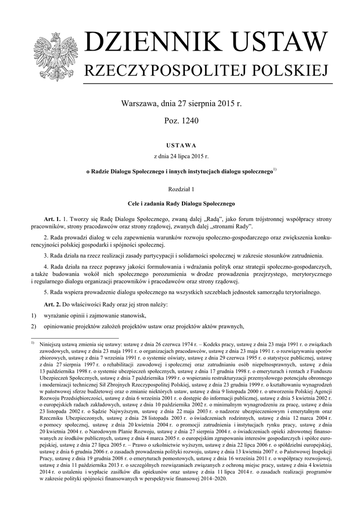 DZIENNIK USTAW RZECZYPOSPOLITEJ POLSKIEJ Warszawa, dnia 27 sierpnia 2015 r. Poz. 1240 US T AW A z dnia 24 lipca 2015 r. o Radzie Dialogu Społecznego i innych instytucjach dialogu społecznego1) Rozdział 1 Cele i zadania Rady Dialogu Społecznego Art. 1. 1. Tworzy się Radę Dialogu Społecznego, zwaną dalej „Radą”, jako forum trójstronnej współpracy strony pracowników, strony pracodawców oraz strony rządowej, zwanych dalej „stronami Rady”. 2. Rada prowadzi dialog w celu zapewnienia warunków rozwoju społeczno-gospodarczego oraz zwiększenia konkurencyjności polskiej gospodarki i spójności społecznej. 3. Rada działa na rzecz realizacji zasady partycypacji i solidarności społecznej w zakresie stosunków zatrudnienia. 4. Rada działa na rzecz poprawy jakości formułowania i wdrażania polityk oraz strategii społeczno-gospodarczych, a także budowania wokół nich społecznego porozumienia w drodze prowadzenia przejrzystego, merytorycznego i regularnego dialogu organizacji pracowników i pracodawców oraz strony rządowej. 5. Rada wspiera prowadzenie dialogu społecznego na wszystkich szczeblach jednostek samorządu terytorialnego. Art. 2. Do właściwości Rady oraz jej stron należy: 1) wyrażanie opinii i zajmowanie stanowisk, 2) opiniowanie projektów założeń projektów ustaw oraz projektów aktów prawnych, 1) Niniejszą ustawą zmienia się ustawy: ustawę z dnia 26 czerwca 1974 r. – Kodeks pracy, ustawę z dnia 23 maja 1991 r. o związkach zawodowych, ustawę z dnia 23 maja 1991 r. o organizacjach pracodawców, ustawę z dnia 23 maja 1991 r. o rozwiązywaniu sporów zbiorowych, ustawę z dnia 7 września 1991 r. o systemie oświaty, ustawę z dnia 29 czerwca 1995 r. o statystyce publicznej, ustawę z dnia 27 sierpnia 1997 r. o rehabilitacji zawodowej i społecznej oraz zatrudnianiu osób niepełnosprawnych, ustawę z dnia 13 października 1998 r. o systemie ubezpieczeń społecznych, ustawę z dnia 17 grudnia 1998 r. o emeryturach i rentach z Funduszu Ubezpieczeń Społecznych, ustawę z dnia 7 października 1999 r. o wspieraniu restrukturyzacji przemysłowego potencjału obronnego i modernizacji technicznej Sił Zbrojnych Rzeczypospolitej Polskiej, ustawę z dnia 23 grudnia 1999 r. o kształtowaniu wynagrodzeń w państwowej sferze budżetowej oraz o zmianie niektórych ustaw, ustawę z dnia 9 listopada 2000 r. o utworzeniu Polskiej Agencji Rozwoju Przedsiębiorczości, ustawę z dnia 6 września 2001 r. o dostępie do informacji publicznej, ustawę z dnia 5 kwietnia 2002 r. o europejskich radach zakładowych, ustawę z dnia 10 października 2002 r. o minimalnym wynagrodzeniu za pracę, ustawę z dnia 23 listopada 2002 r. o Sądzie Najwyższym, ustawę z dnia 22 maja 2003 r. o nadzorze ubezpieczeniowym i emerytalnym oraz Rzeczniku Ubezpieczonych, ustawę z dnia 28 listopada 2003 r. o świadczeniach rodzinnych, ustawę z dnia 12 marca 2004 r. o pomocy społecznej, ustawę z dnia 20 kwietnia 2004 r. o promocji zatrudnienia i instytucjach rynku pracy, ustawę z dnia 20 kwietnia 2004 r. o Narodowym Planie Rozwoju, ustawę z dnia 27 sierpnia 2004 r. o świadczeniach opieki zdrowotnej finansowanych ze środków publicznych, ustawę z dnia 4 marca 2005 r. o europejskim zgrupowaniu interesów gospodarczych i spółce europejskiej, ustawę z dnia 27 lipca 2005 r. – Prawo o szkolnictwie wyższym, ustawę z dnia 22 lipca 2006 r. o spółdzielni europejskiej, ustawę z dnia 6 grudnia 2006 r. o zasadach prowadzenia polityki rozwoju, ustawę z dnia 13 kwietnia 2007 r. o Państwowej Inspekcji Pracy, ustawę z dnia 19 grudnia 2008 r. o emeryturach pomostowych, ustawę z dnia 16 września 2011 r. o współpracy rozwojowej, ustawę z dnia 11 października 2013 r. o szczególnych rozwiązaniach związanych z ochroną miejsc pracy, ustawę z dnia 4 kwietnia 2014 r. o ustaleniu i wypłacie zasiłków dla opiekunów oraz ustawę z dnia 11 lipca 2014 r. o zasadach realizacji programów w zakresie polityki spójności finansowanych w perspektywie finansowej 2014–2020. Dziennik Ustaw –2– 3) inicjowanie na zasadach określonych niniejszą ustawą procesu legislacyjnego, 4) wykonywanie innych zadań wynikających z odrębnych ustaw Poz. 1240 – w sprawach, o których mowa w art. 1. Rozdział 2 Uprawnienia Rady Dialogu Społecznego i jej stron Art. 3. 1. Strony Rady mogą zawierać porozumienia i zajmować wspólne stanowiska. 2. Przedmiotem porozumień stron Rady są wzajemne zobowiązania stron służące realizacji celów Rady, o których mowa w art. 1 ust. 2–4. 3. Porozumienia określają w szczególności: 1) czas obowiązywania; 2) tryb dokonywania zmian treści; 3) tryb rozwiązania; 4) przypadki wygaśnięcia; 5) tryb rozstrzygania kwestii spornych. Art. 4. 1. Każdej ze stron Rady przysługuje prawo wniesienia pod obrady Rady sprawy o dużym znaczeniu społecznym lub gospodarczym, jeżeli uzna, że jej rozwiązanie jest istotne dla zachowania pokoju społecznego, rozwoju społeczno-gospodarczego i wzrostu dobrobytu, zwiększenia konkurencyjności polskiej gospodarki oraz spójności społecznej. 2. Każda ze stron Rady, również wspólnie z inną stroną Rady, może zająć stanowisko w każdej sprawie dotyczącej polityki społecznej lub gospodarczej. 3. Każda ze stron Rady może wezwać inną stronę Rady do zajęcia stanowiska w sprawie, którą uzna za mającą duże znaczenie społeczne lub gospodarcze. 4. W sprawie wniesionej pod obrady Rady w trybie, o którym mowa w ust. 1, Rada podejmuje uchwałę. 5. Rada może, w drodze uchwały, przekazać sprawę, o której mowa w ust. 1, do rozpatrzenia przez zespół, o którym mowa w art. 34, jednocześnie wskazując termin do zajęcia stanowiska. 6. Jeżeli w terminie, o którym mowa w ust. 5, zespół przedstawi swoje stanowisko w sprawie, o której mowa w ust. 1, Rada podejmuje uchwałę w oparciu o to stanowisko na pierwszym posiedzeniu następującym po jego upływie. 7. Jeżeli w terminie, o którym mo