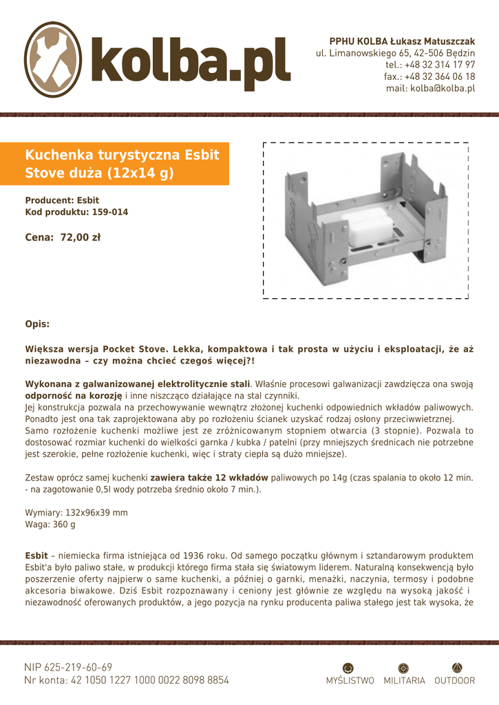 Kuchenka turystyczna Esbit Stove duża (12x14 g) Producent: Esbit Kod produktu: 159-014 Cena: 72,00 zł Opis: Większa wersja Pocket Stove. Lekka, kompaktowa i tak prosta w użyciu i eksploatacji, że aż niezawodna – czy można chcieć czegoś więcej?! Wykonana z galwanizowanej elektrolitycznie stali. Właśnie procesowi galwanizacji zawdzięcza ona swoją odporność na korozję i inne niszcząco działające na stal czynniki. Jej konstrukcja pozwala na przechowywanie wewnątrz złożonej kuchenki odpowiednich wkładów paliwowych. Ponadto jest ona tak zaprojektowana aby po rozłożeniu ścianek uzyskać rodzaj osłony przeciwwietrznej. Samo rozłożenie kuchenki możliwe jest ze zróżnicowanym stopniem otwarcia (3 stopnie). Pozwala to dostosować rozmiar kuchenki do wielkości garnka / kubka / patelni (przy mniejszych średnicach nie potrzebne jest szerokie, pełne rozłożenie kuchenki, więc i straty ciepła są dużo mniejsze). Zestaw oprócz samej kuchenki zawiera także 12 wkładów paliwowych po 14g (czas spalania to około 12 min. - na zagotowanie 0,5l wody potrzeba średnio około 7 min.). Wymiary: 132x96x39 mm Waga: 360 g Esbit – niemiecka firma istniejąca od 1936 roku. Od samego początku głównym i sztandarowym produktem Esbit'a było paliwo stałe, w produkcji którego firma stała się światowym liderem. Naturalną konsekwencją było poszerzenie oferty najpierw o same kuchenki, a później o garnki, menażki, naczynia, termosy i podobne akcesoria biwakowe. Dziś Esbit rozpoznawany i ceniony jest głównie ze względu na wysoką jakość i niezawodność oferowanych produktów, a jego pozycja na rynku producenta paliwa stałego jest tak wysoka, że często określa się je mianem „paliwa Esbit”. Z oferty firmy korzystają jednostki wojskowe, służby ratownicze, międzynarodowe organizacje niosące pomoc w krajach trzeciego świata, a także „zwykli” turyści, wspinacze i entuzjaści outdoor'u. Gwarancja 24 miesiące
