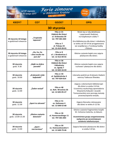 KIEDY? CO? GDZIE? OPIS 30 stycznia 30 stycznia-10 lutego w godzinach otwarcia „Tropiciele tajemnic” Filia nr 21 Oddział dla Dzieci ul. Królewska 59 tel. 797-301-020 Filia nr 7 al. Pokoju 33 tel. 12-414-26-01 Wciel się w rolę detektywa i poprowadź śledztwo na książkowym szlaku"! Gra biblioteczna dla dzieci i młodzieży w wieku od 10-14 lat przygotowana we współpracy z Fundacją Szablą i Piórem. „Hu, hu, ha - zima wcale nie jest zła” Filia nr 8 ul. J. Brodowicza 1 tel. 12 412-49-55 Głośne czytanie bajek oraz zajęcia plastyczne dla dzieci. 30 stycznia godz. 9.30 „Bajki na dobre poranki” Filia nr 56 Oddział dla Dzieci i Młodzieży os. Zgody 7 tel. 12 642-16-43 Głośne czytanie bajek oraz zajęcia ruchowe i plastyczne dla dzieci. 30 stycznia godz. 10.00 „Krakowski szlak bajkoteki” Filia nr 44 ul. Spółdzielców 3 tel. 797-024-014 Literacka podróż po Krakowie śladami wierszy Tadeusza Śliwiaka. Filia nr 48 os. Boh. Września 26 tel. 12 645-95-27 Zajęcia z elementami biblioterapii dla dzieci w wieku 5-8 lat. Uczestnicy wysłuchają opowiadania Wojciecha Kołyszki i Jovanki Tomaszewskiej oraz poznają metody przezwyciężania wstydu. Filia nr 51 os. Kalinowe 4 tel. 12 648-52-68 Zajęcia literacko-rekreacyjne dla dzieci w wieku 6-12 lat. 30 stycznia-10 lutego w godzinach otwarcia 30 stycznia godz. 12.00 30 stycznia godz. 12.30 „Żaden wstyd” „Sport to zdrowie” 30 stycznia godz. 13.00-13.30 „Głośne czytanie dzieciom” Filia nr 26 ul. Komorowskiego 11 tel. 797-301-003 30 stycznia godz. 13.00 „Sport narciarstwo” Filia nr 50 os. Kościuszkowskie 5 tel. 12 648-79-46 Głośne czytanie fragmentów książki W. Cichonia Cukierku, ty łobuzie. Uczestnictwo grupy zorganizowanej wyłącznie po wcześniejszym ustaleniu telefonicznym. Zajęcia literacko-plastyczne dla dzieci w wieku 5-8 lat. 30 stycznia godz. 14.00 „Historia karnawałowej maski” Filia nr 5 ul. Lubomirskiego 7a tel. 12 430-37-39 Warsztaty edukacyjno-plastyczne dla dzieci. 31 stycznia 31 stycznia-12 lutego Konkurs plastyczny „Zimowe impresje” 31 stycznia-12 lutego w godzinach otwarcia „Kącik Malucha” 31 stycznia-12 lutego w godzinach otwarcia „Kącik Małego Czytelnika” 31 stycznia-12 lutego w godzinach otwarcia „Zima w mieście” Filia nr 28 ul. Komandosów 1 tel. 797-024-003 Tematem przewodnim konkursu są uroki zimy. Prace można wykonywać dowolną techniką. Filia nr 31 ul. Zachodnia 7/3a tel. 797-024-021 W „Kąciku Malucha”, na najmłodszych czytelników czekają gry, zabawki i kolorowanki. Filia nr 34 ul. Borsucza 12 tel. 797-024-020 W „Kąciku Małego Czytelnika”, na dzieci czekają gry planszowe, rebusy, zagadki i zabawy plastyczne. Filia nr 40 ul. Łużycka 55 tel. 797-024-017 W bibliotece można korzystać z trzech stanowisk komputerowych, szachów, puzzli i czasopism. 31 stycznia-12 lutego w godzinach otwarcia „Kącik gier” Filia nr 41 ul. Gołaśka 13/1 tel. 797-024-022 31 stycznia-12 lutego w godzinach otwarcia „Biblioteka lekarstwem na nudę” Filia nr 42 ul. Telimeny 9 tel. 797-024-001 Gry planszowe, puzzle i kolorowanki w bibliotece. 31 stycznia-12 lutego w godzinach otwarcia „Kącik rozrywki” Filia nr 46 św. Św. Kingi 8 tel. 797-024-011 W „Kąciku rozrywki” dzieci znajdą gry planszowe, puzzle i krzyżówki. 31 stycznia w godzinach otwarcia „Czytajmy razem!” Filia nr 41 ul. Gołaśka 13/1 tel. 797-024-022 Wspólne czytanie baśni i opowiadań o tematyce zimowej. Filia nr 27 ul. Kr. Jadwigi 37b tel. 797-301-016 Z okazji 15. rocznicy śmierci oraz 110. rocznicy urodzin Astrid Lindgren dzieci w wieku 7-10 wysłuchają fragmentów książki Dzieci z Bullerbyn. 31 stycznia godz. 10.00 31 stycznia godz. 11.00-13.00 ,,Ach, jak nam było wesoło” „Rozgrywki edukacyjne” Filia nr 26 ul. Komorowskiego 11 tel. 797-301-003 Zabawy w kąciku gier i krzyżówek. Przenieś się w czasie i zostań XIX-wiecznym przedsiębiorcą! Biblioteka Kraków zaprasza młodzież pow. 10 r. ż. do gry Oil City - galicyjska gorączka czarnego złota W rozgrywce mogą wziąć udział 4 grupy 3-os. Ilość miejsc ograniczona – obowiązuje wcześniejsza rezerwacja. Zgłoszenia przyjmowane telefonicznie. 31 stycznia godz. 11.00 „Pippi Pończoszanka” 31 stycznia godz. 12.00 „Straszny strach” 31 stycznia godz. 12.30 „Sport to zdrowie” 31 stycznia godz. 16.30 „Historia karnawału w Wenecji” Filia nr 32 ul. Żywiecka 32 tel. 12 266-15-01 Głośne czytanie fragmentów książek Astrid Lindgren o przygodach Pippi. Filia nr 48 os. Boh. Września 26 tel. 12 64595-27 Zajęcia z elementami biblioterapii dla dzieci w wieku 5-8 lat. Uczestnicy wysłuchają opowiadania Wojciecha Kołyszki i Jovanki Tomaszewskiej oraz poznają metody przezwyciężania strachu. Filia nr 51 os. Kalinowe 4 tel. 12 648-52-68 Zajęcia literacko-rekreacyjne dla dzieci w wieku 6-12 lat. Filia nr 56 Oddział dla Dzieci i Młodzieży os. Zgody 7 tel. 12 642-16-43 Warsztaty edukacyjno-plastyczne dla dzieci w wieku 8-12 lat. 1 lutego 1 lutego w godzinach otwarcia 1 lutego godz. 11.30-13.00 „Czytajmy razem!” Filia nr 41 ul. Gołaśka 13/1 tel. 797-024-022 Wspólne czytanie baśni i opowiadań o tematyce zimowej. „Magia zimowych witraży” Filia nr 45 ul. Teligi 24 tel. 797-024-016 Warsztaty manualne dla dzieci. Filia nr 48 os. Boh. Września 26 tel. 12 645-95-27 Zajęcia z elementami biblioterapii dla dzieci w wieku 5-8 lat. Uczestnicy wysłuchają opowiadania Wojciecha Kołyszki i Jovanki Tomaszewskiej oraz poznają metody okazywania radości. Filia nr 51 os. Kalinowe 4 tel. 12 648-52-68 Zajęcia literacko-rekreacyjne dla dzieci w wieku 6-12 lat. Filia nr 11 ul. Bosaków 11 tel. 12 411-96-03 Biblioteczne laboratorium smaku zajęcia dla dzieci w wieku przedszkolnym. Filia nr 50 os. Kościuszkowskie 5 tel. 12 648-79-46 Zajęcia literacko-plastyczne dla dzieci w wieku 5-8 lat. Filia nr 56 Oddział dla Dzieci i Młodzieży os. Zgody 7 tel. 12 642-16-43 Karaoke dla dzieci w